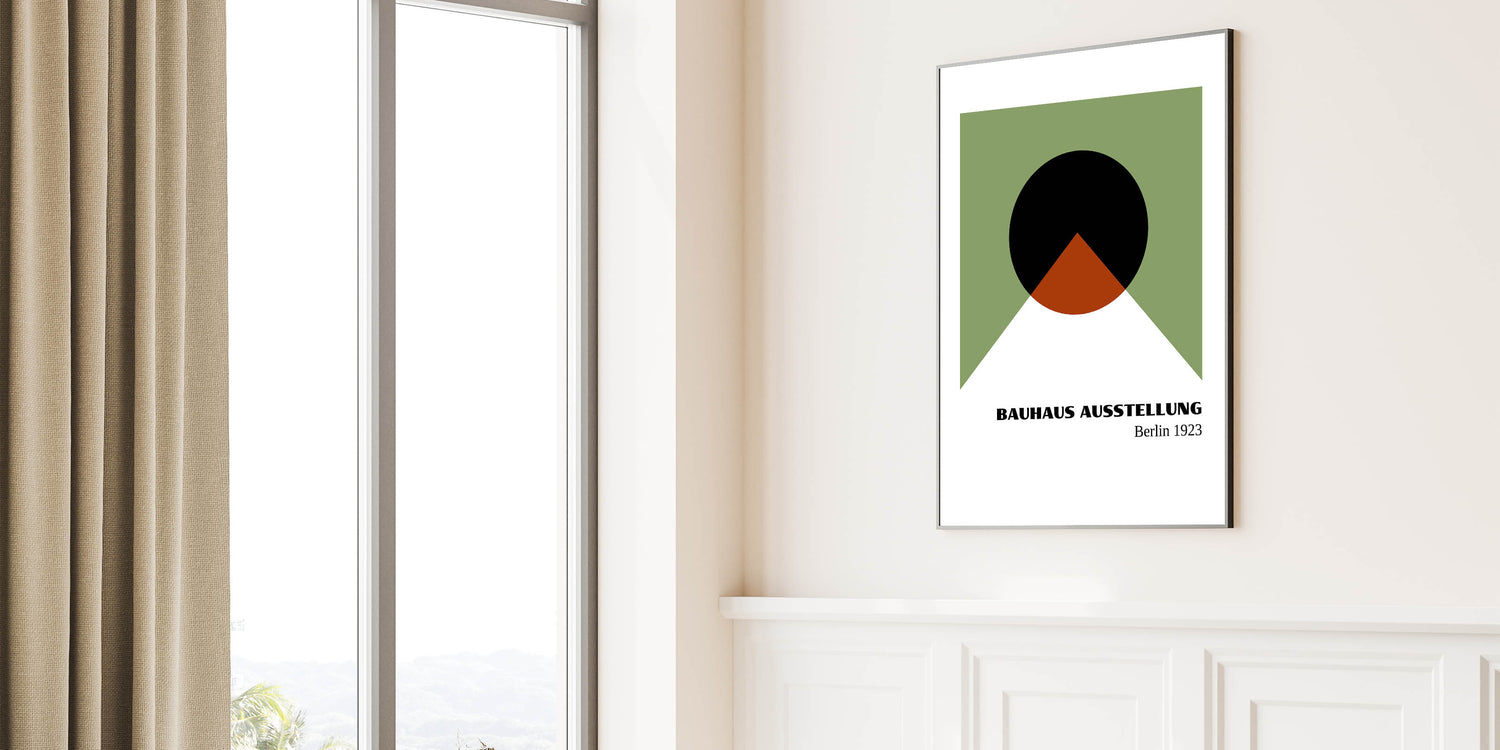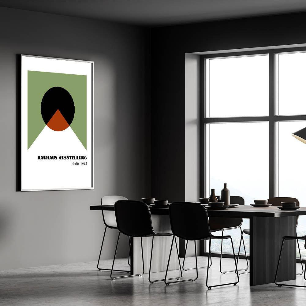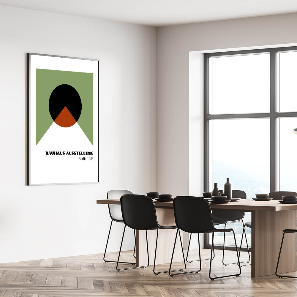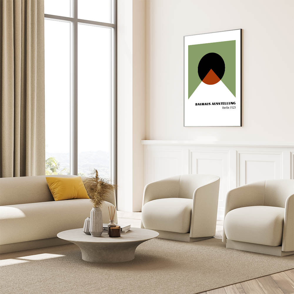 Bring a sense of modern artistry and historical charm to your home with this Bauhaus Berlin 1923-inspired geometric wall art. Featuring bold shapes and clean lines, the contrasting colors of sage green, black, and rust orange create a visually striking design. This artwork reflects the Bauhaus movement's focus on form and function while maintaining a minimalist aesthetic perfect for boho chic spaces.