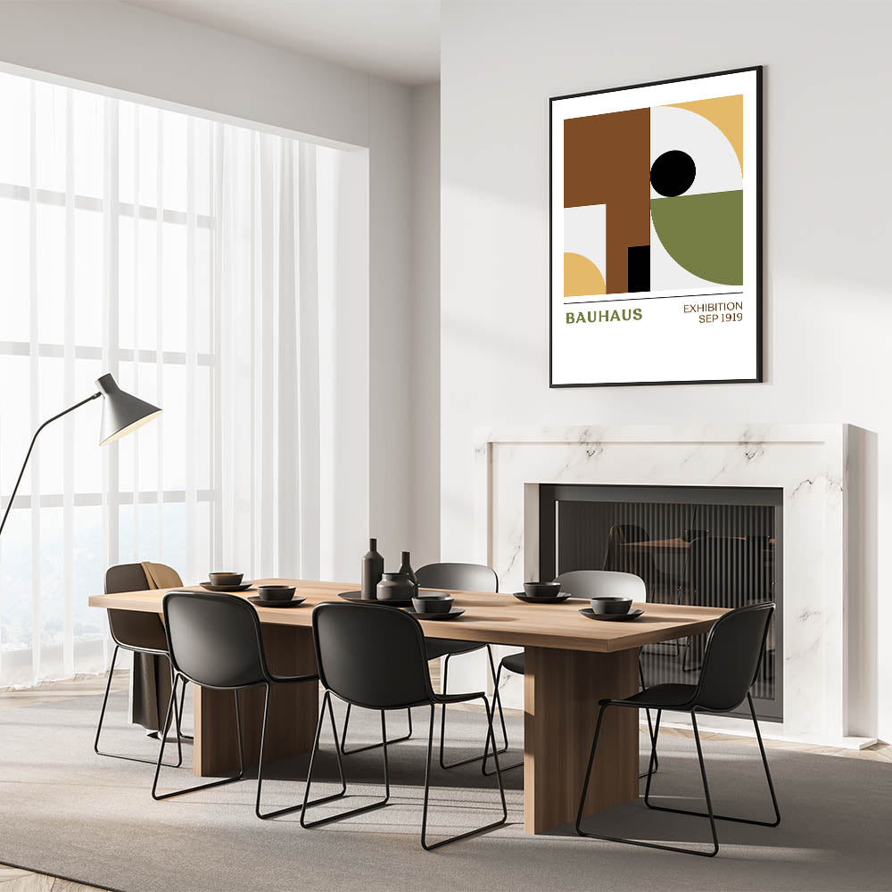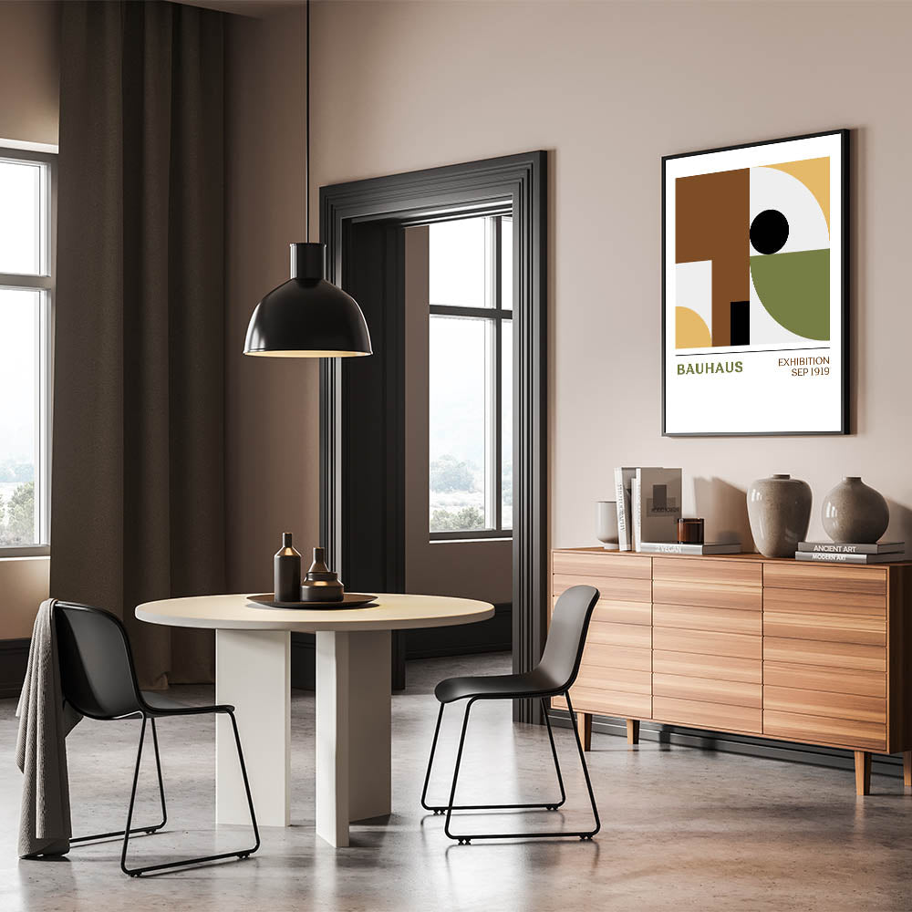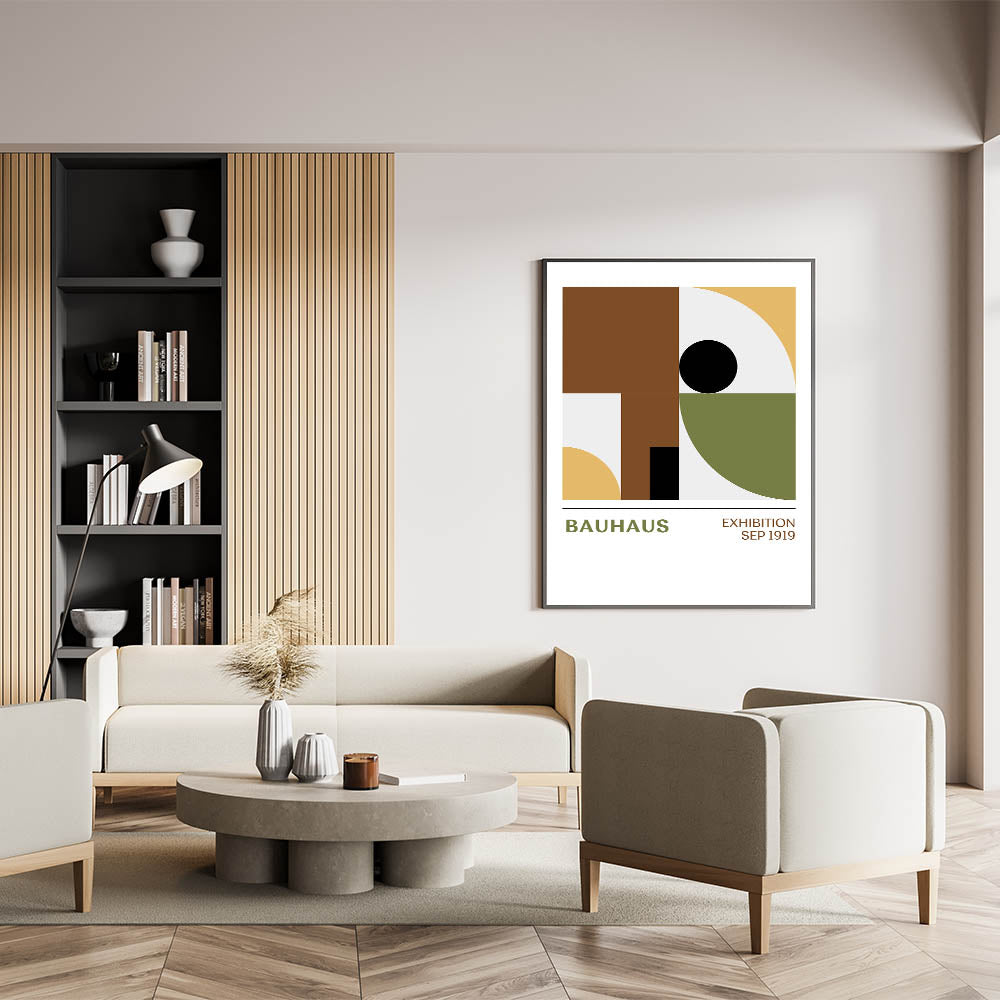 Elevate your living space with this unique bohemian artwork, featuring a bold Bauhaus geometric design that balances form and color. The minimalist pattern of circles, squares, and curves in shades of brown, mustard yellow, olive green, and black brings a sophisticated yet relaxed vibe to any room. This vibrant bohemian print is perfect for modern spaces, adding a chic and artistic element to your decor.