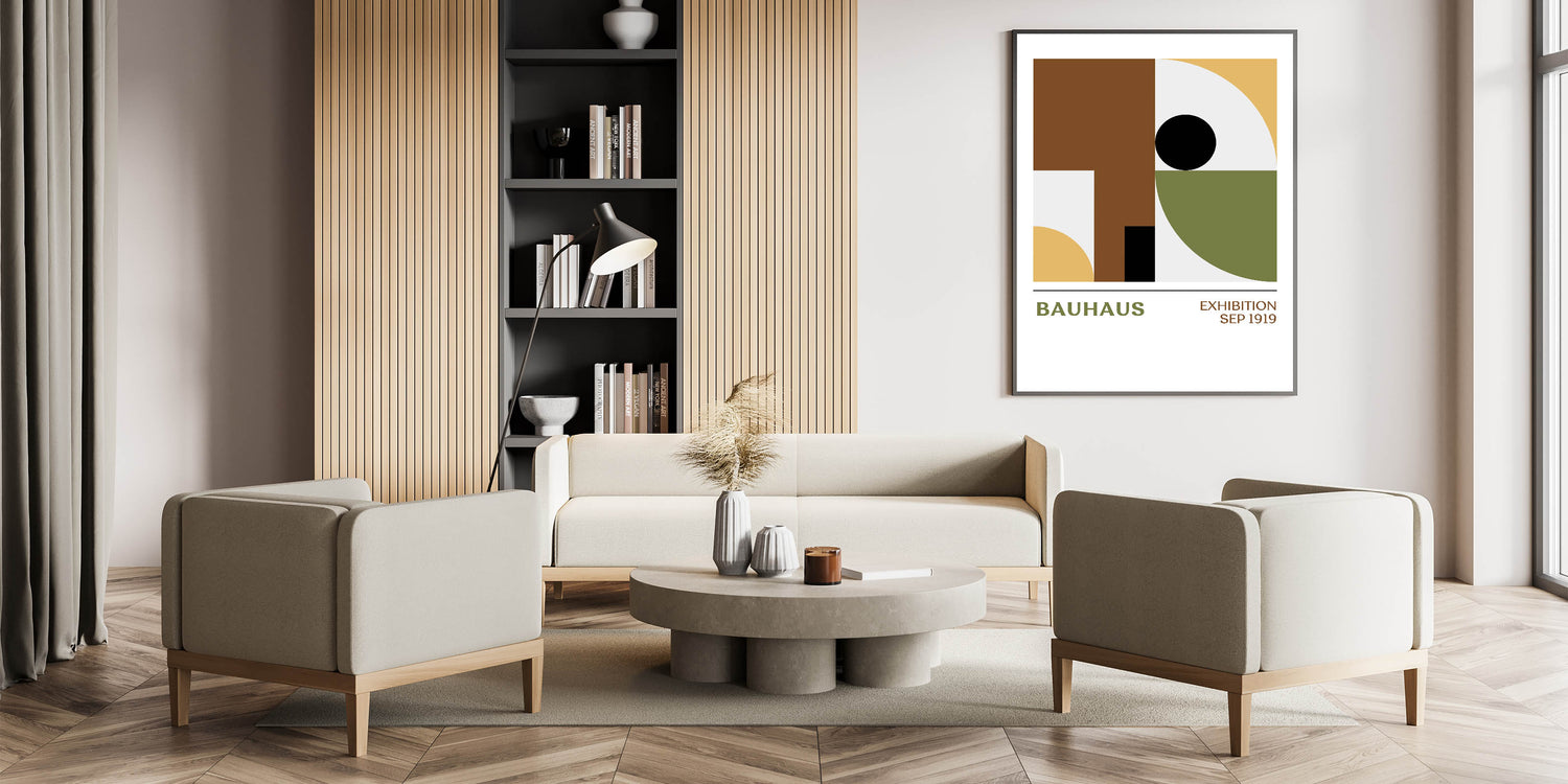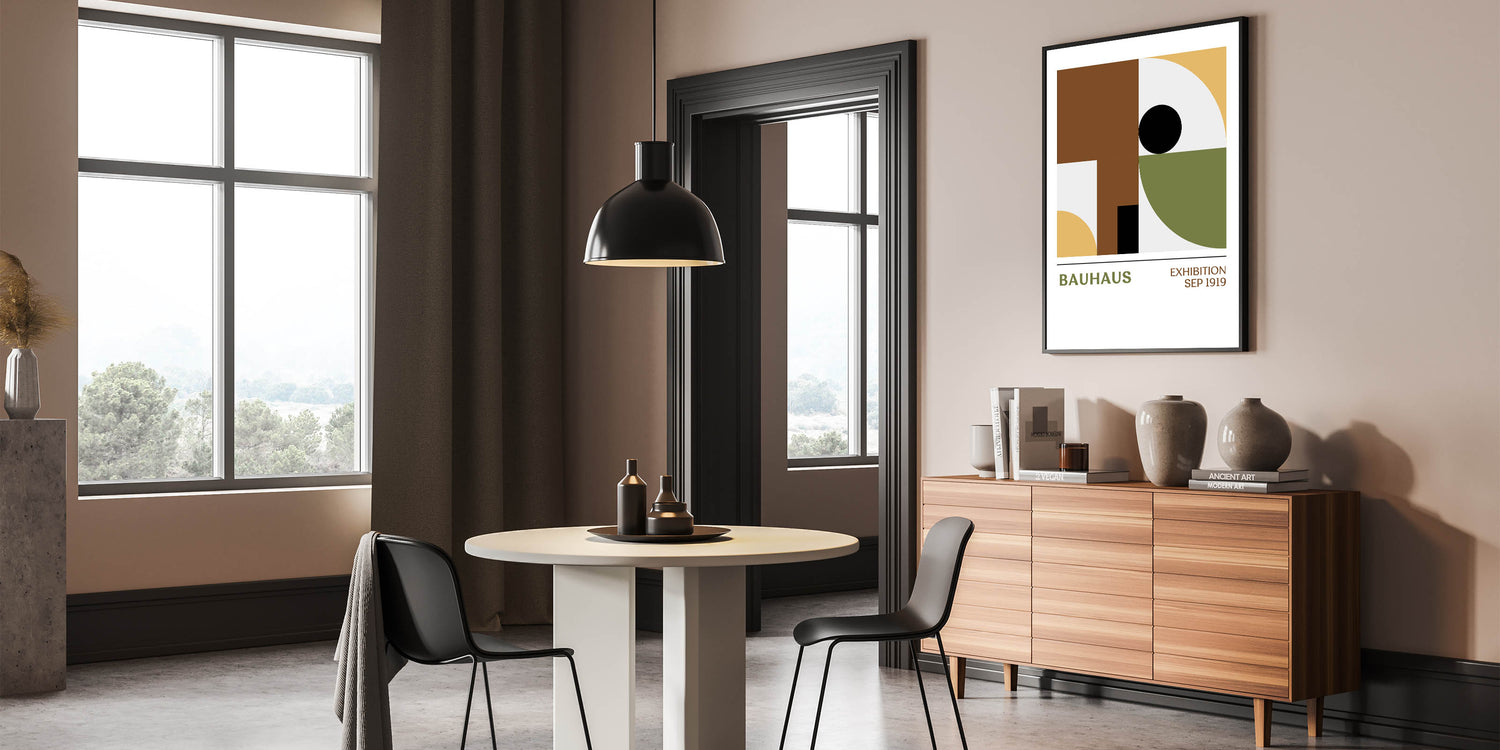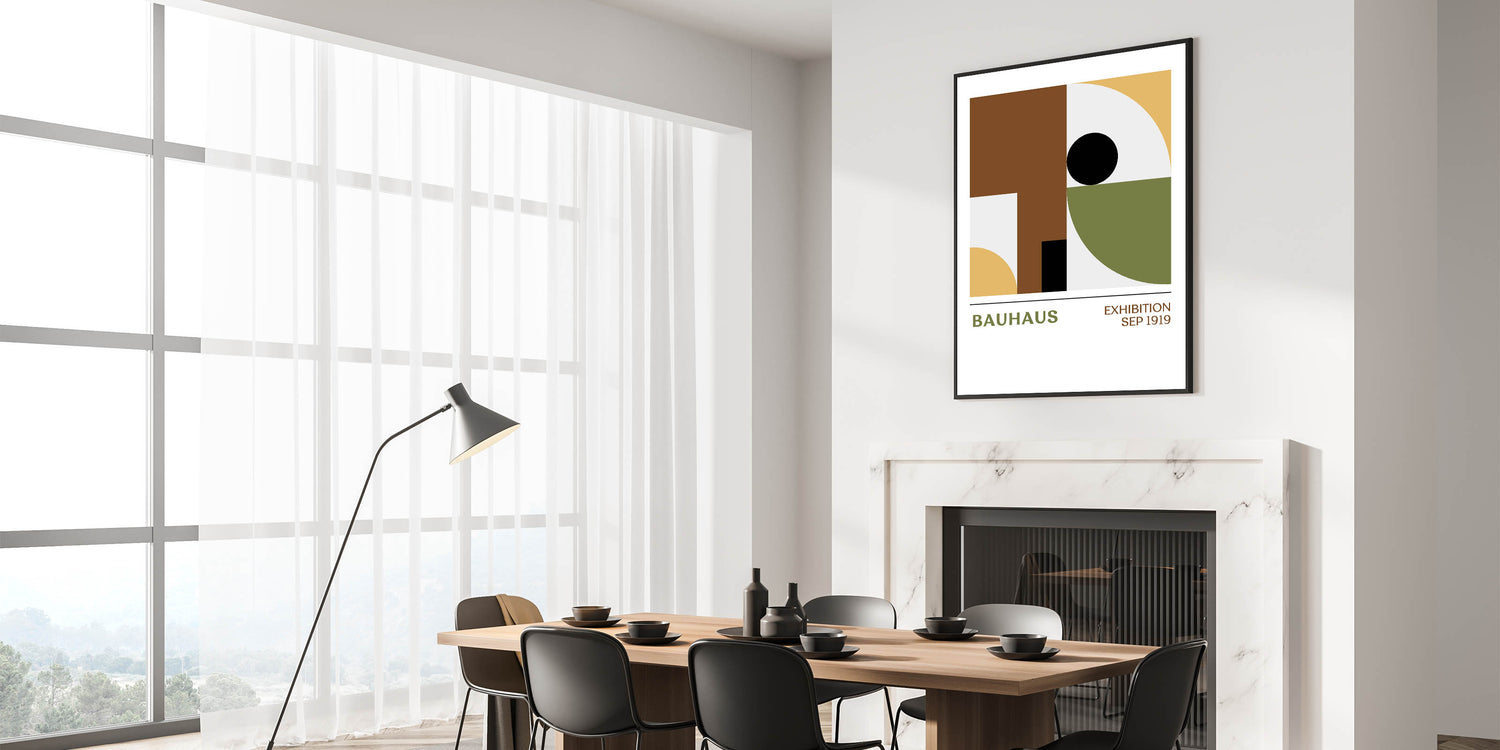 Elevate your living space with this unique bohemian artwork, featuring a bold Bauhaus geometric design that balances form and color. The minimalist pattern of circles, squares, and curves in shades of brown, mustard yellow, olive green, and black brings a sophisticated yet relaxed vibe to any room. This vibrant bohemian print is perfect for modern spaces, adding a chic and artistic element to your decor.