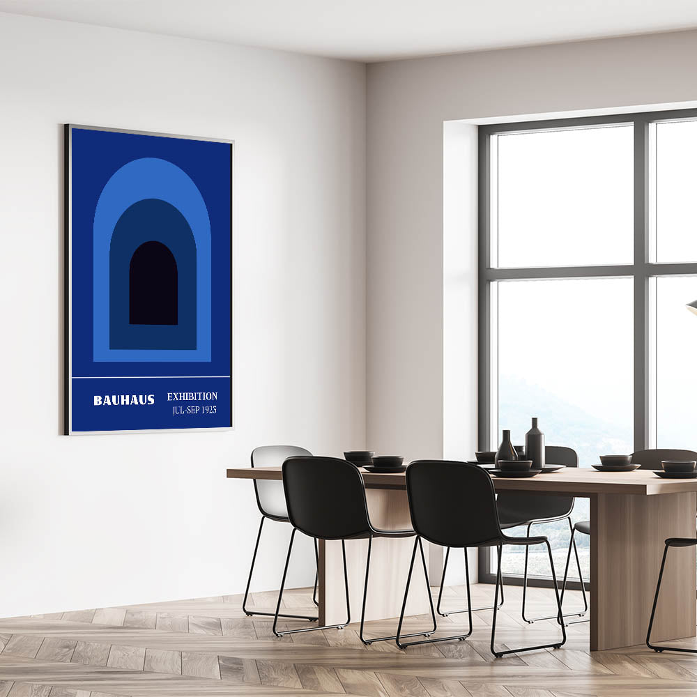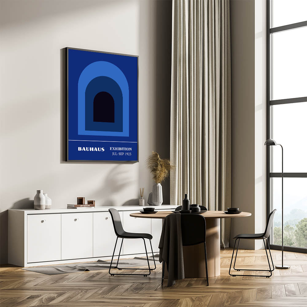 Add a touch of minimalist elegance to your space with this bohemian wall art, featuring bold, layered arch shapes inspired by the Bauhaus Exhibition Jul-Sep 1923. The gradient of blues from deep navy to light sky blue creates a calming visual experience, perfect for modern, bohemian, or minimalist interiors. This artistic bohemian-style canvas print adds depth and sophistication, making it an ideal focal point in any room, whether it’s your living room, bedroom, or office.