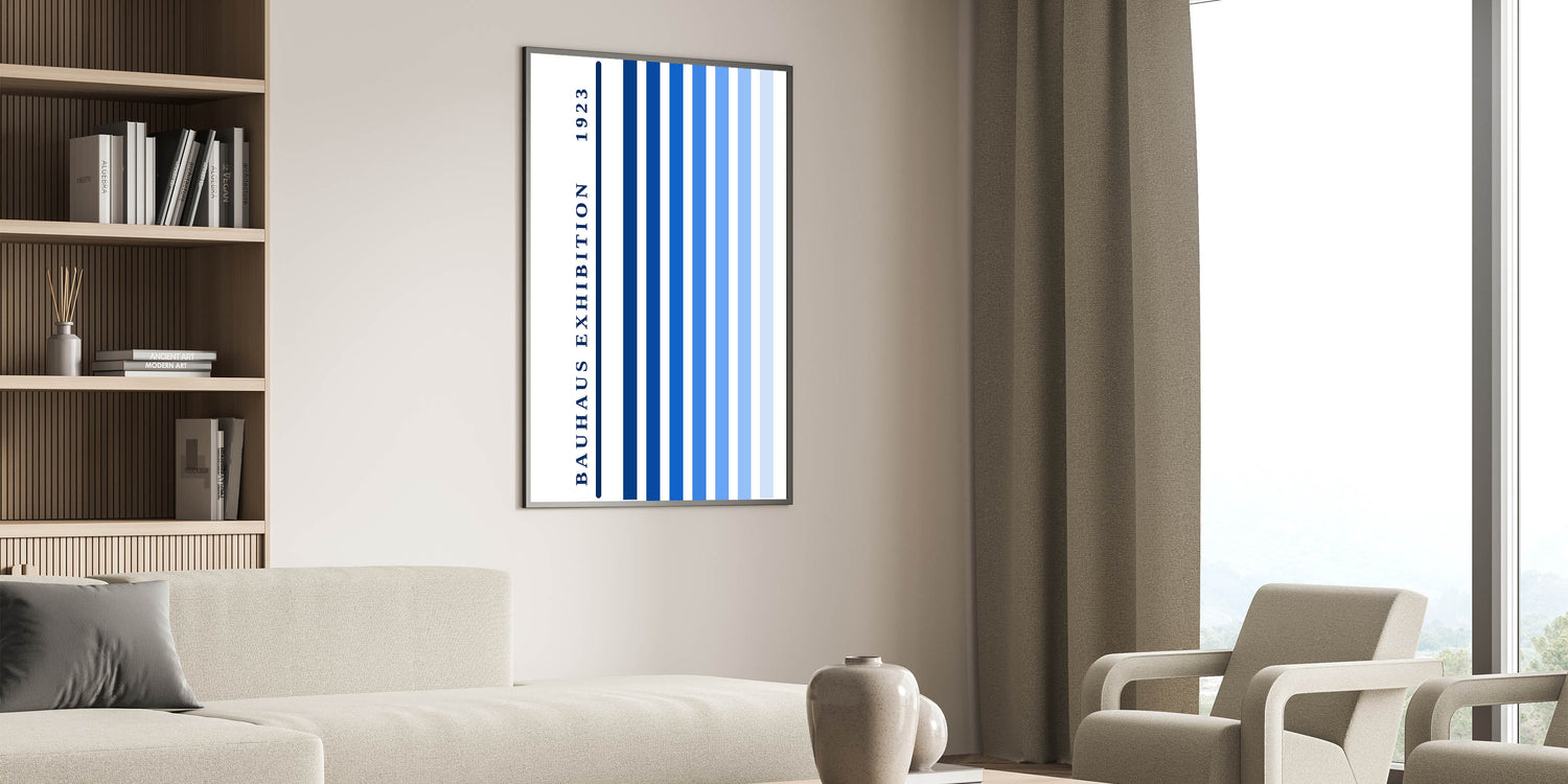 Elevate your home decor with this bohemian wall art, featuring a stunning striped design inspired by the Bauhaus Exhibition of 1923. The vertical stripes in shades of navy blue, royal blue, and light blue create a calming yet bold visual impact, making this eclectic boho wall art perfect for any modern or minimalist space. This artistic bohemian-style canvas print brings a clean and contemporary aesthetic that complements living rooms, bedrooms, and offices.