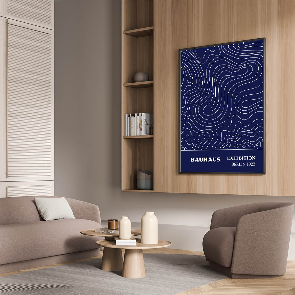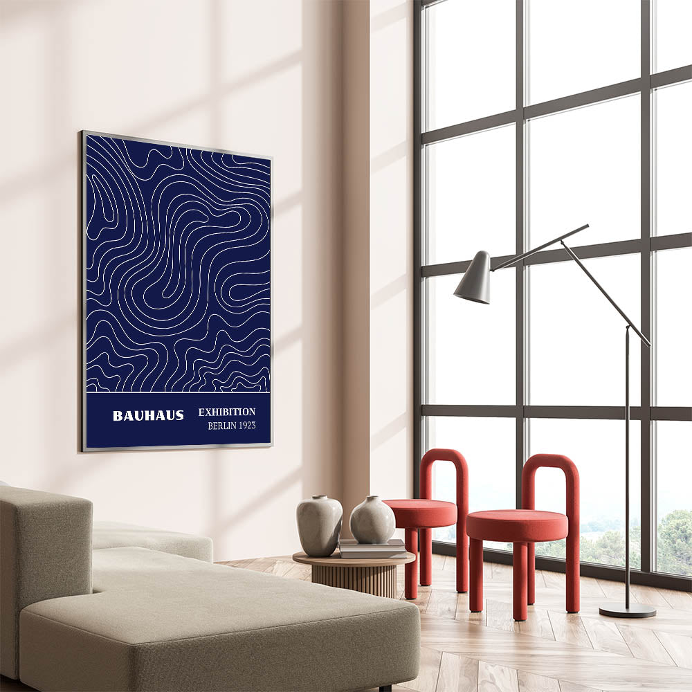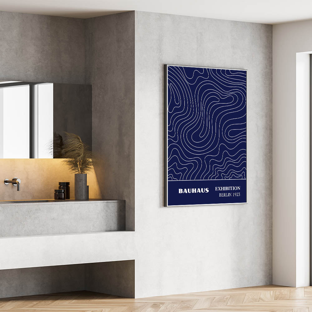 Introduce a sense of fluidity and rhythm to your space with this bohemian wall art, featuring intricate white lines flowing over a rich navy blue background, inspired by the Bauhaus Exhibition Berlin 1923. The organic, wavy lines create a sense of movement and depth, making this artwork perfect for modern, minimalist, or eclectic interiors. This artistic bohemian-style canvas print blends historical influence with contemporary design, offering a striking focal point for any room.