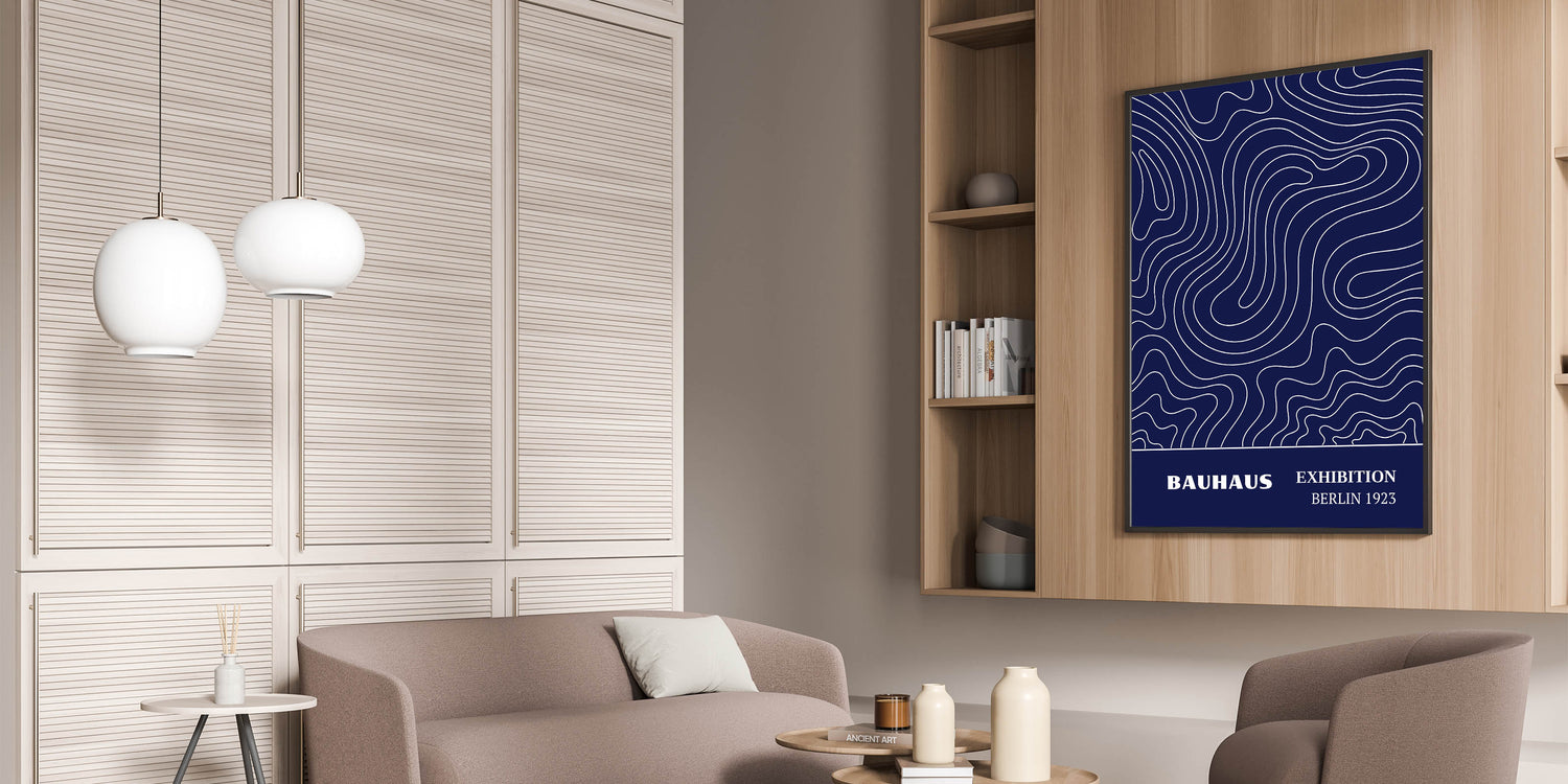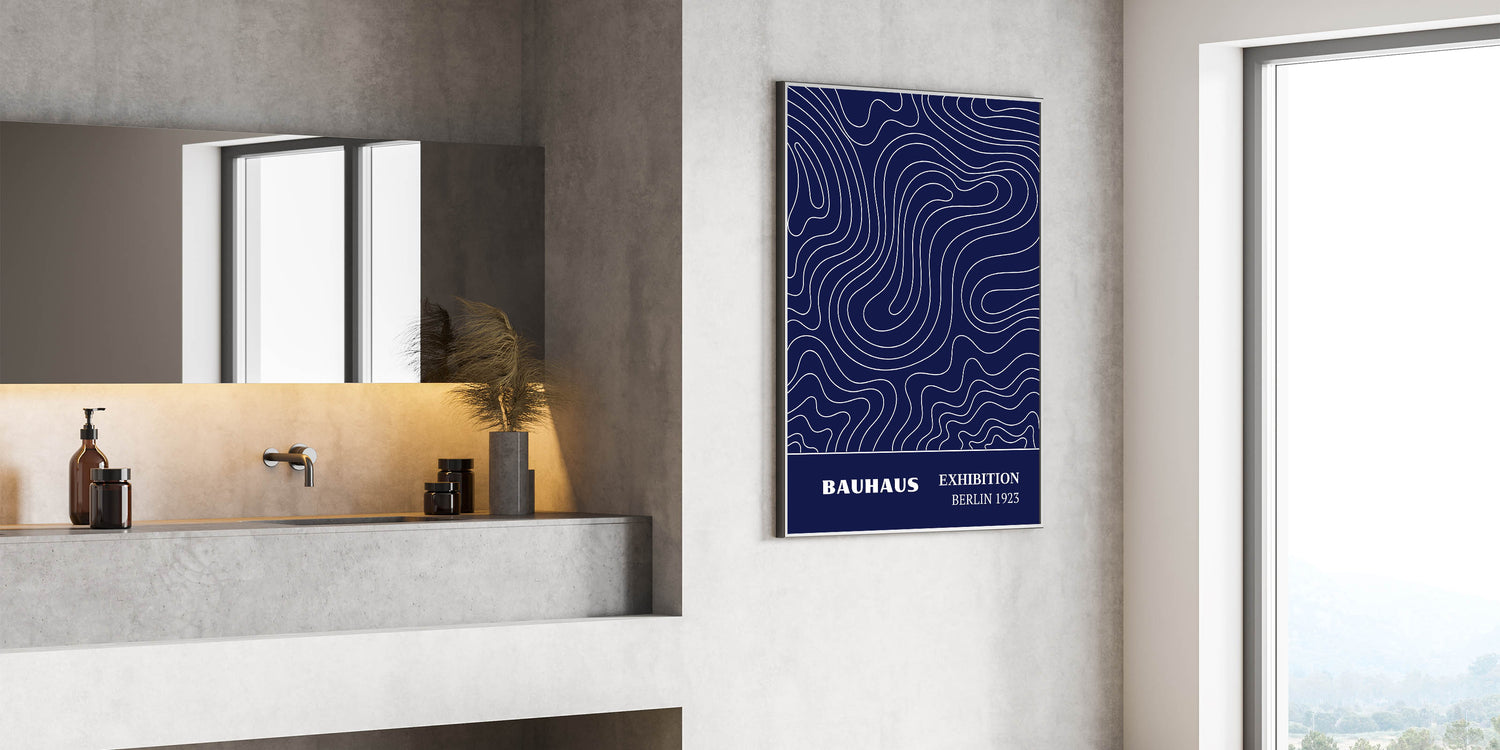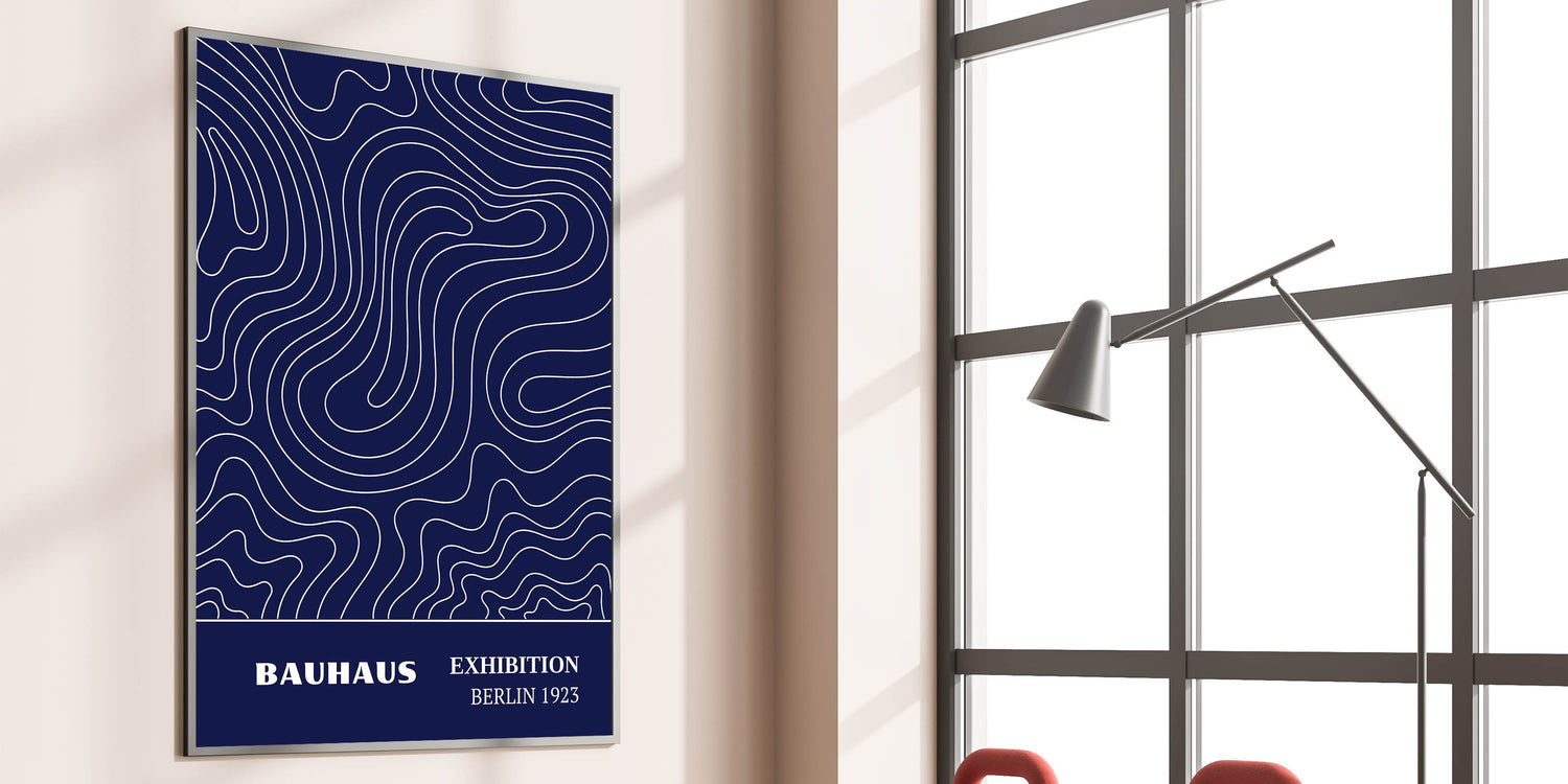 Introduce a sense of fluidity and rhythm to your space with this bohemian wall art, featuring intricate white lines flowing over a rich navy blue background, inspired by the Bauhaus Exhibition Berlin 1923. The organic, wavy lines create a sense of movement and depth, making this artwork perfect for modern, minimalist, or eclectic interiors. This artistic bohemian-style canvas print blends historical influence with contemporary design, offering a striking focal point for any room.
