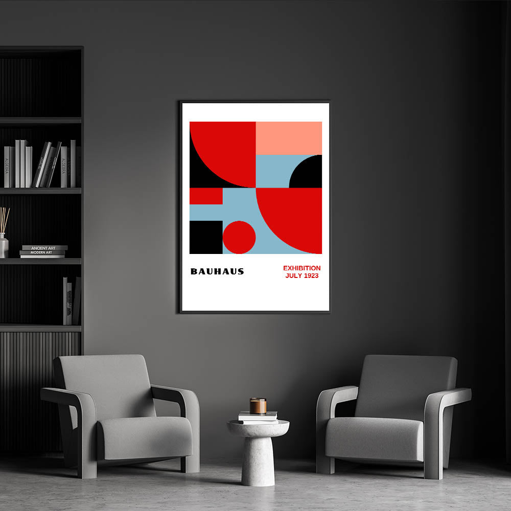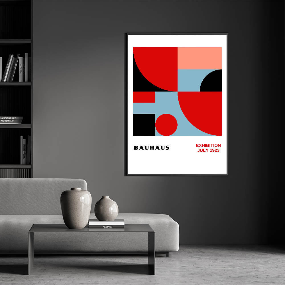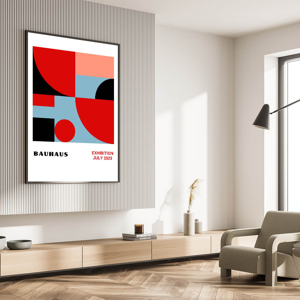 Transform your space with this bohemian wall art, showcasing a bold and geometric design inspired by the Bauhaus Exhibition of 1923. With its use of light blue, red, black, and peach, this piece brings a dynamic and eclectic boho wall art style to any room. Perfect for those who appreciate both historical and modern design elements, this vibrant bohemian print is ideal for living rooms, bedrooms, and creative workspaces.