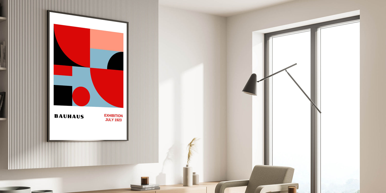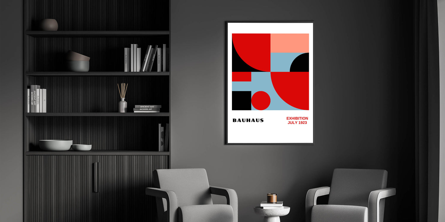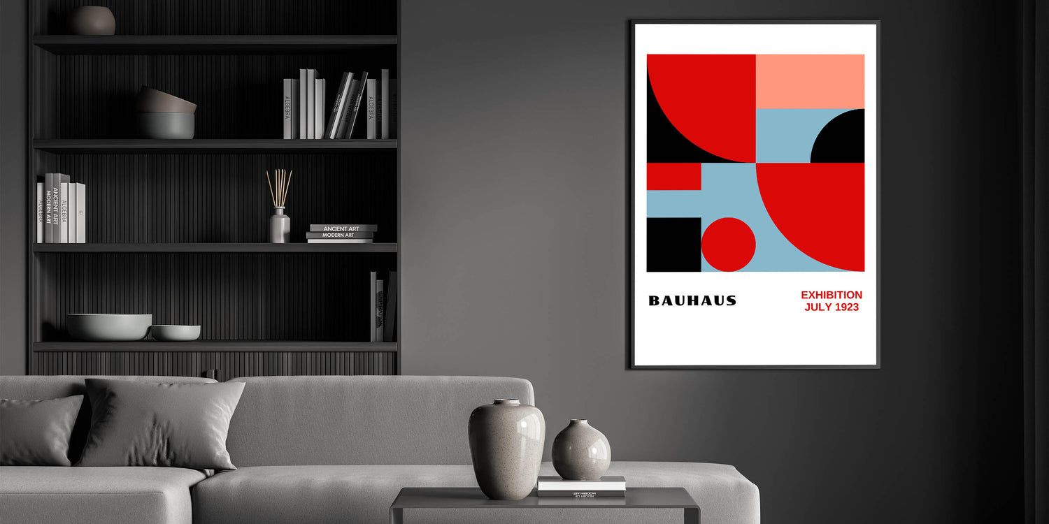 Transform your space with this bohemian wall art, showcasing a bold and geometric design inspired by the Bauhaus Exhibition of 1923. With its use of light blue, red, black, and peach, this piece brings a dynamic and eclectic boho wall art style to any room. Perfect for those who appreciate both historical and modern design elements, this vibrant bohemian print is ideal for living rooms, bedrooms, and creative workspaces.