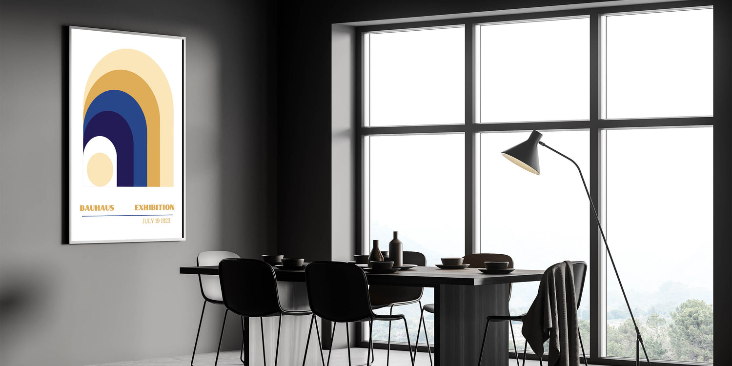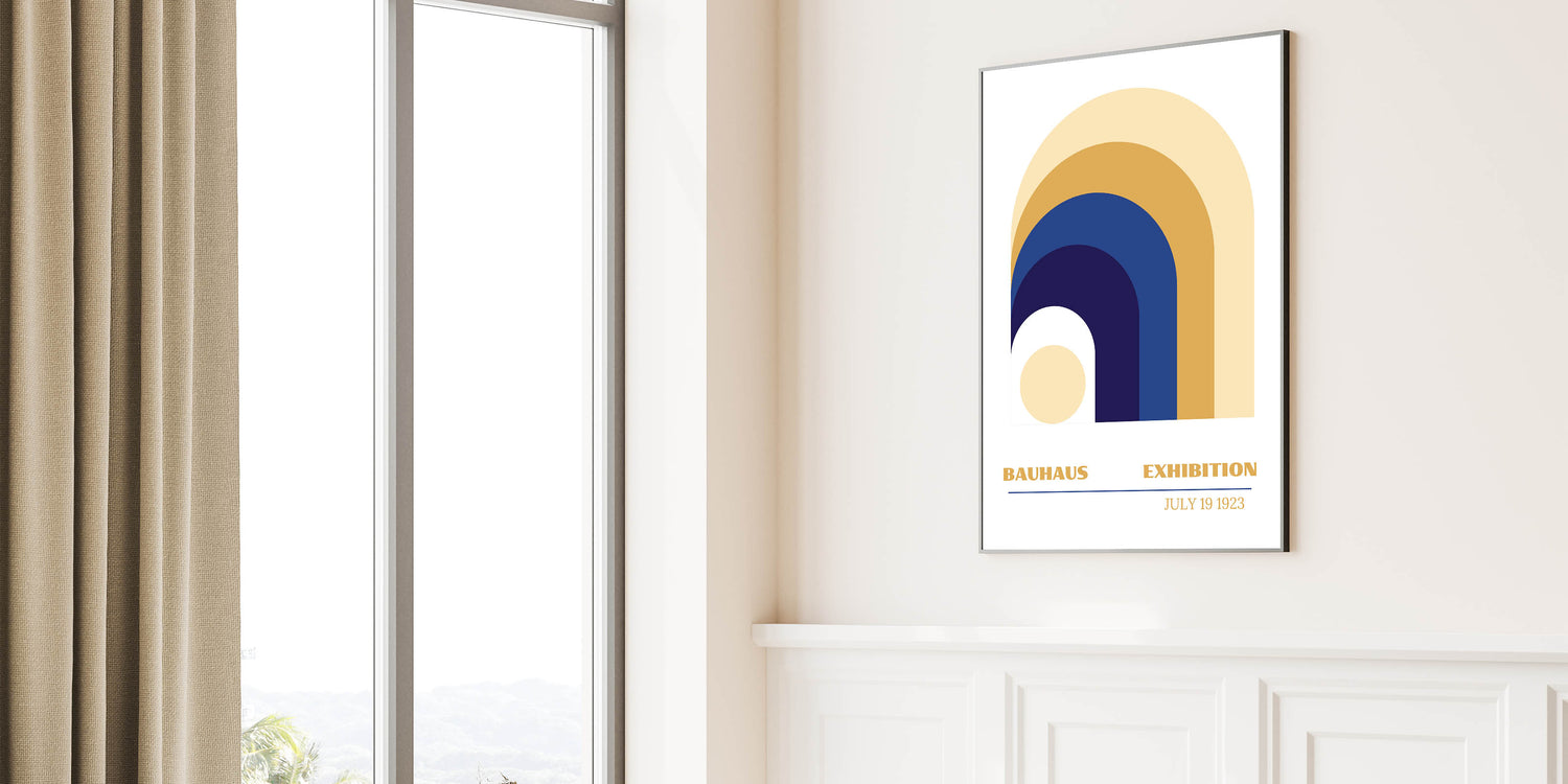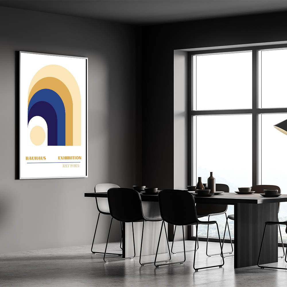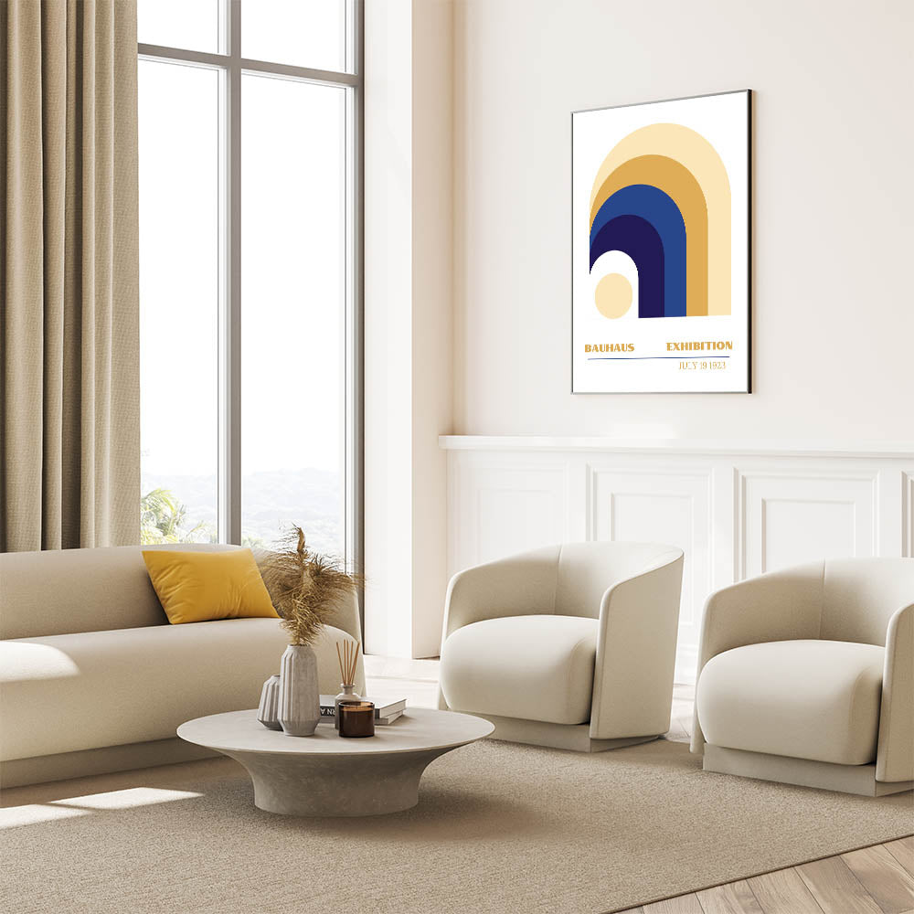 Celebrate a piece of art history with this unique Bohemian artwork for modern spaces. Inspired by the Bauhaus Exhibition of 1923, this retro-styled print features layered arches in deep navy blue, warm gold, and soft beige, creating a striking yet balanced composition. This vibrant Bohemian print for home decor is perfect for adding a retro, eclectic vibe to your living space while paying homage to the timeless Bauhaus aesthetic.