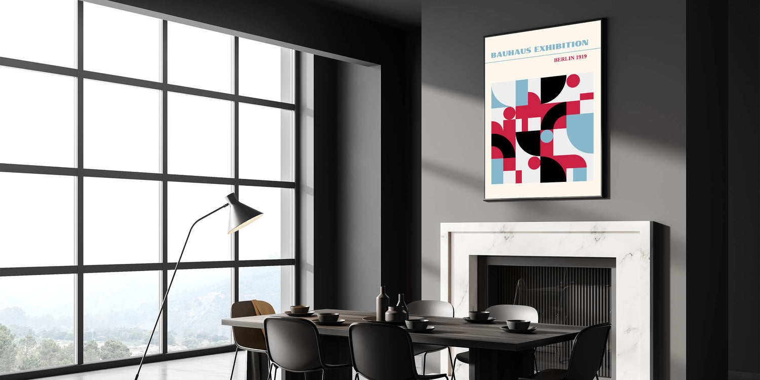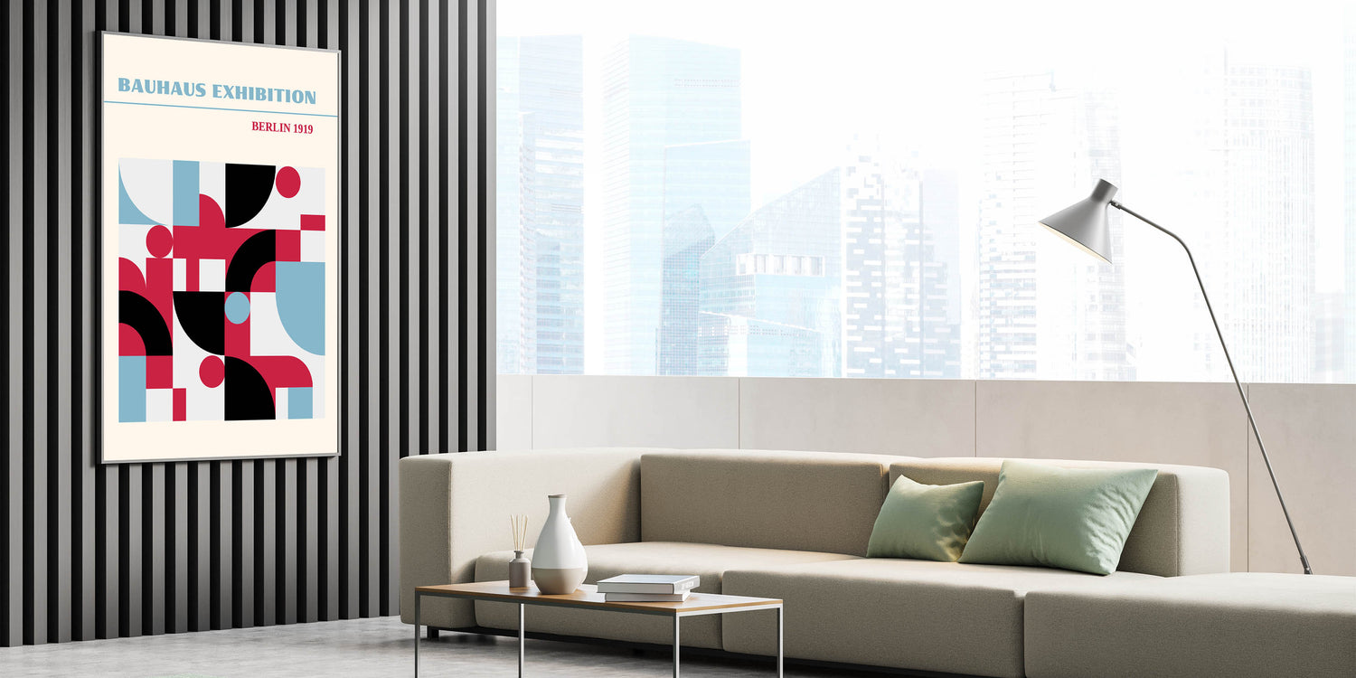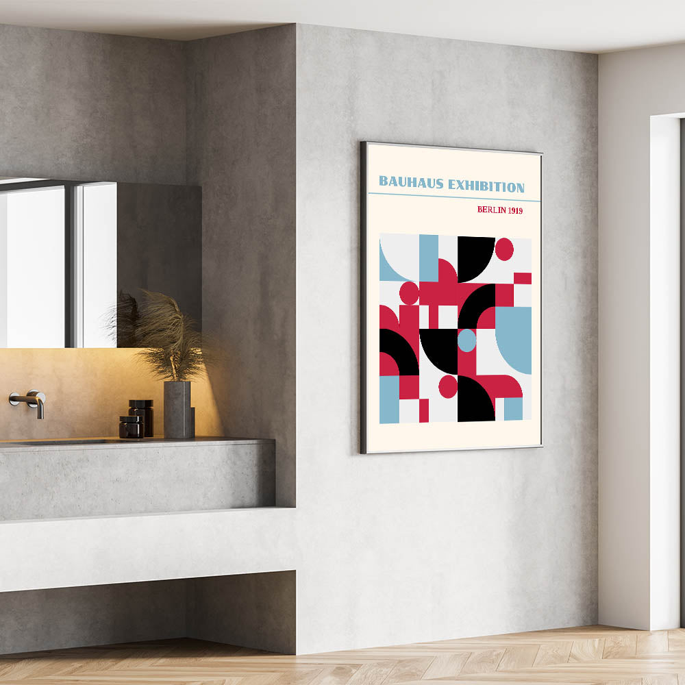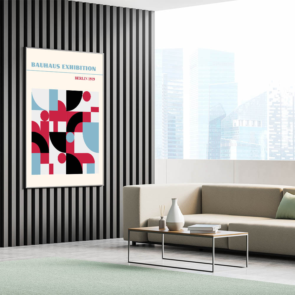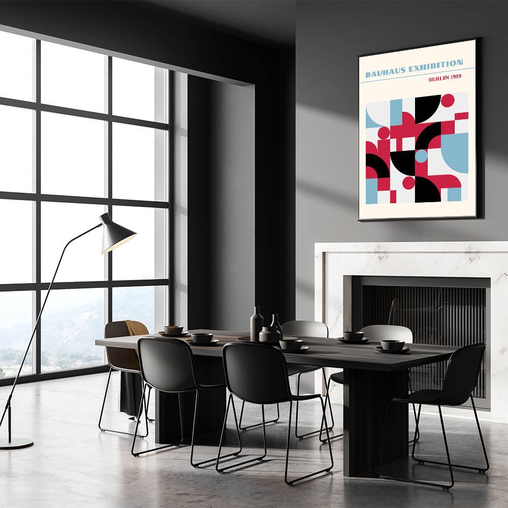 Transform your space with this stunning bohemian wall art, featuring a bold and dynamic geometric pattern inspired by the Bauhaus Exhibition of Berlin, 1919. The combination of red, black, and light blue shapes creates a striking contrast, making this piece perfect for modern and eclectic interiors. This artistic bohemian-style canvas print is ideal for those looking to add a creative and historical element to their home decor.