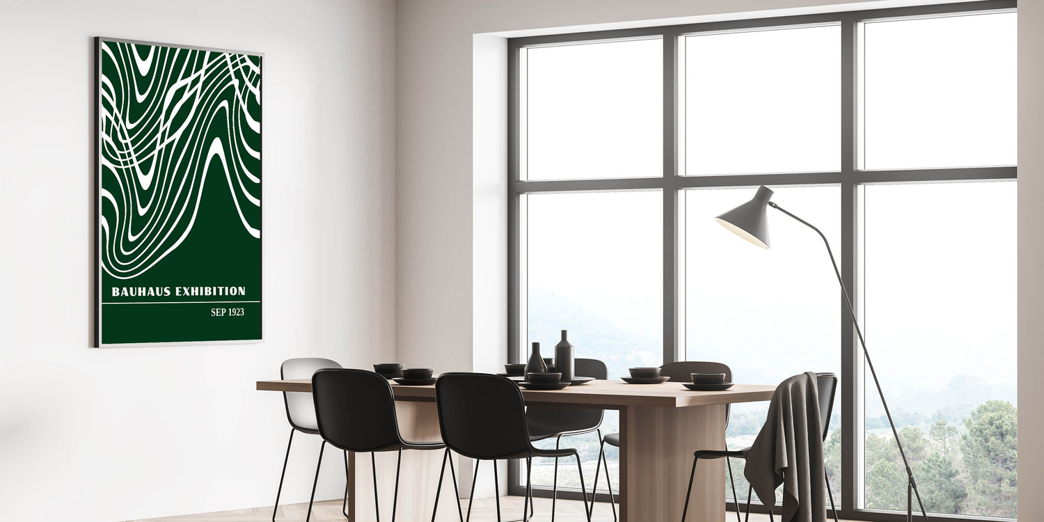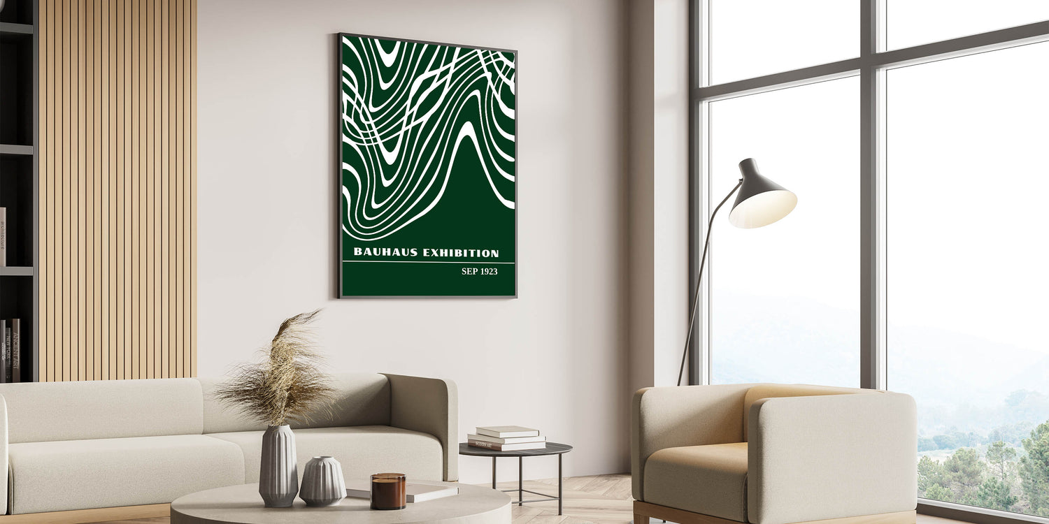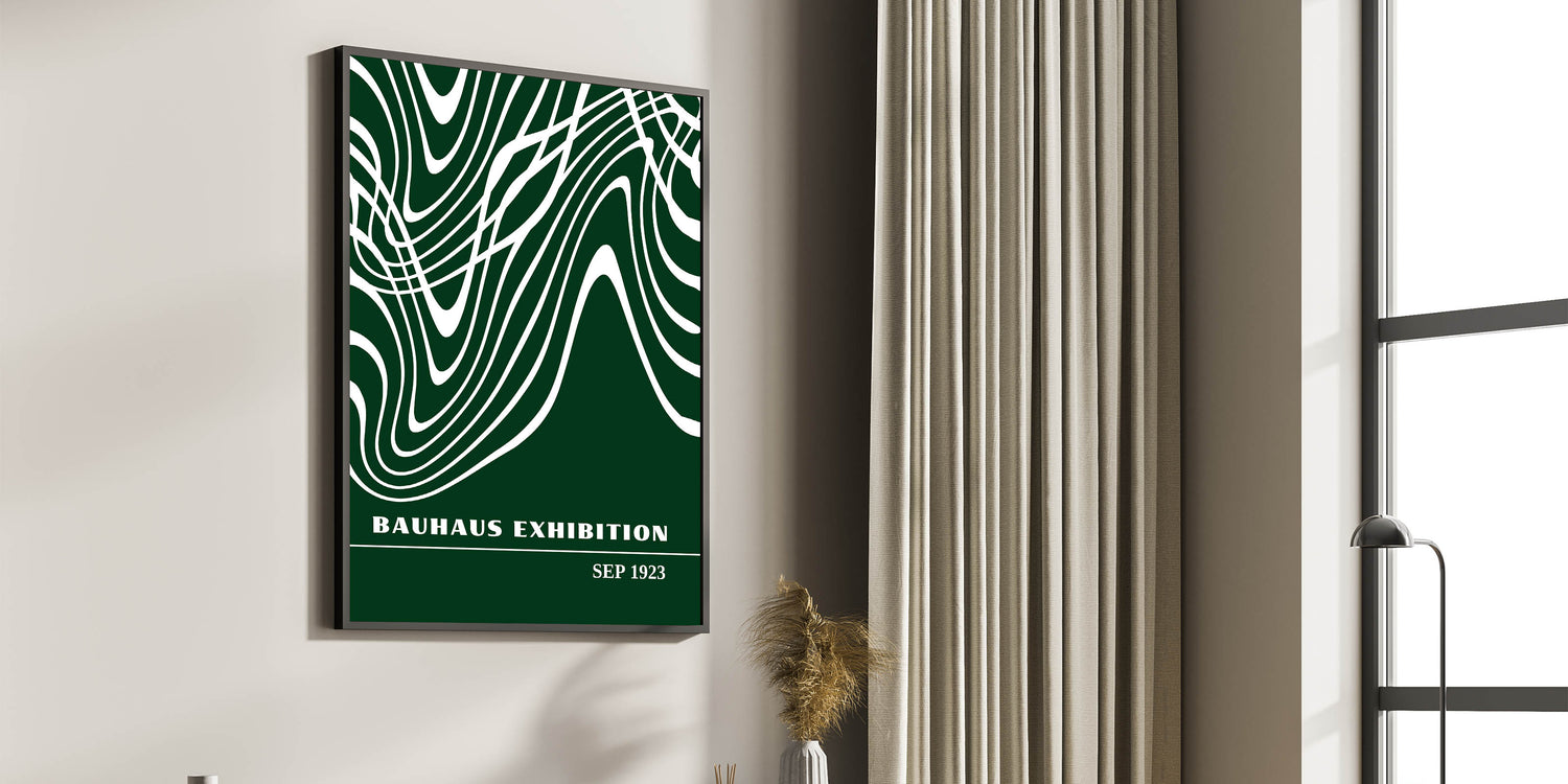 Bring a piece of Bauhaus history into your home with this vibrant and dynamic wall art inspired by the 1923 Bauhaus Exhibition. With sweeping, abstract white lines set against a deep forest green background, this boho wall decor adds an artistic flair to any space, blending bohemian chic with modern design.
