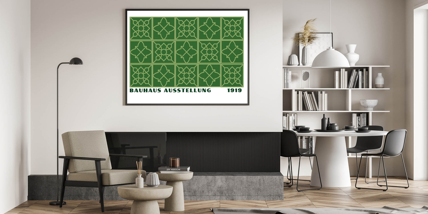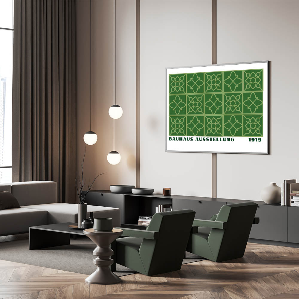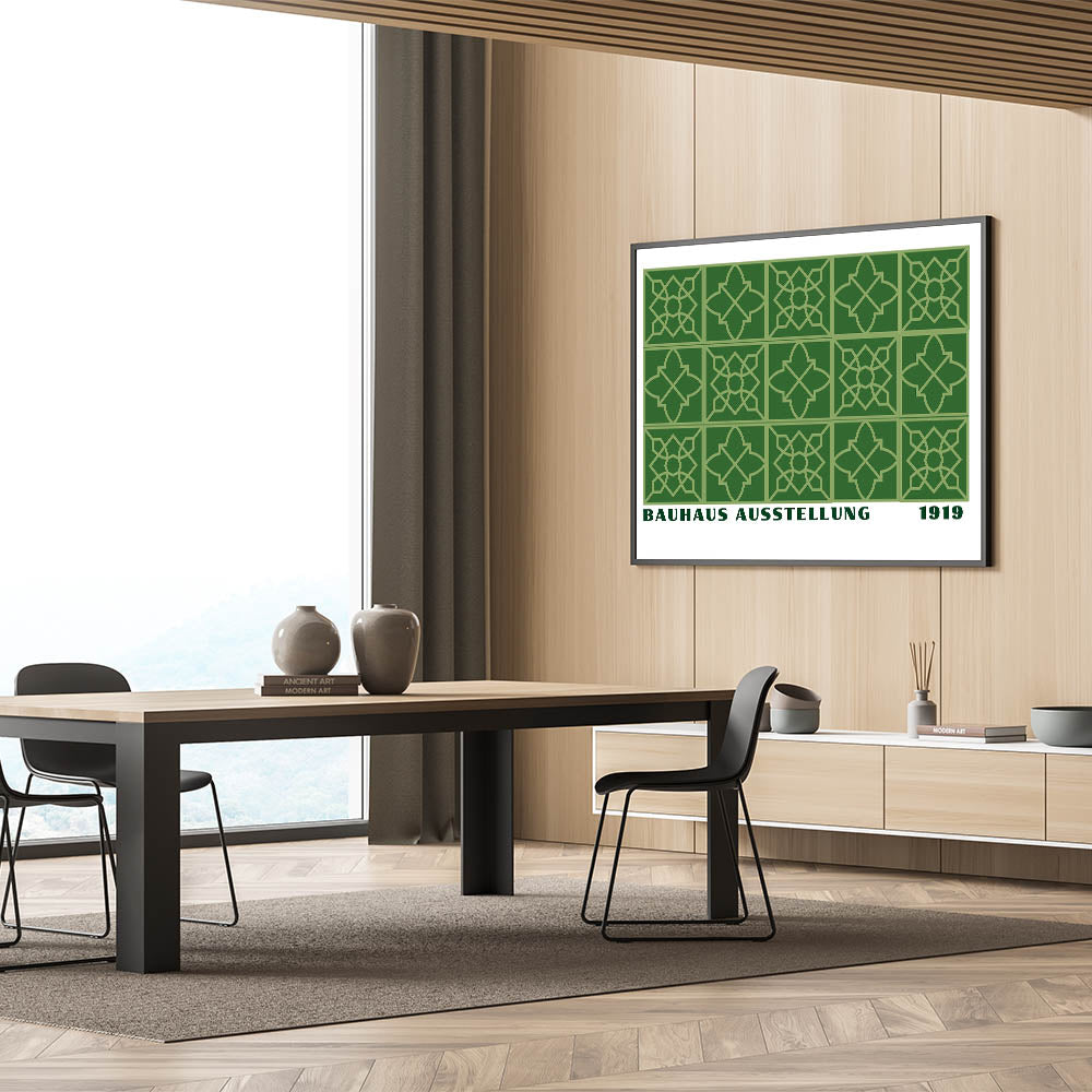 Celebrate the essence of geometric precision with this striking Bohemian wall art inspired by Bauhaus design. Featuring a captivating grid of interlocking geometric patterns, this artwork brings a sense of order and structure to any space. The deep green tones contrast beautifully with the intricate shapes, making it a standout piece in modern, eclectic, and boho interiors alike. Perfect for living rooms, offices, or creative spaces, this boho-inspired art print infuses your decor with a touch of history and artistic elegance.