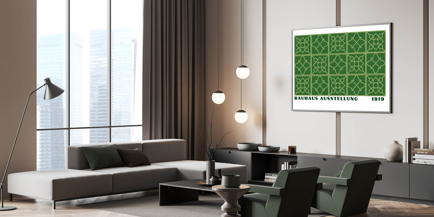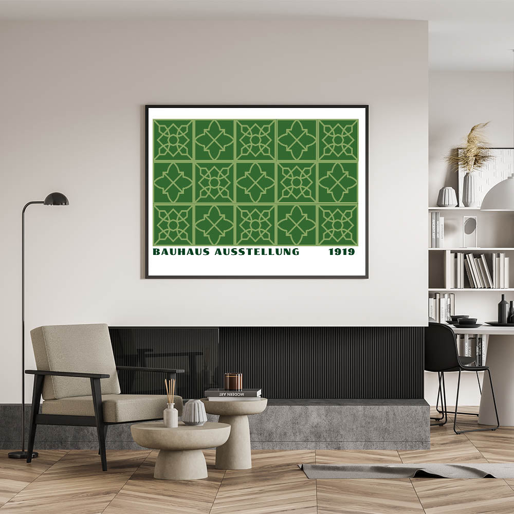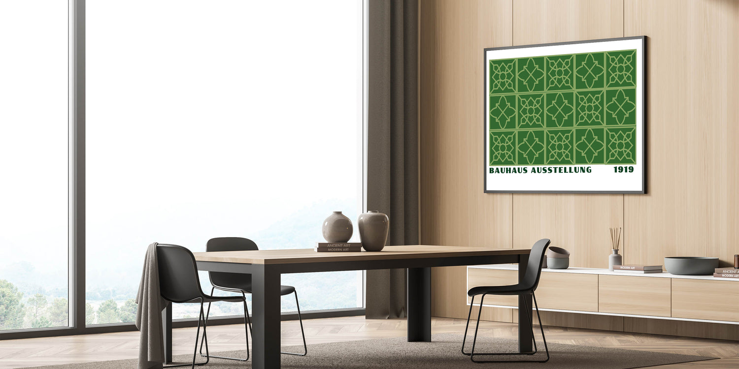 Celebrate the essence of geometric precision with this striking Bohemian wall art inspired by Bauhaus design. Featuring a captivating grid of interlocking geometric patterns, this artwork brings a sense of order and structure to any space. The deep green tones contrast beautifully with the intricate shapes, making it a standout piece in modern, eclectic, and boho interiors alike. Perfect for living rooms, offices, or creative spaces, this boho-inspired art print infuses your decor with a touch of history and artistic elegance.
