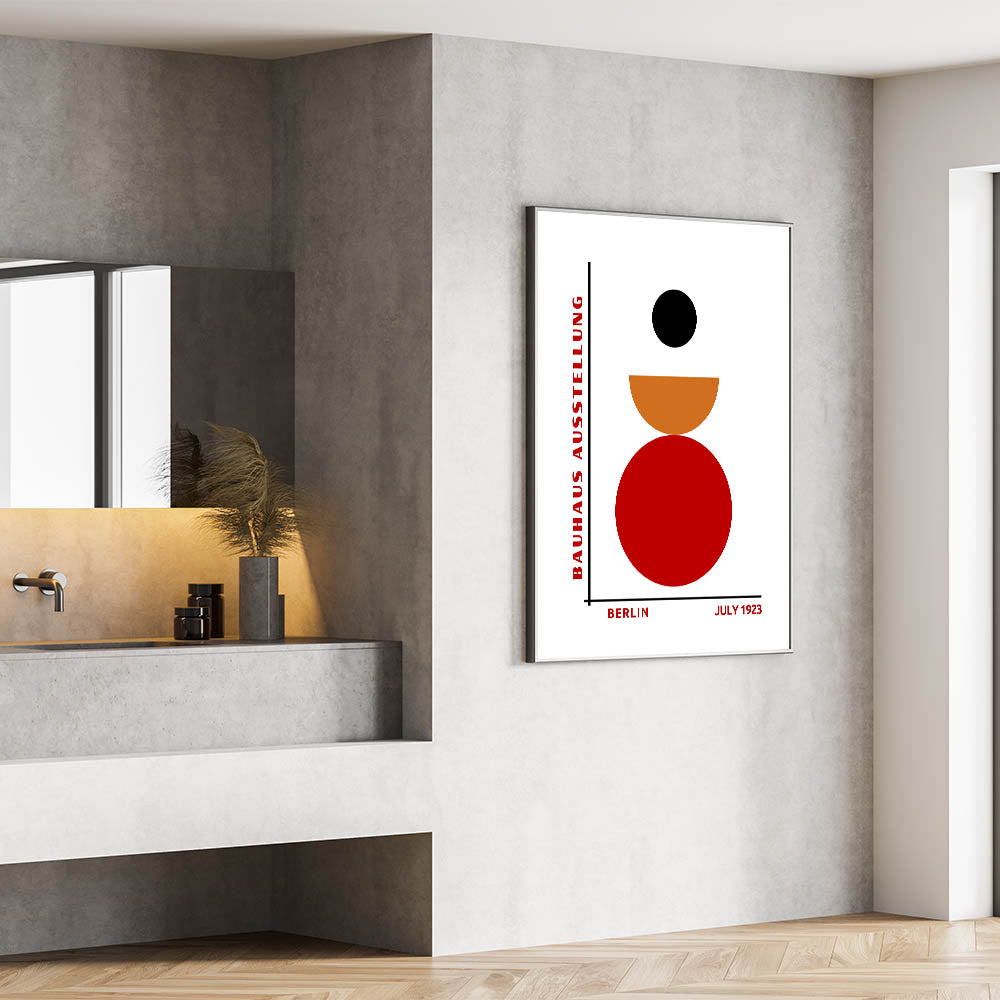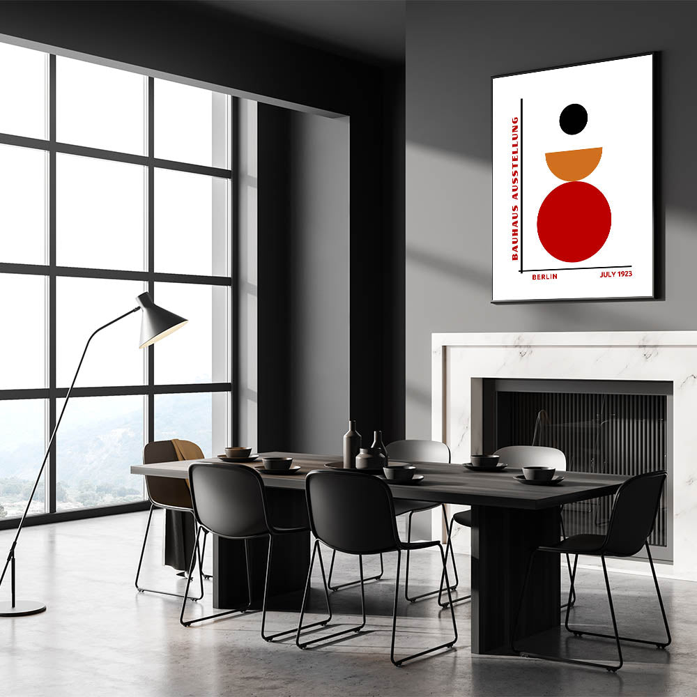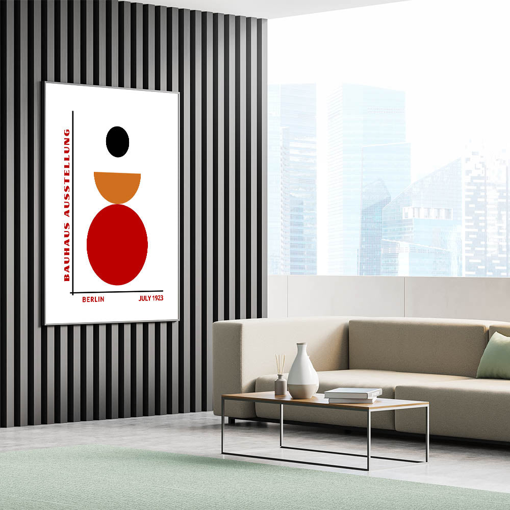 Product Description (175-225 words): Transform your living space with this unique bohemian artwork for modern spaces inspired by the Bauhaus movement. Featuring a striking combination of geometric shapes in bold black, orange, and red, this design brings together a vibrant and minimalist aesthetic. Perfect for those who appreciate eclectic boho wall art that adds a touch of artistic flair to any interior, this piece is available in various high-quality materials, including stretched canvas, framed canvas, acrylic glass, and more.