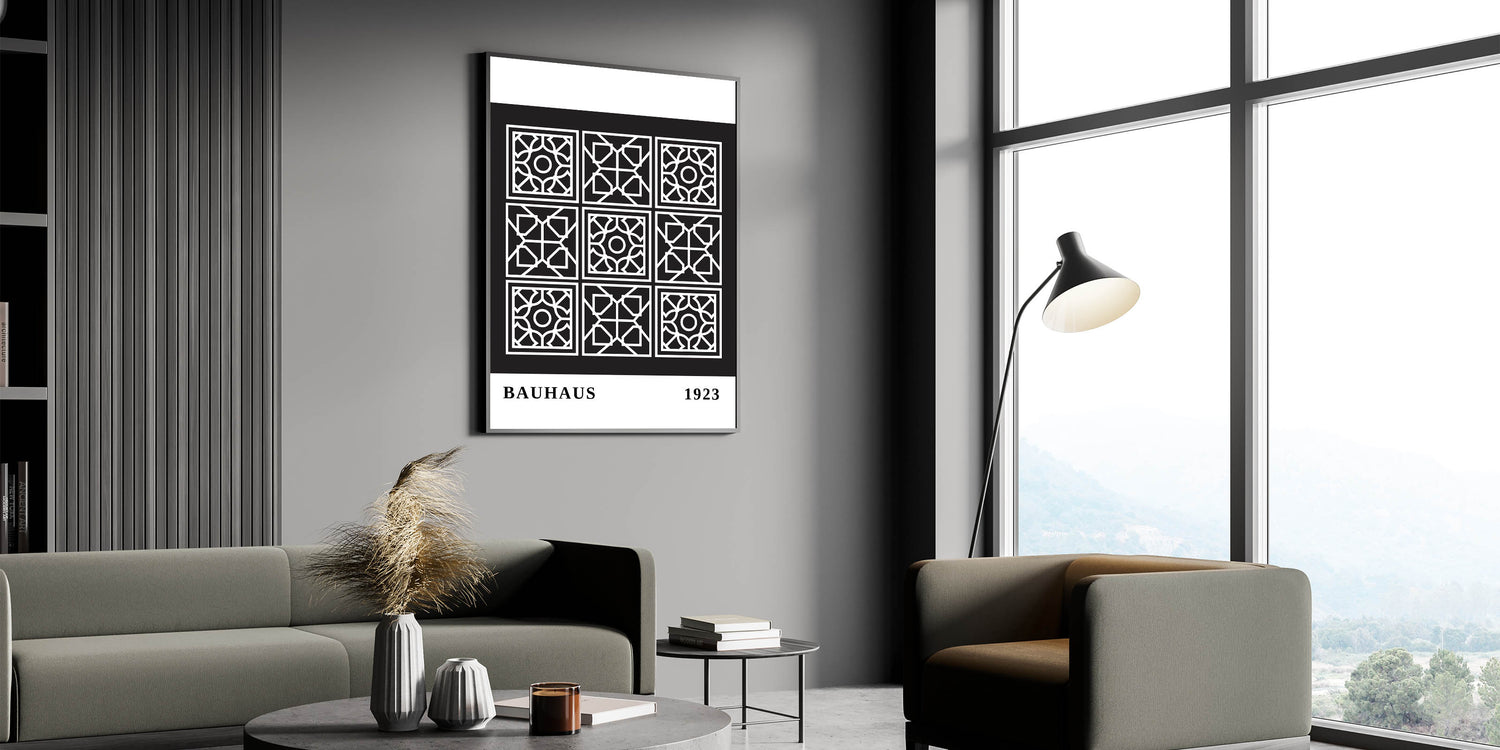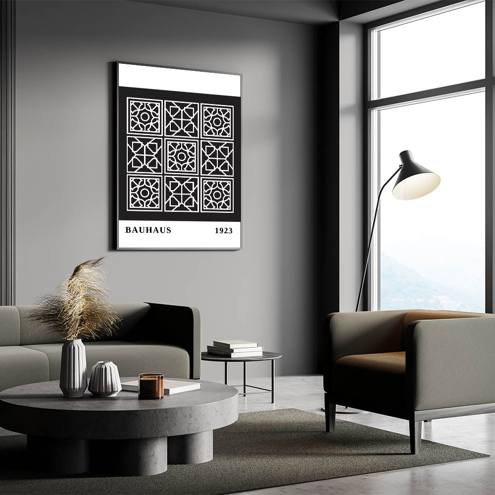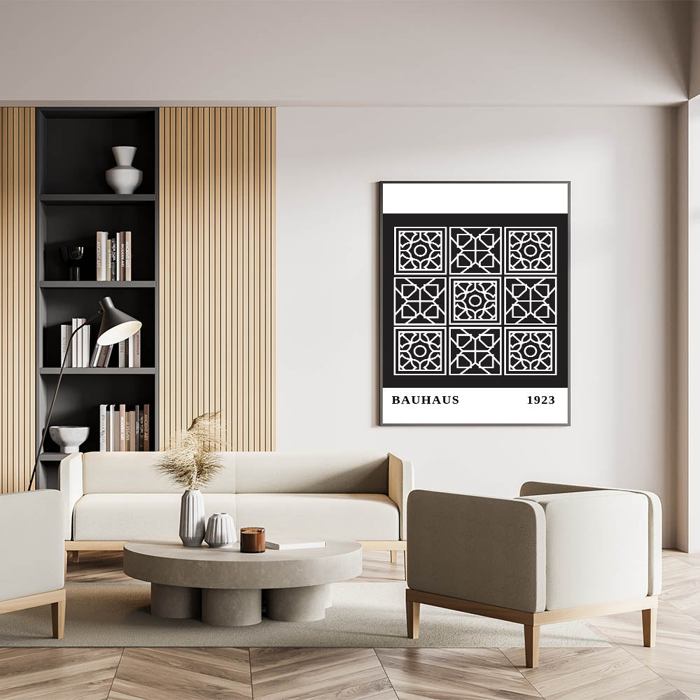 This Bauhaus-inspired wall art showcases a captivating geometric grid, featuring intricate, symmetrical patterns in black and white. The bold grid design adds both structure and elegance to any modern, boho, or eclectic space. With its strong, detailed lines and high-contrast palette, this artwork serves as a striking focal point for living rooms, offices, or creative spaces, blending minimalist geometry with artistic detail.
