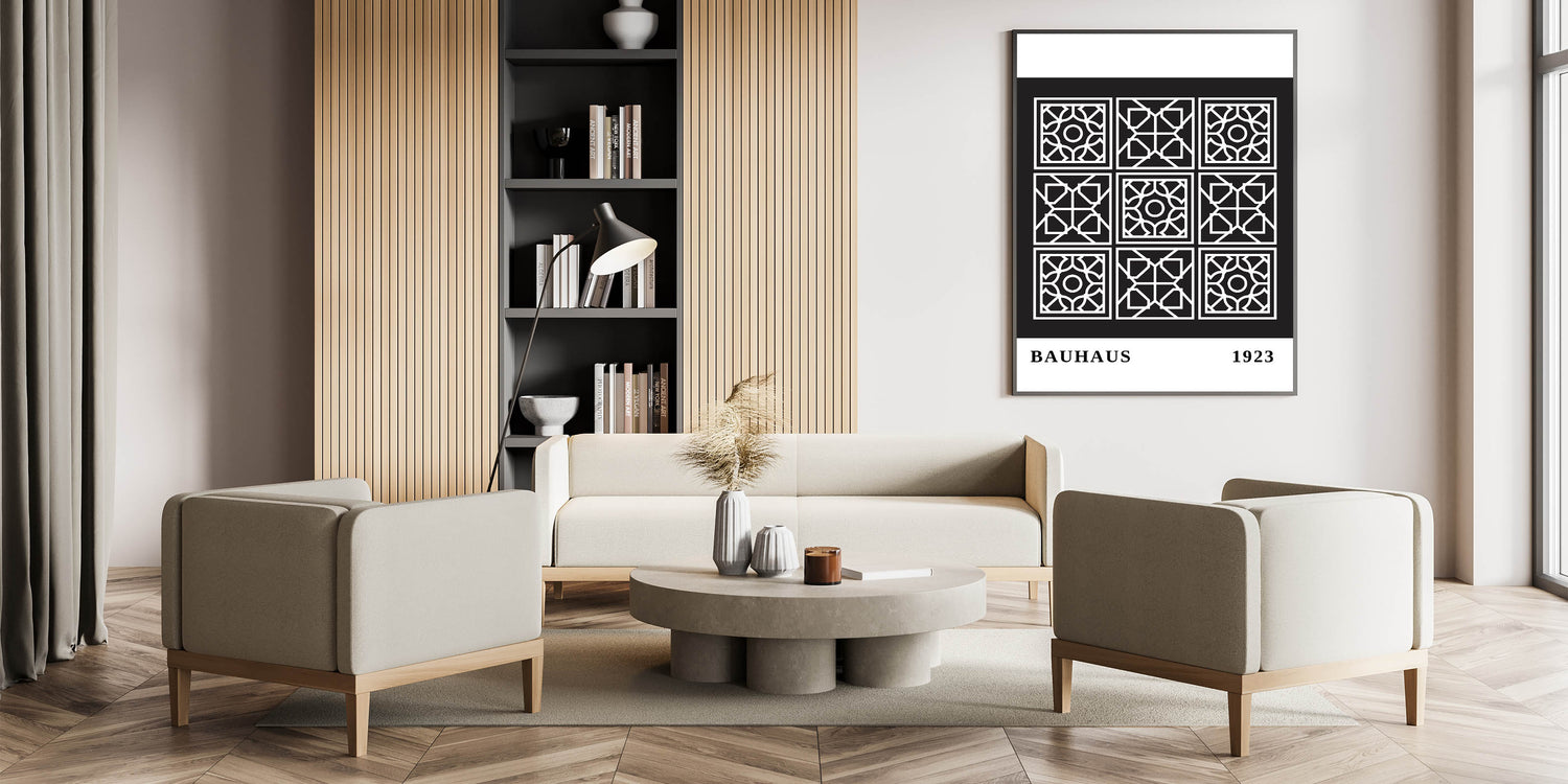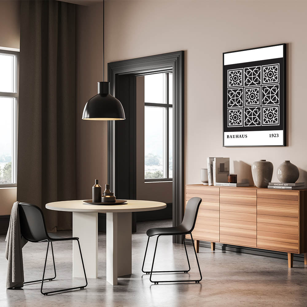 This artwork brings Bauhaus geometry to life in a grid pattern that infuses balance and sophistication into your home decor. Perfect for those who appreciate minimalist design with intricate detailing, this print adds a unique, artistic touch to any space.