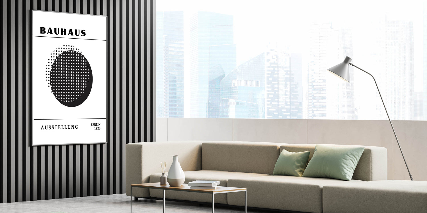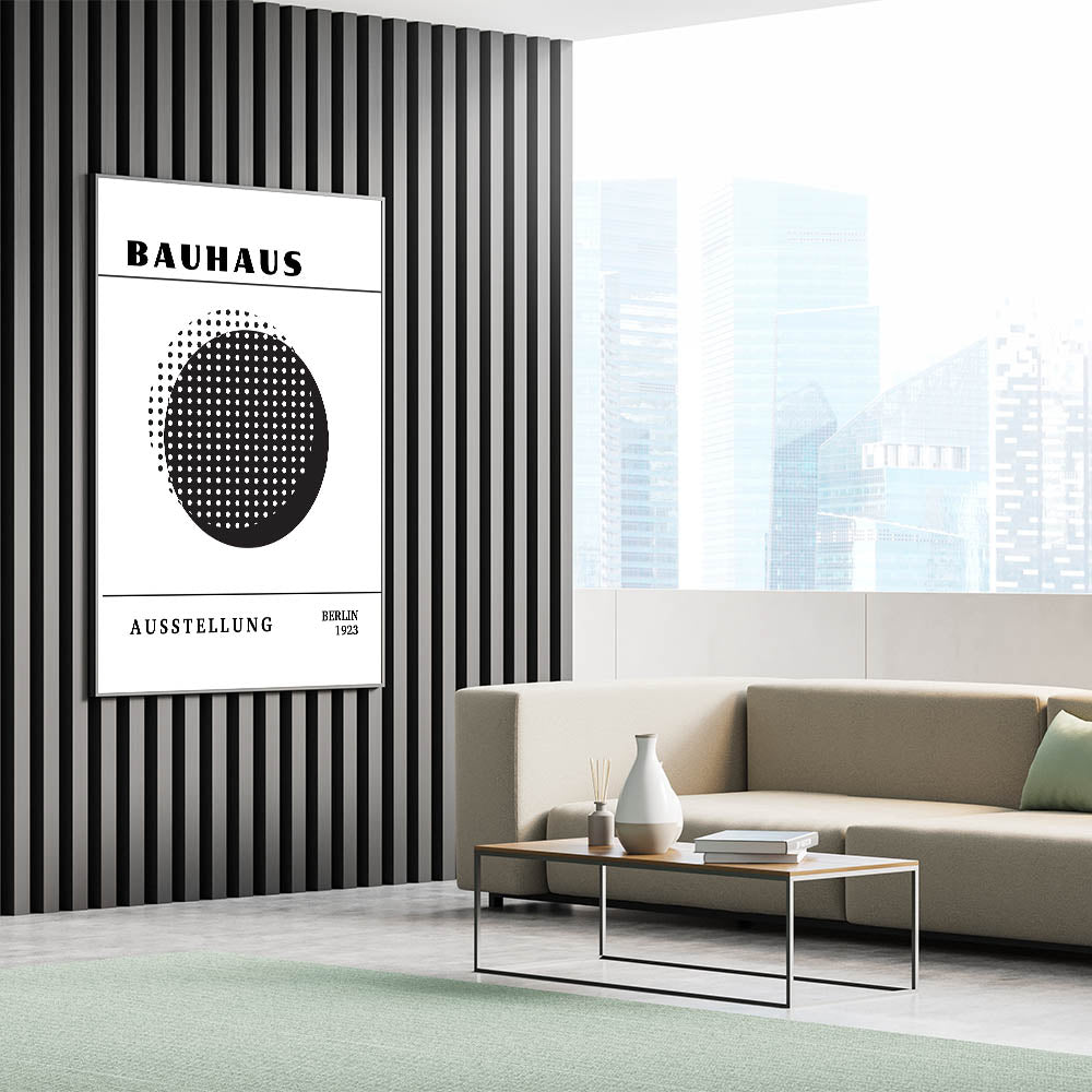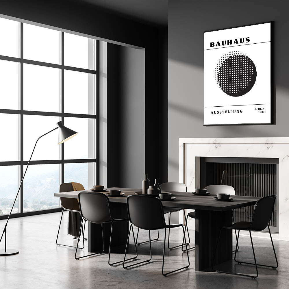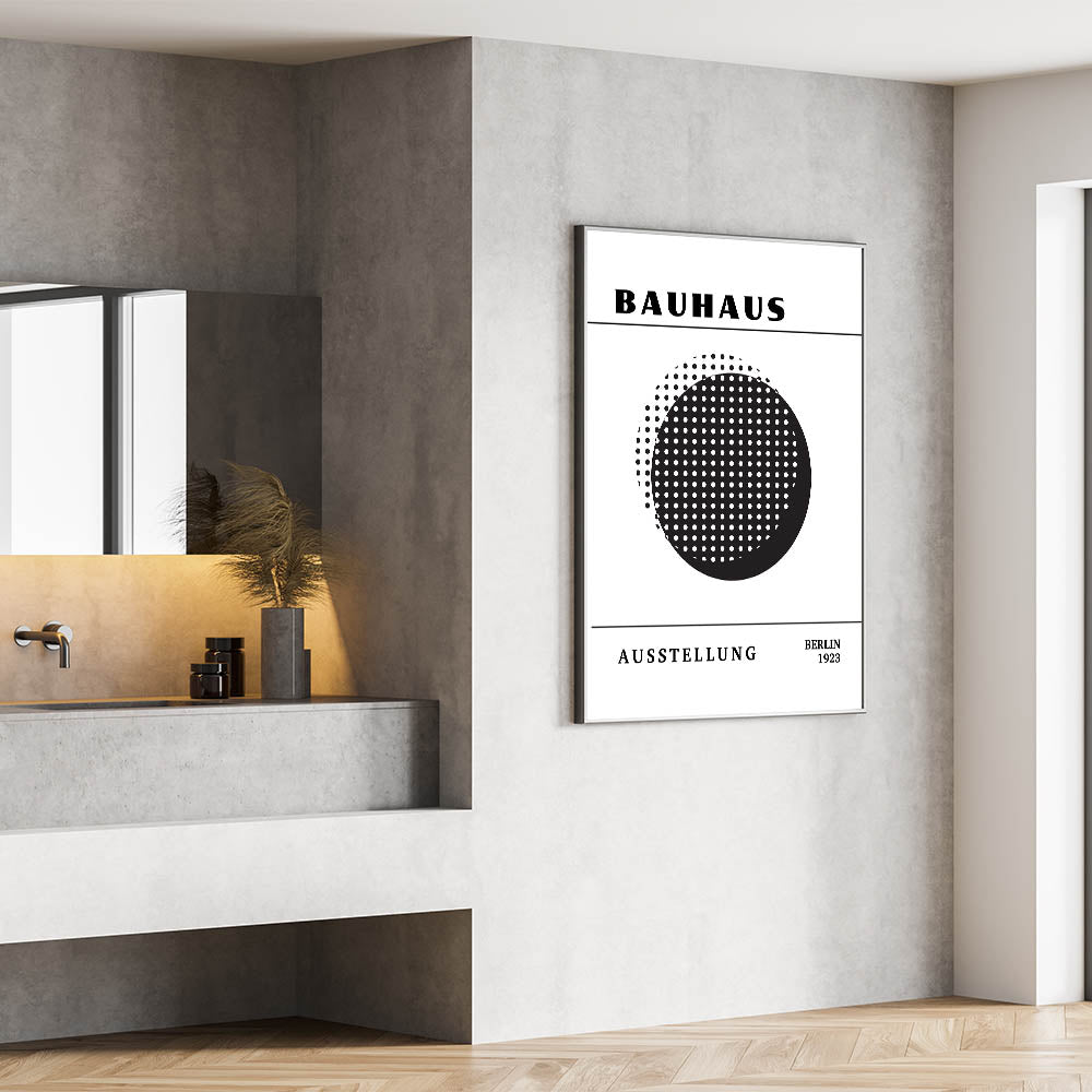 This Bauhaus-inspired bohemian artwork combines clean lines, geometric shapes, and a minimalist aesthetic, making it a perfect fit for modern, eclectic spaces. Featuring a striking black and white dotted circle, this unique design embodies the artistic spirit of Bauhaus while maintaining a boho-chic vibe that seamlessly blends into various interior decor styles.