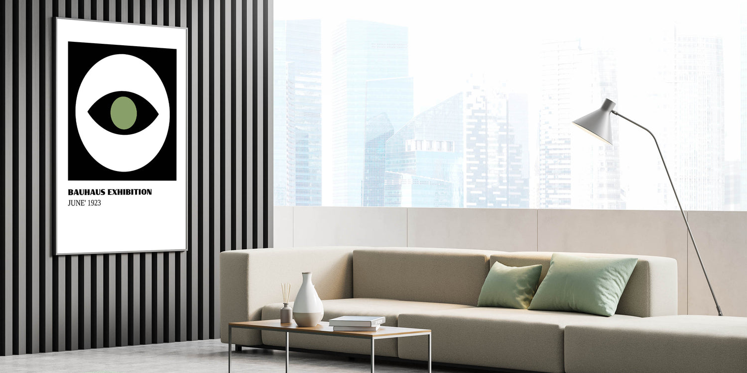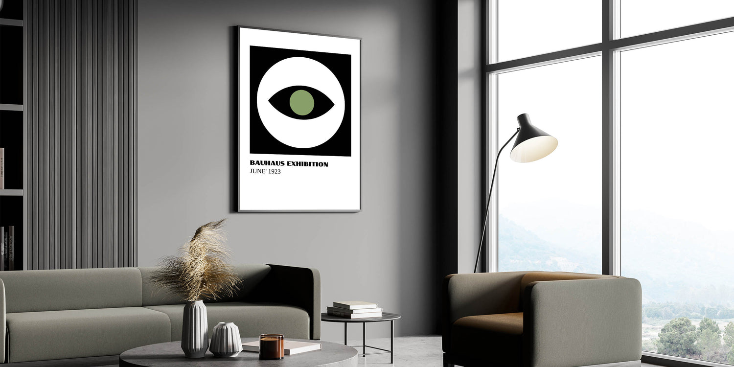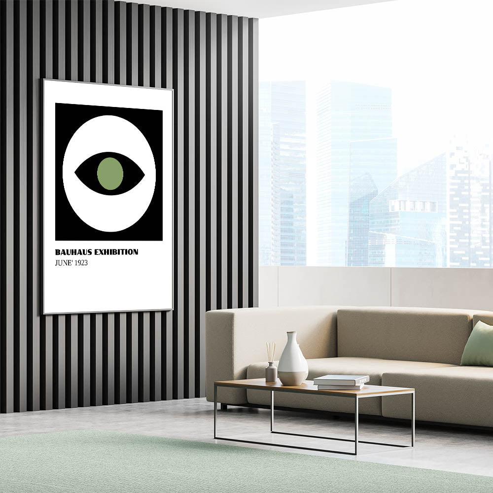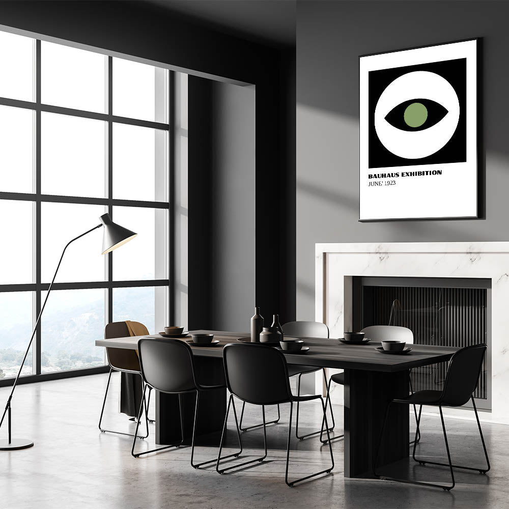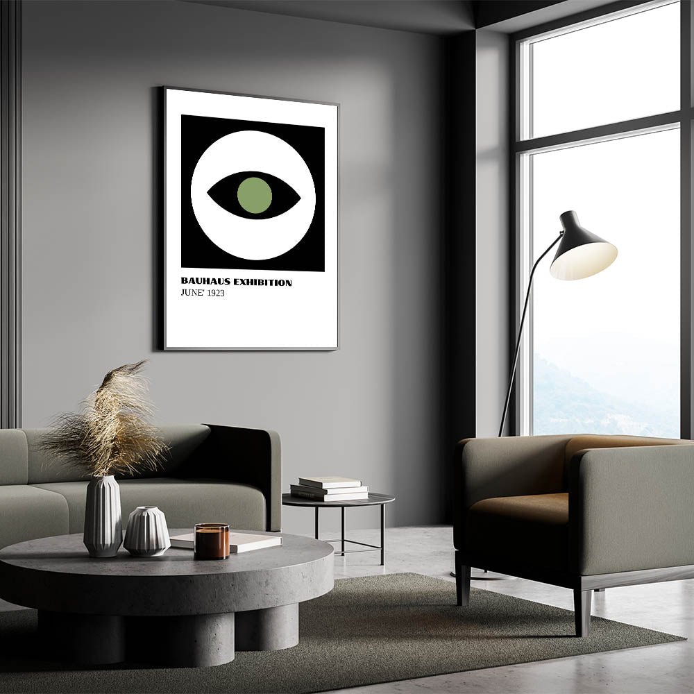 Capture the essence of modern art with this striking Bauhaus-inspired wall art from the June 1923 exhibition. The minimalist eye design, featuring clean black and white lines with a sage green center, adds a bold yet simple aesthetic to any space. This geometric design brings balance and harmony, making it a perfect addition to both modern and eclectic bohemian interiors.