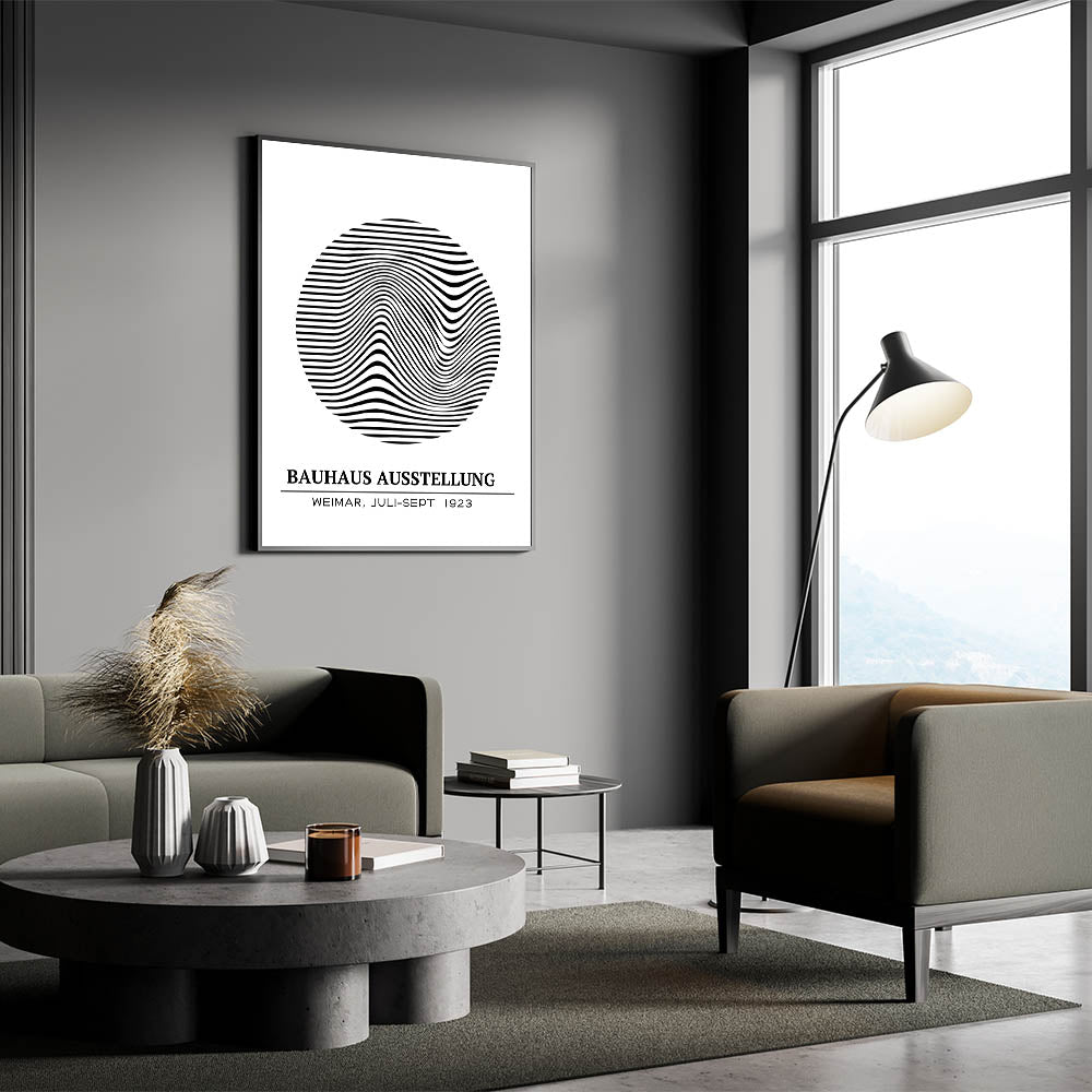 This Bauhaus-inspired bohemian wall art features a striking circular design filled with undulating black and white lines, creating an optical illusion of movement and depth. The minimalist style blends seamlessly with modern, eclectic, and boho decor, making it the perfect addition to your living room, bedroom, or office space. The flowing lines within the circular frame evoke a sense of harmony, making this artwork a focal point in any room.