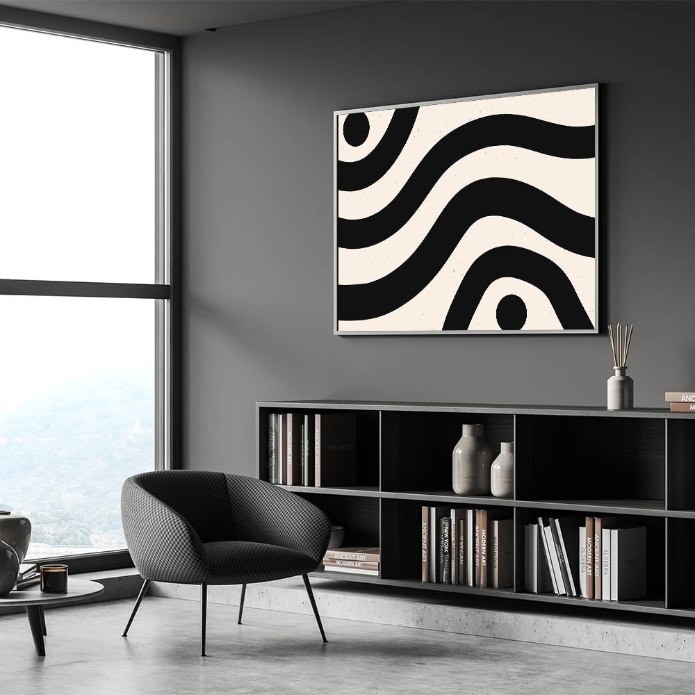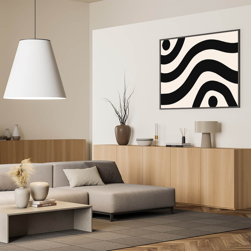 Enhance your interior with this bold Bohemian wall art, featuring striking black and white wavy lines. The minimalist design creates a sense of movement and flow, making it a versatile piece for modern, eclectic, or boho-styled spaces. The deep black lines against the neutral background make this artwork a powerful statement, adding visual interest to living rooms, bedrooms, or office spaces. Crafted from premium materials, this boho-inspired art print is available in various formats to suit your style, offering a unique balance of simplicity and elegance.