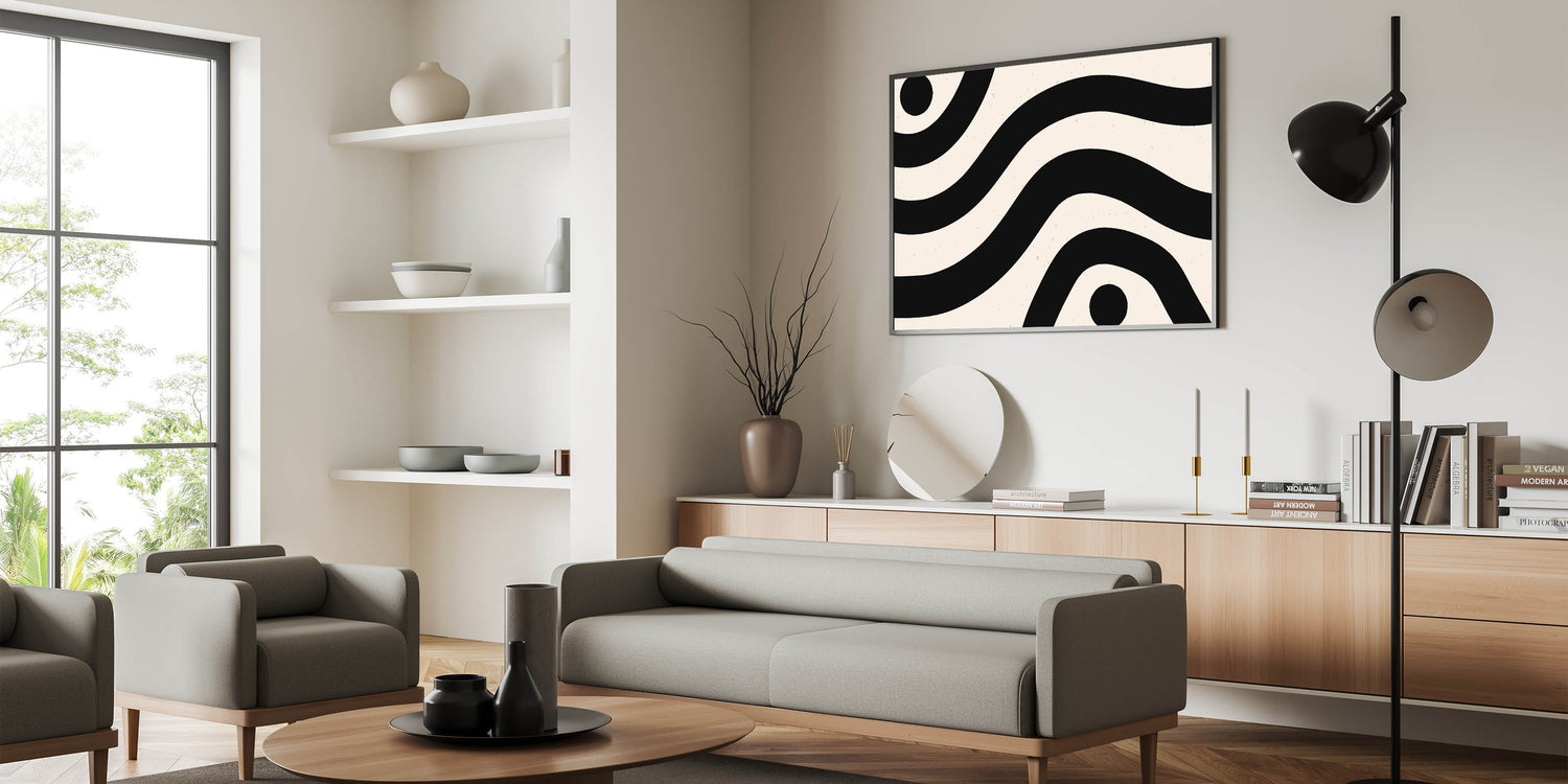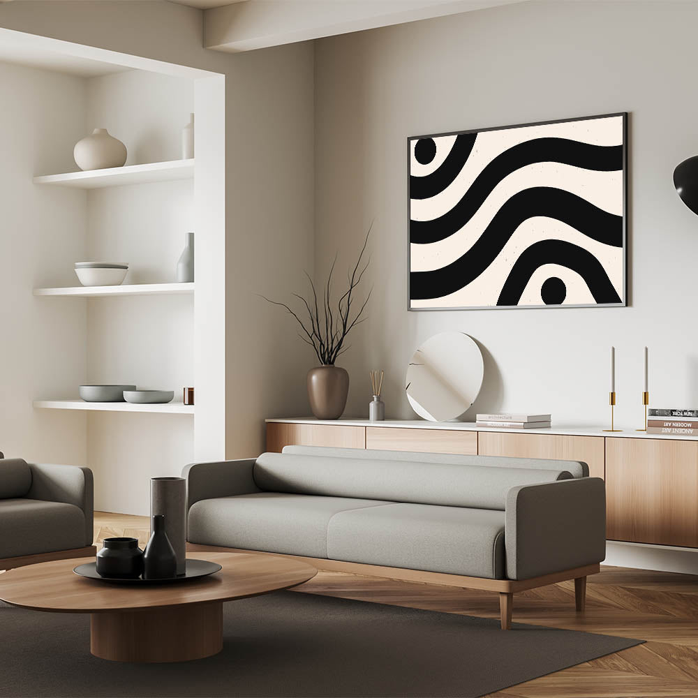 • Bold Boho Design: A minimalist black-and-white wavy line pattern that adds movement and sophistication to any room.