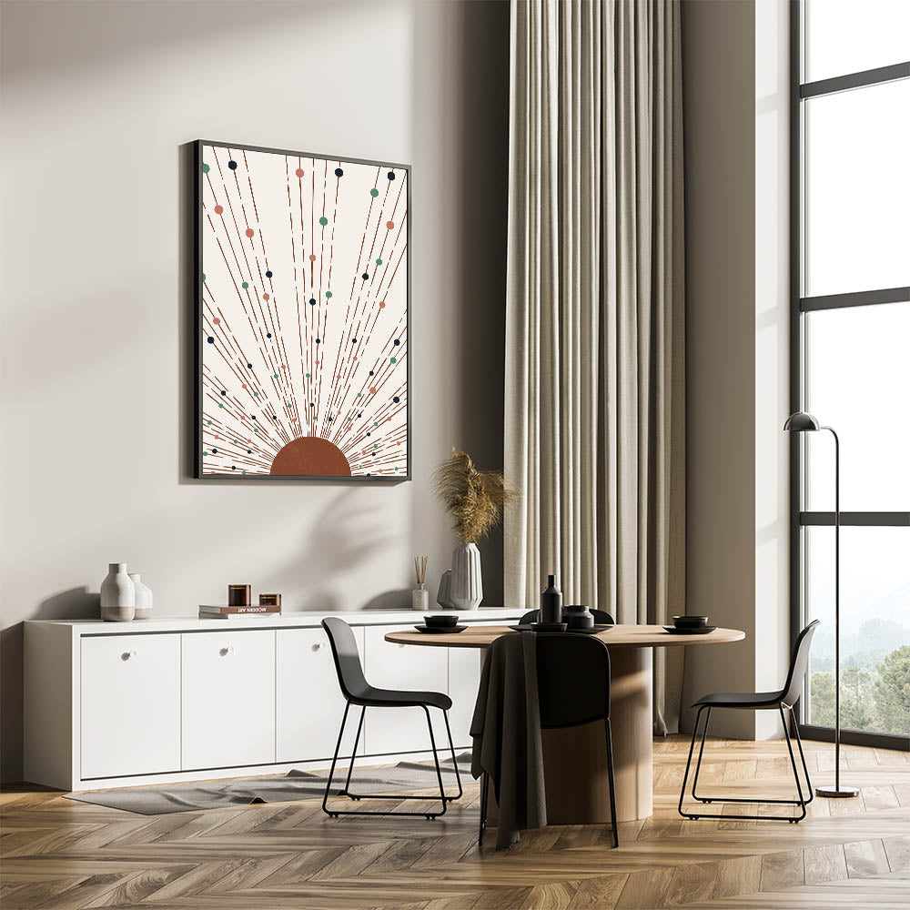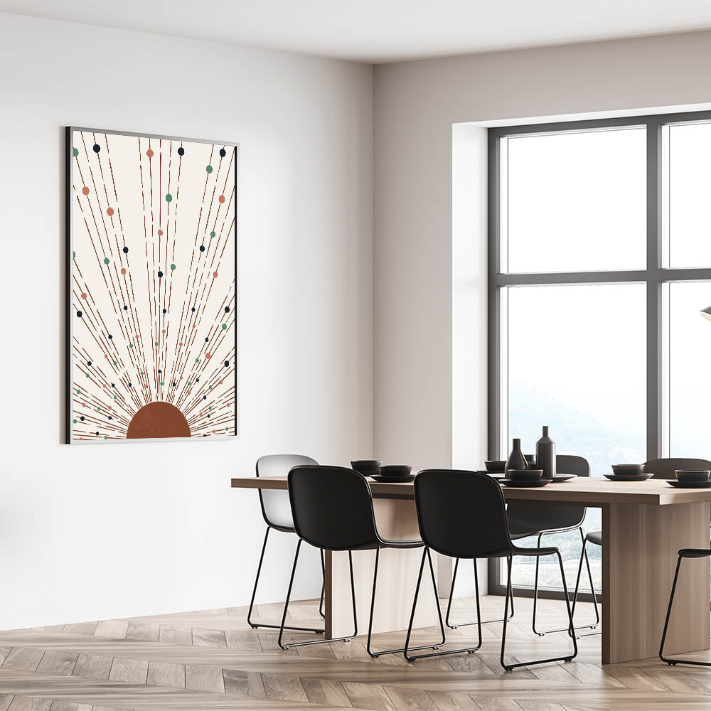 Add a touch of earthy elegance to your space with this abstract sunburst design. The dynamic lines, accented by geometric dots in warm tones of brown, green, and peach, radiate outward from a bold central circle. This artwork creates a sense of movement and vibrancy, making it a perfect focal point for modern bohemian or minimalist interiors.