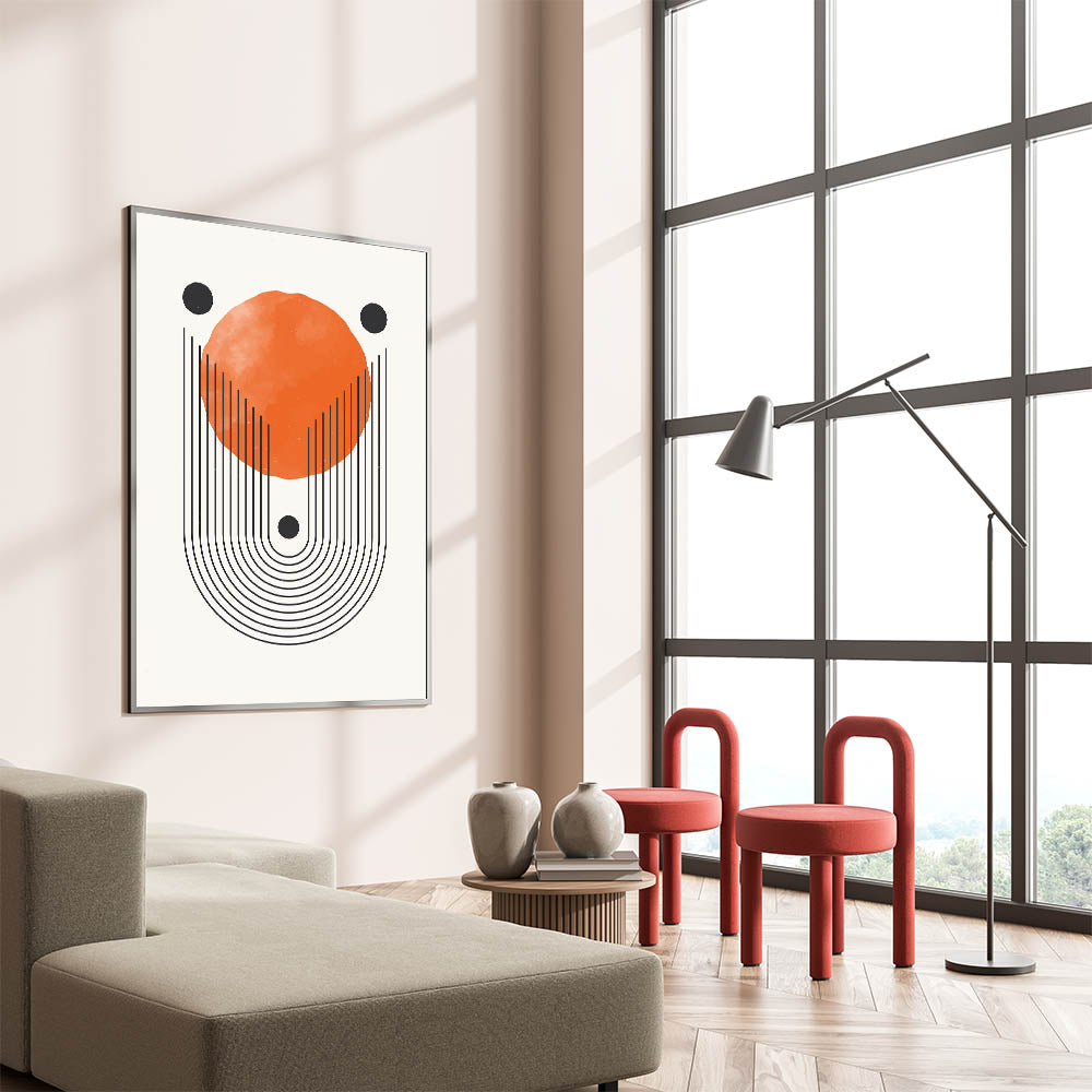 Add a touch of artistic elegance to your space with this unique Bohemian wall art piece. Designed with bold geometric lines and a vibrant orange focal point, this modern boho chic wall hanging is perfect for those who appreciate both minimalism and eclectic design. The handcrafted look of the black and orange elements brings a warm yet sophisticated feel, making it ideal for any home decor.