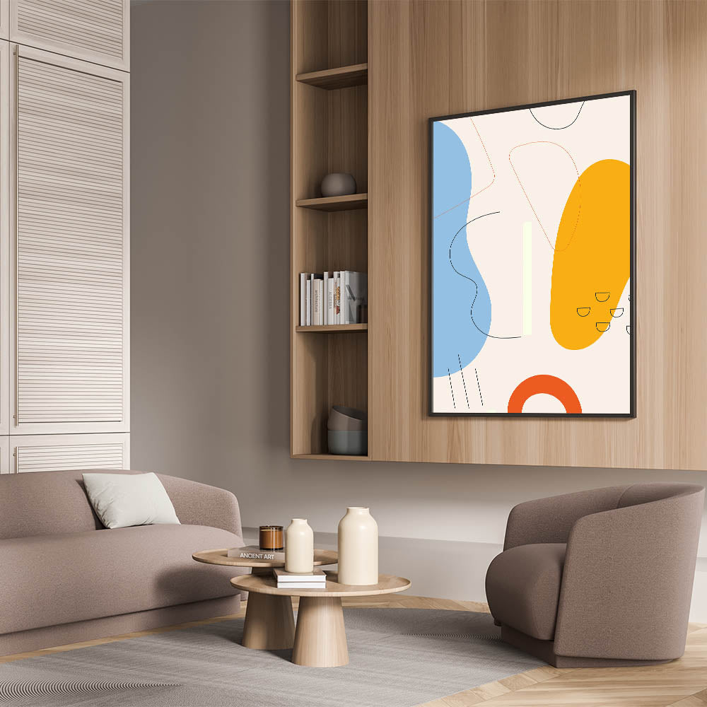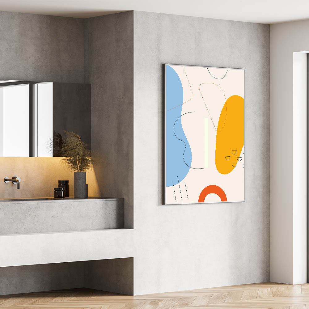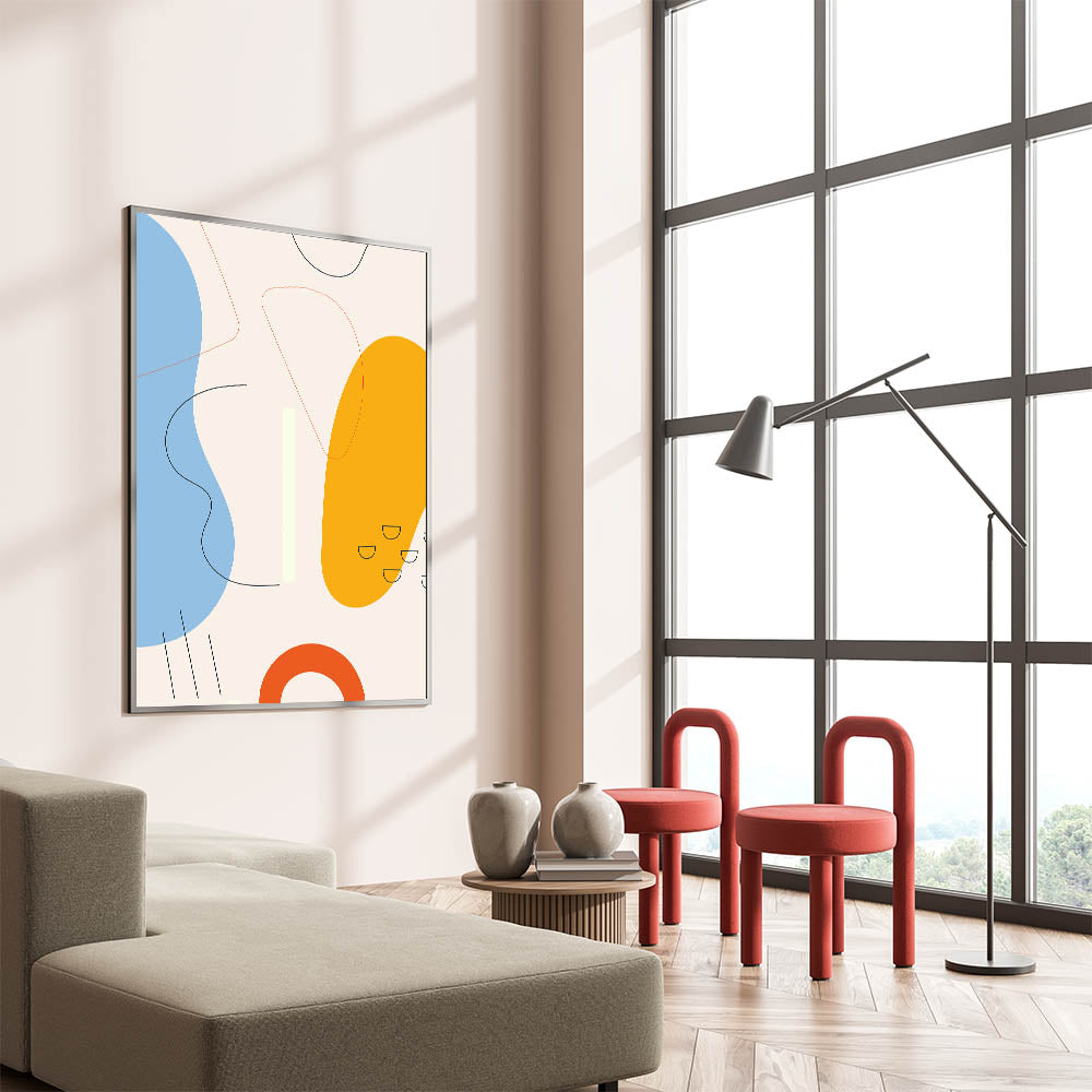 Bring vibrancy and energy to your space with this eclectic Bohemian wall art. The playful abstract design features bold splashes of blue, orange, and yellow, accented by simple line work to create a harmonious balance of color and form. This artistic boho chic wall hanging is perfect for adding a modern, playful touch to your living room, bedroom, or office.