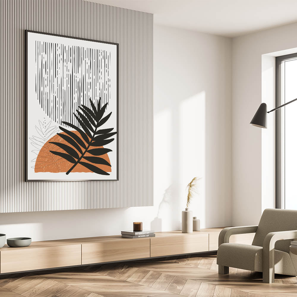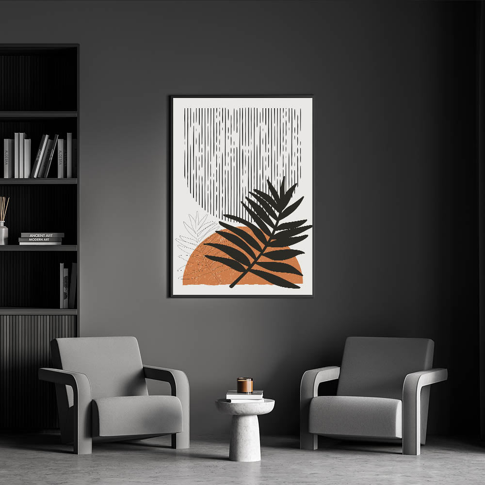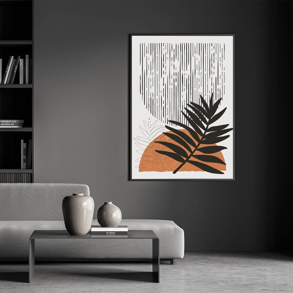 Elevate your living space with this unique bohemian artwork, featuring an artistic palm leaf design that blends modern and boho-chic styles. This eye-catching wall art is perfect for those who appreciate a mix of natural elements and geometric patterns. The contrast of earthy tones and black accents creates a bold yet calming presence in any room. Whether you are designing a cozy living room or a serene bedroom, this bohemian-inspired art print is the ideal choice.