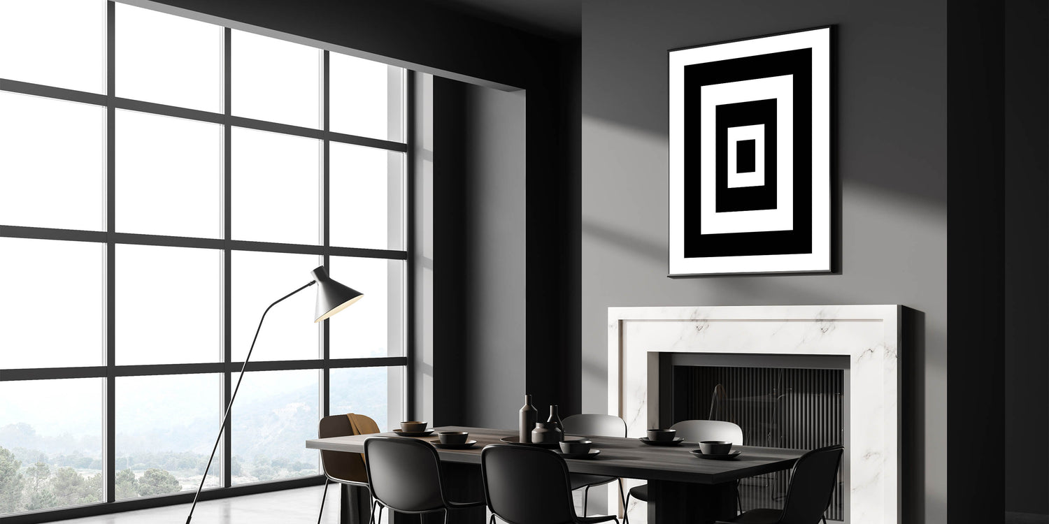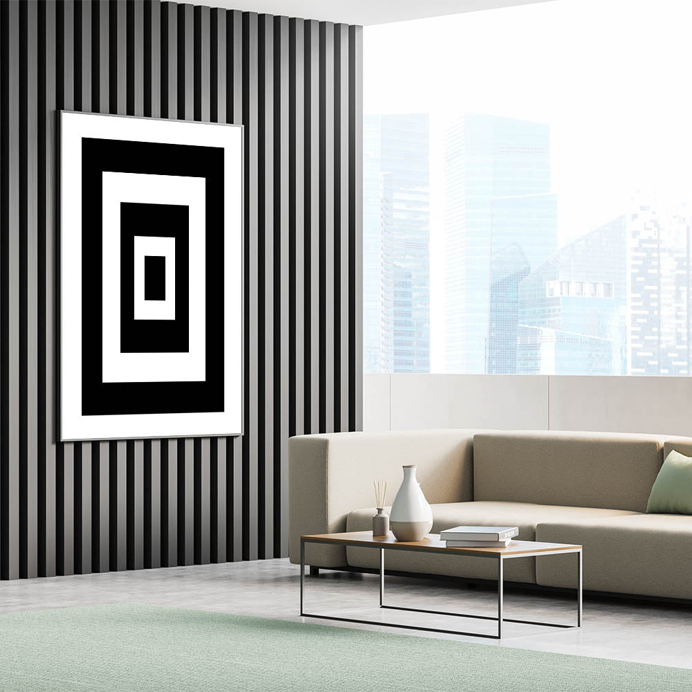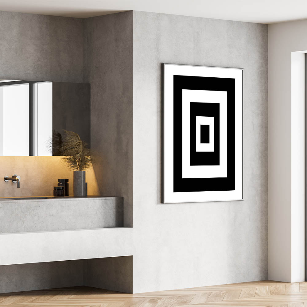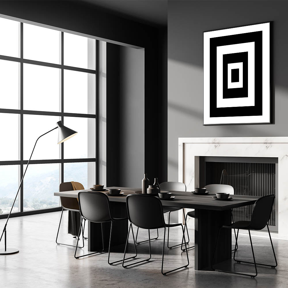 Introducing a unique bohemian artwork that brings bold, geometric elegance to modern spaces. This striking piece features concentric squares, creating a visually captivating design that adds depth and dimension to any room. The black and white contrast enhances its versatility, making it a perfect fit for various interior styles, from minimalist to eclectic bohemian decor.