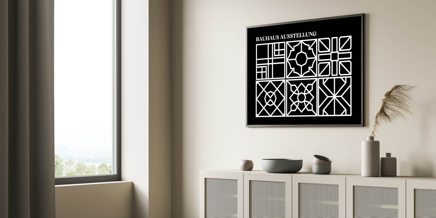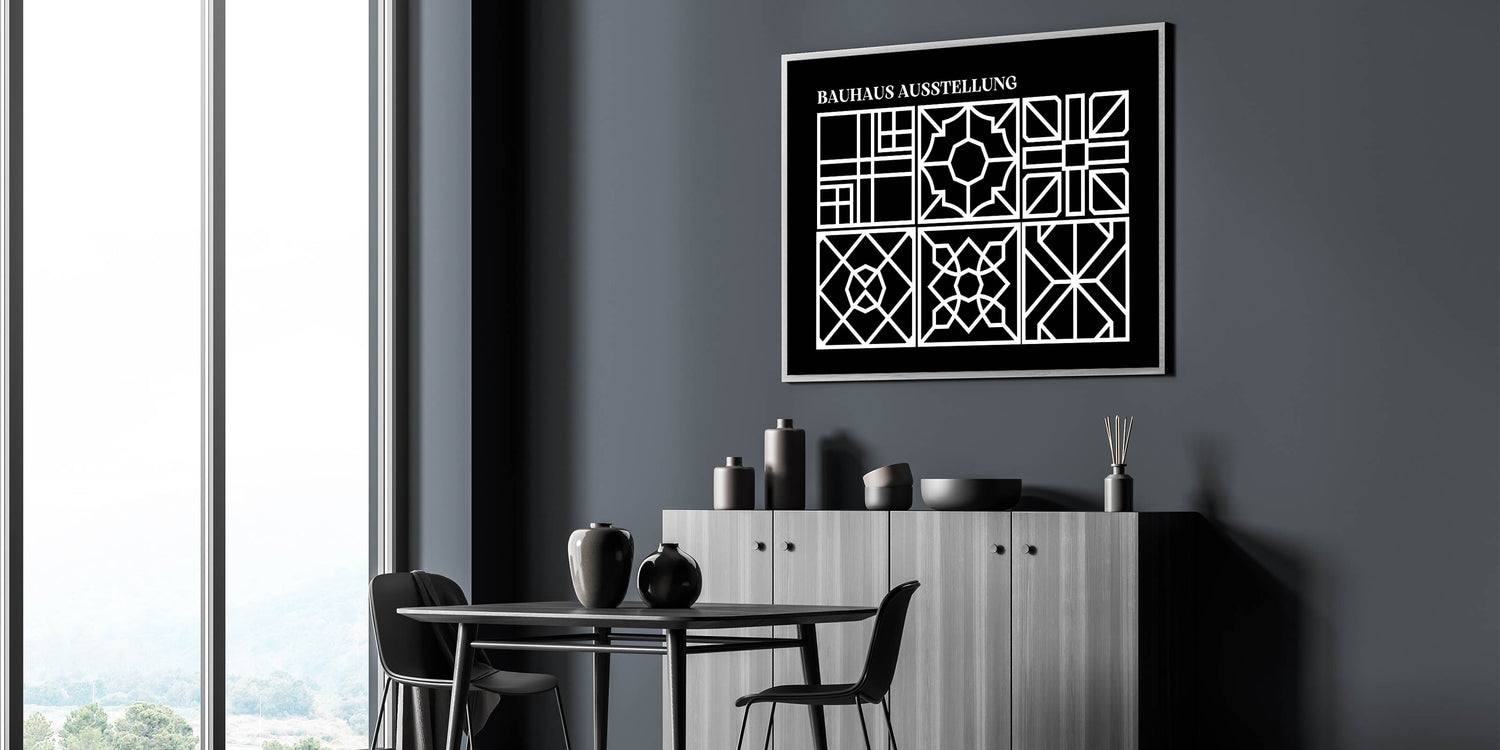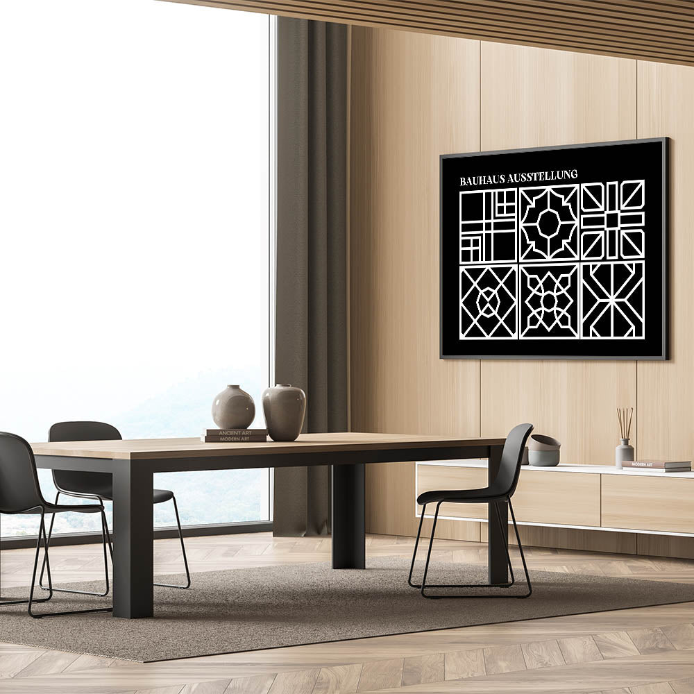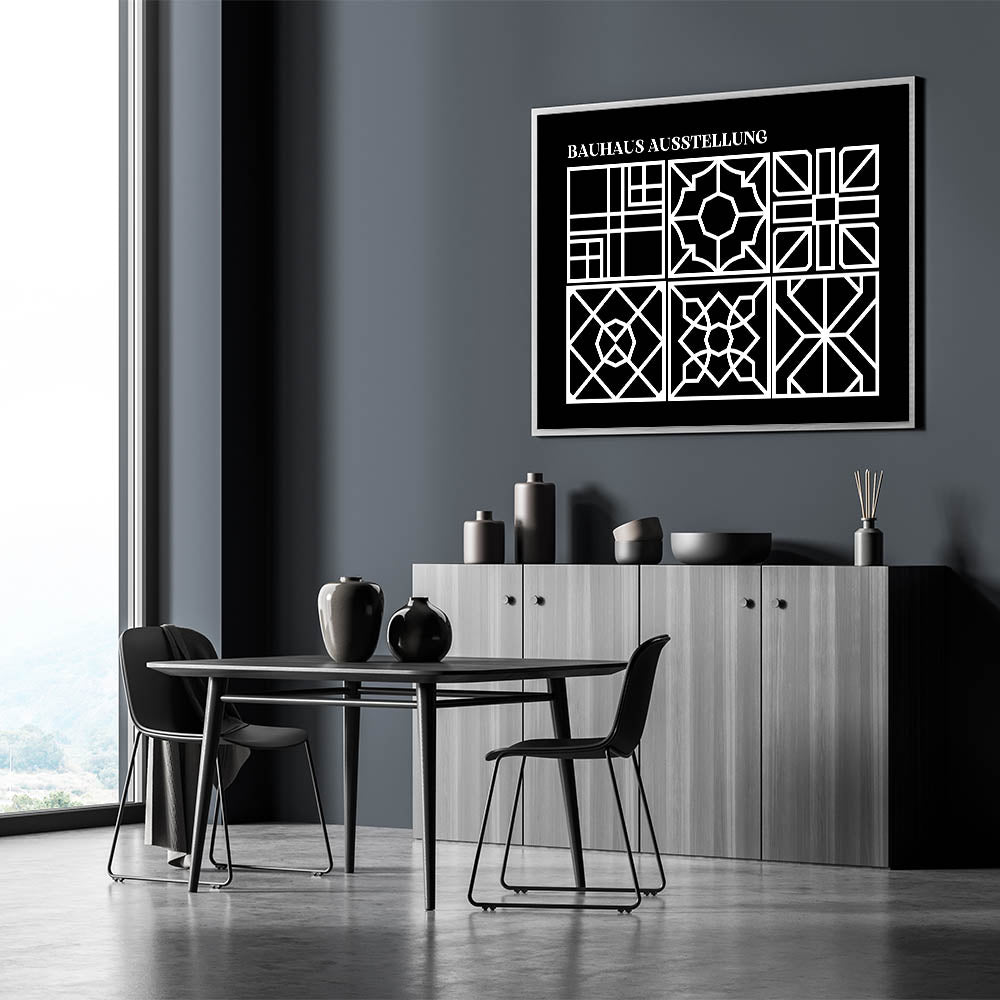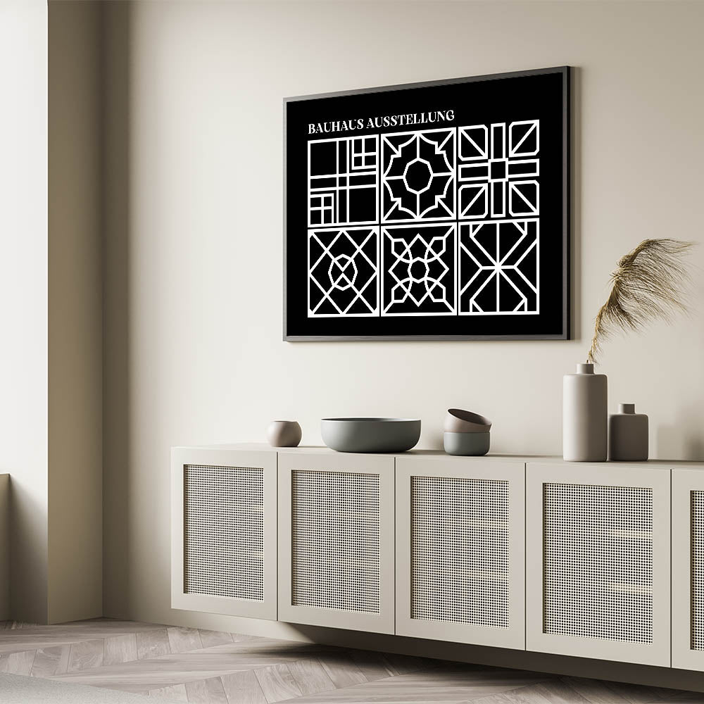 Enhance your home with this stunning Bohemian wall art, featuring an intricate black and white geometric design inspired by the Bauhaus Ausstellung. The delicate patterns within each square offer a unique blend of symmetry and artistic expression, making this print a perfect fit for modern and eclectic interiors. Whether you place it in your living room, bedroom, or office, this boho decor canvas will bring a touch of elegance and sophistication to any space.