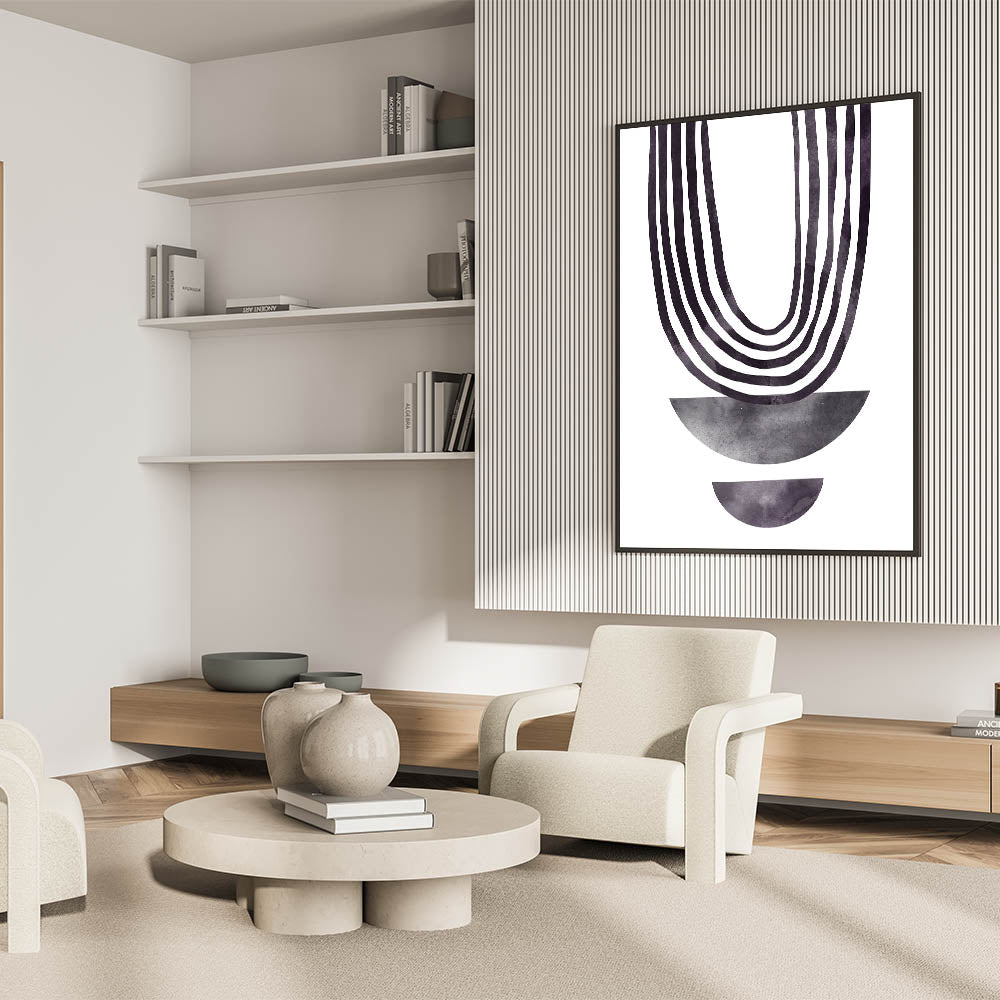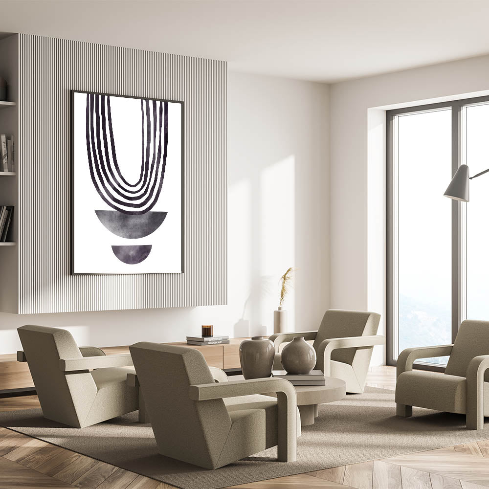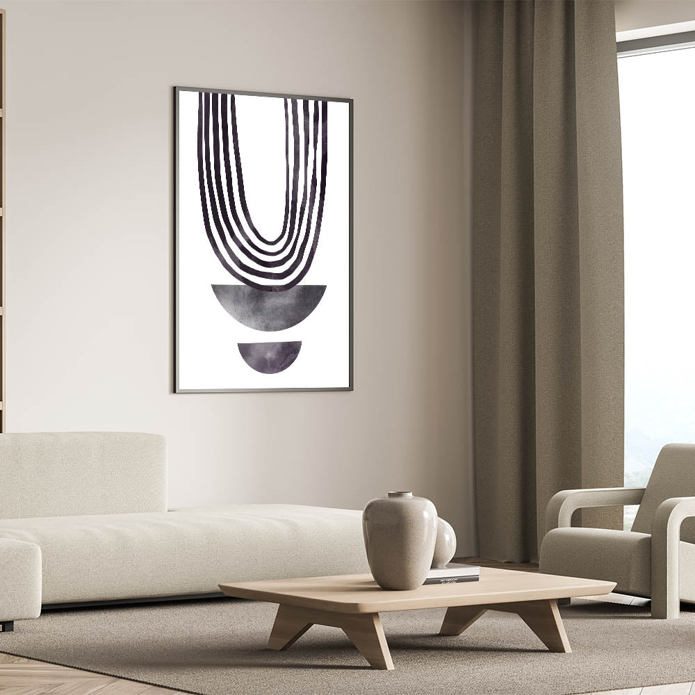Add a modern and minimalist touch to your home decor with this elegant bohemian wall art featuring abstract geometric shapes in a sleek black and white palette. The combination of curved lines and semi-circles creates a visually balanced and sophisticated design, perfect for contemporary interiors. This boho chic canvas print is ideal for those seeking a stylish yet understated focal point for their living space.