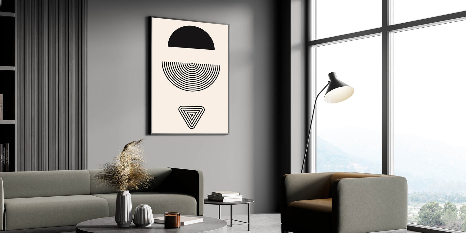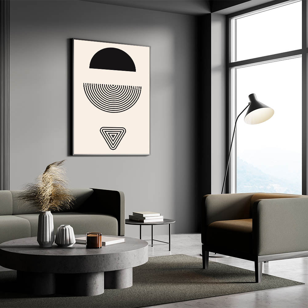 Embrace the clean lines and striking simplicity of this minimalist bohemian wall art. Featuring bold black geometric shapes set against a soft cream background, this artwork creates a harmonious balance between modern minimalism and boho chic design. Perfect for contemporary and eclectic spaces, this piece captures the essence of geometric art with a unique bohemian twist.