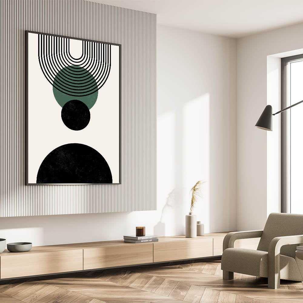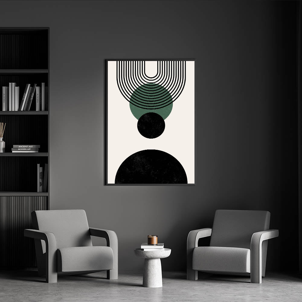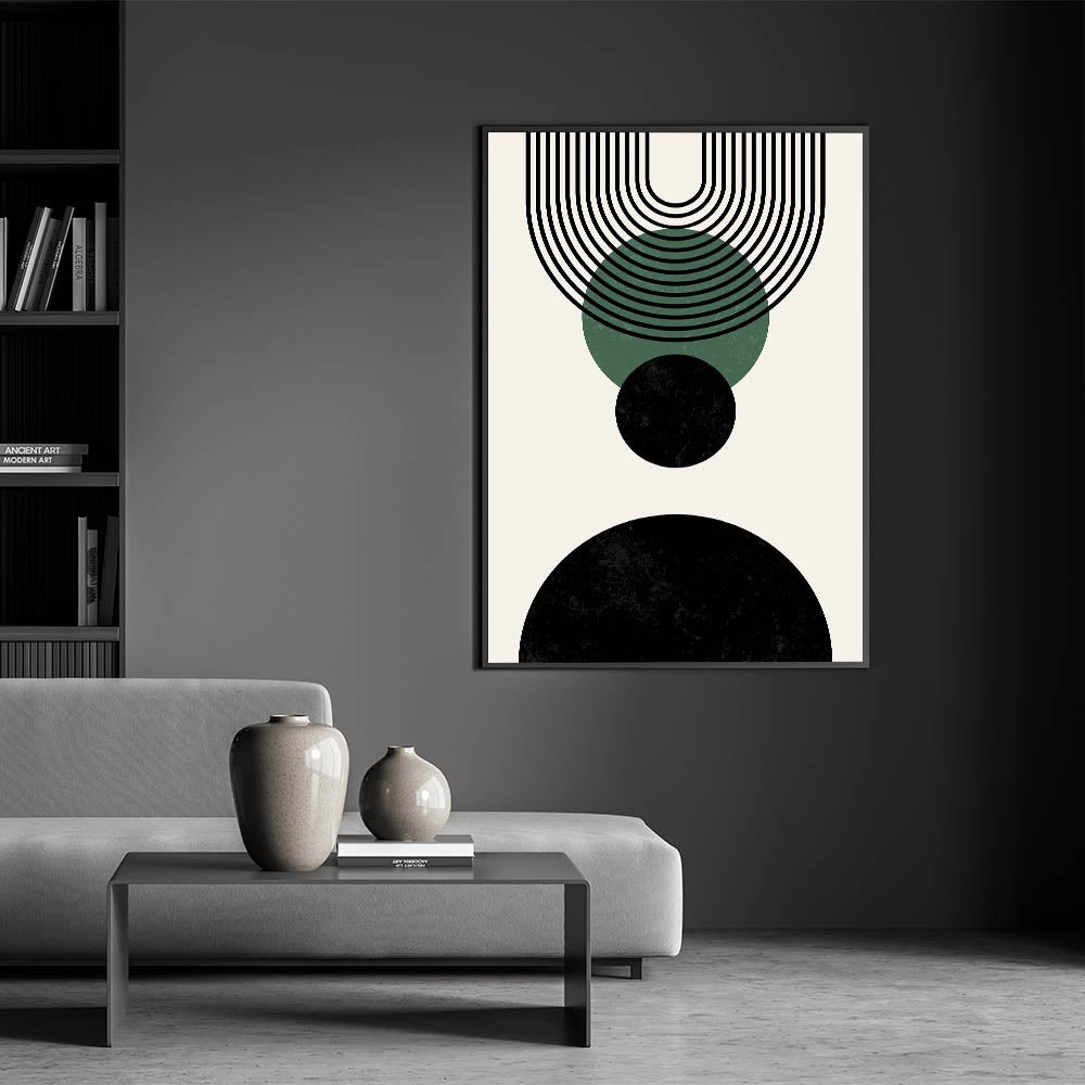 This elegant design is defined by its bold black and forest green circles, complemented by clean, linear arches that create a sense of harmony. Perfect for those seeking a modern, minimalist touch to their space, this geometric print effortlessly enhances boho and contemporary decor styles.