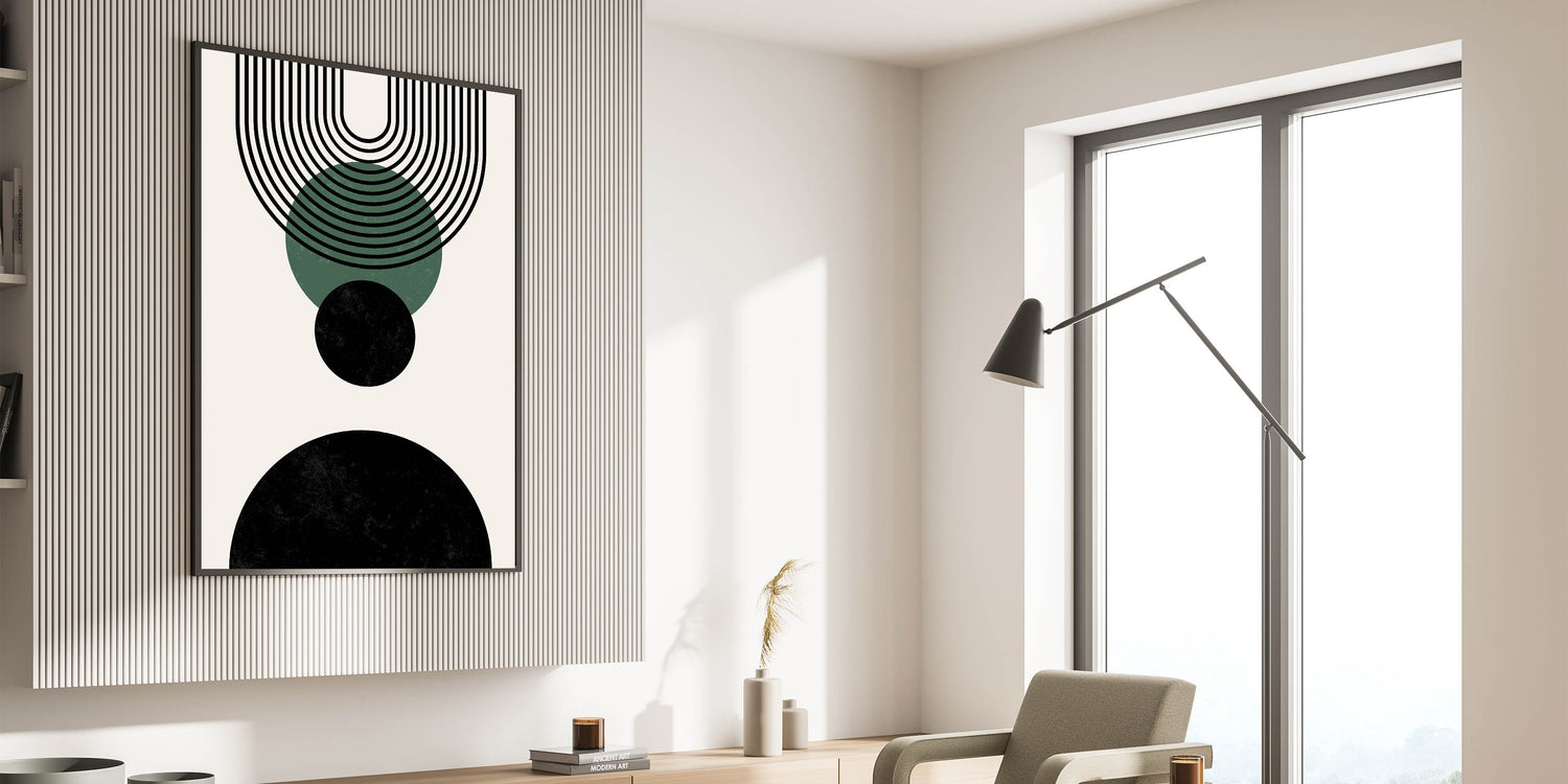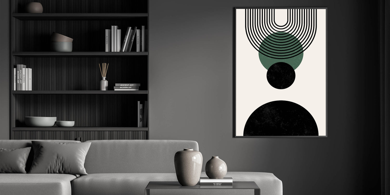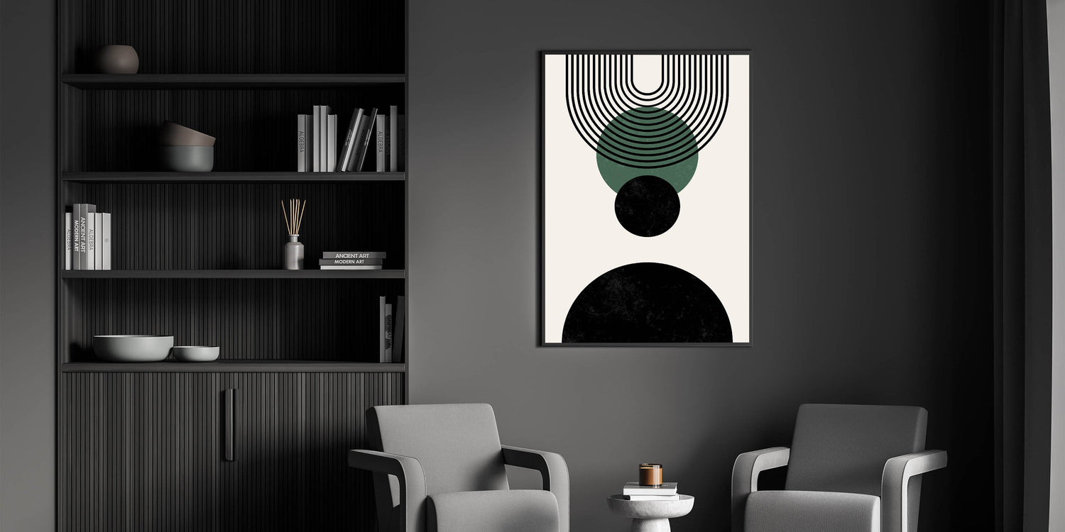 This elegant design is defined by its bold black and forest green circles, complemented by clean, linear arches that create a sense of harmony. Perfect for those seeking a modern, minimalist touch to their space, this geometric print effortlessly enhances boho and contemporary decor styles.