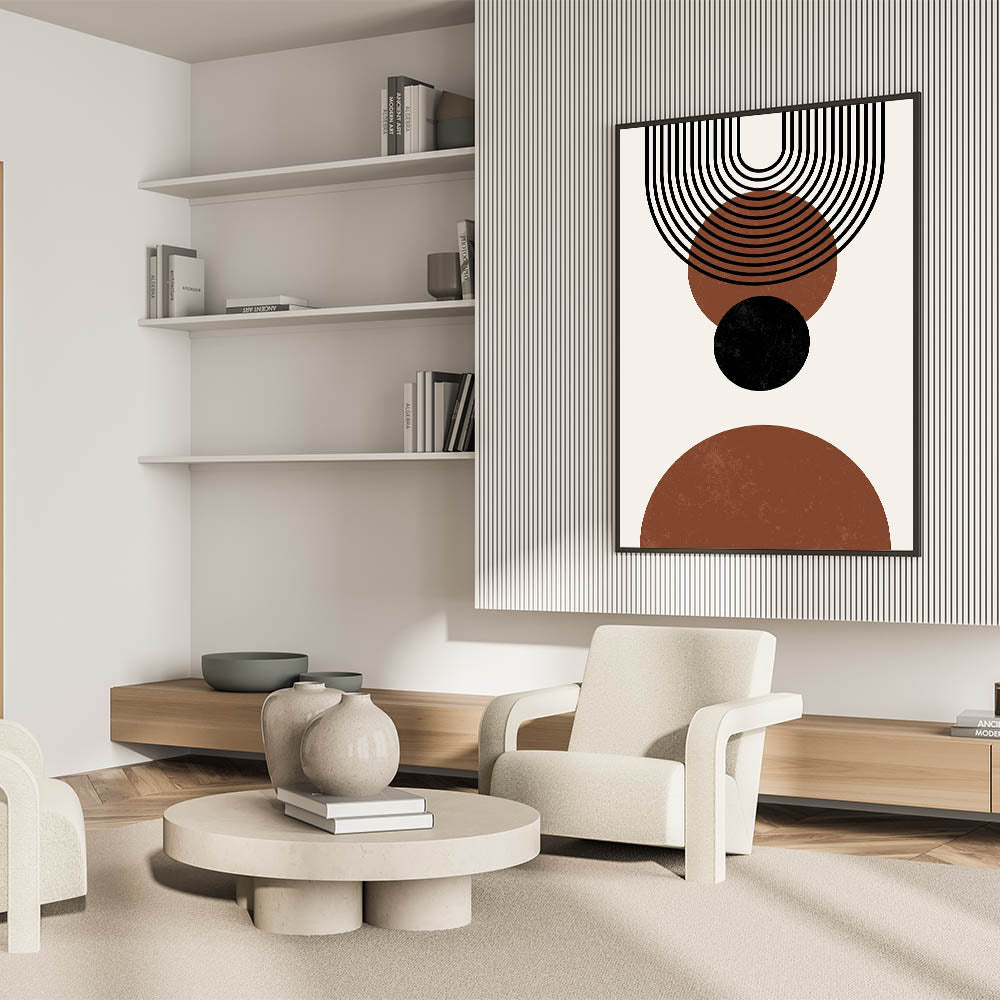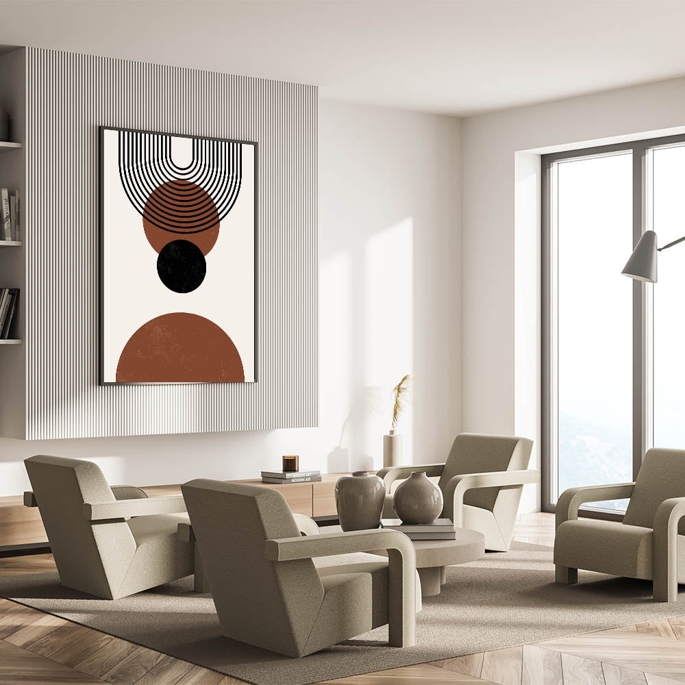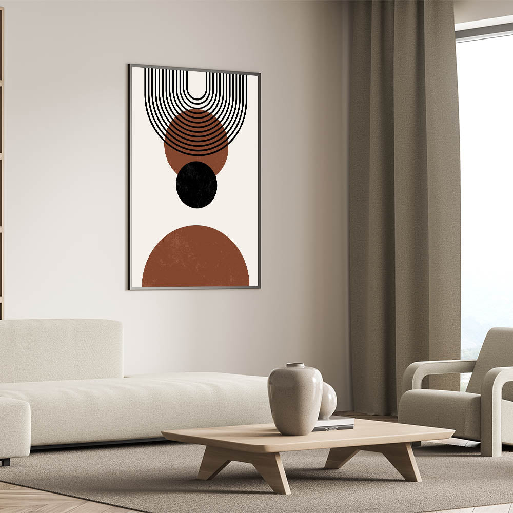 The muted brown and black tones of this design create a sense of depth and simplicity, while the bold circles and curved lines provide visual intrigue. This modern, minimalist piece is perfect for those looking to create a tranquil, artistic ambiance in their home.