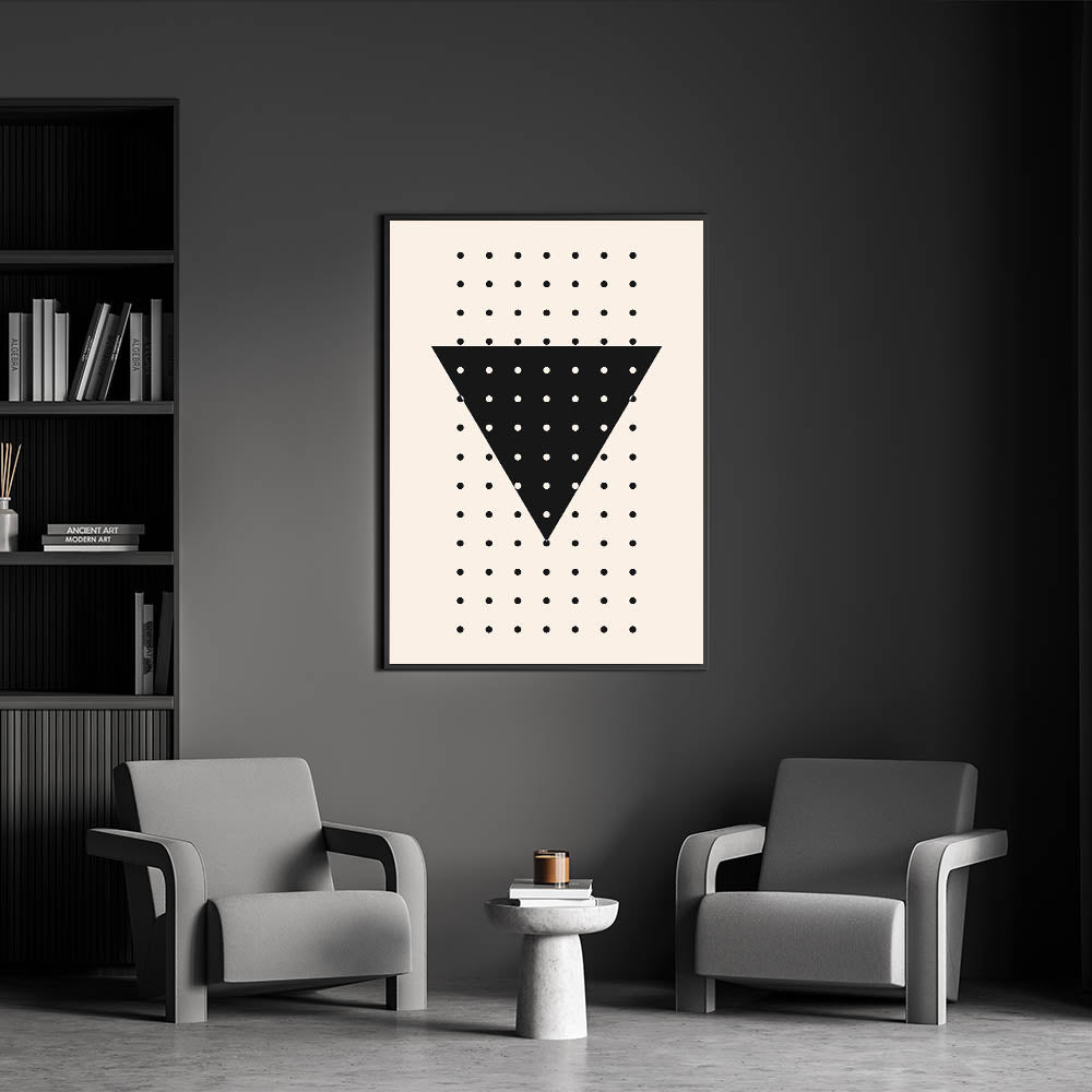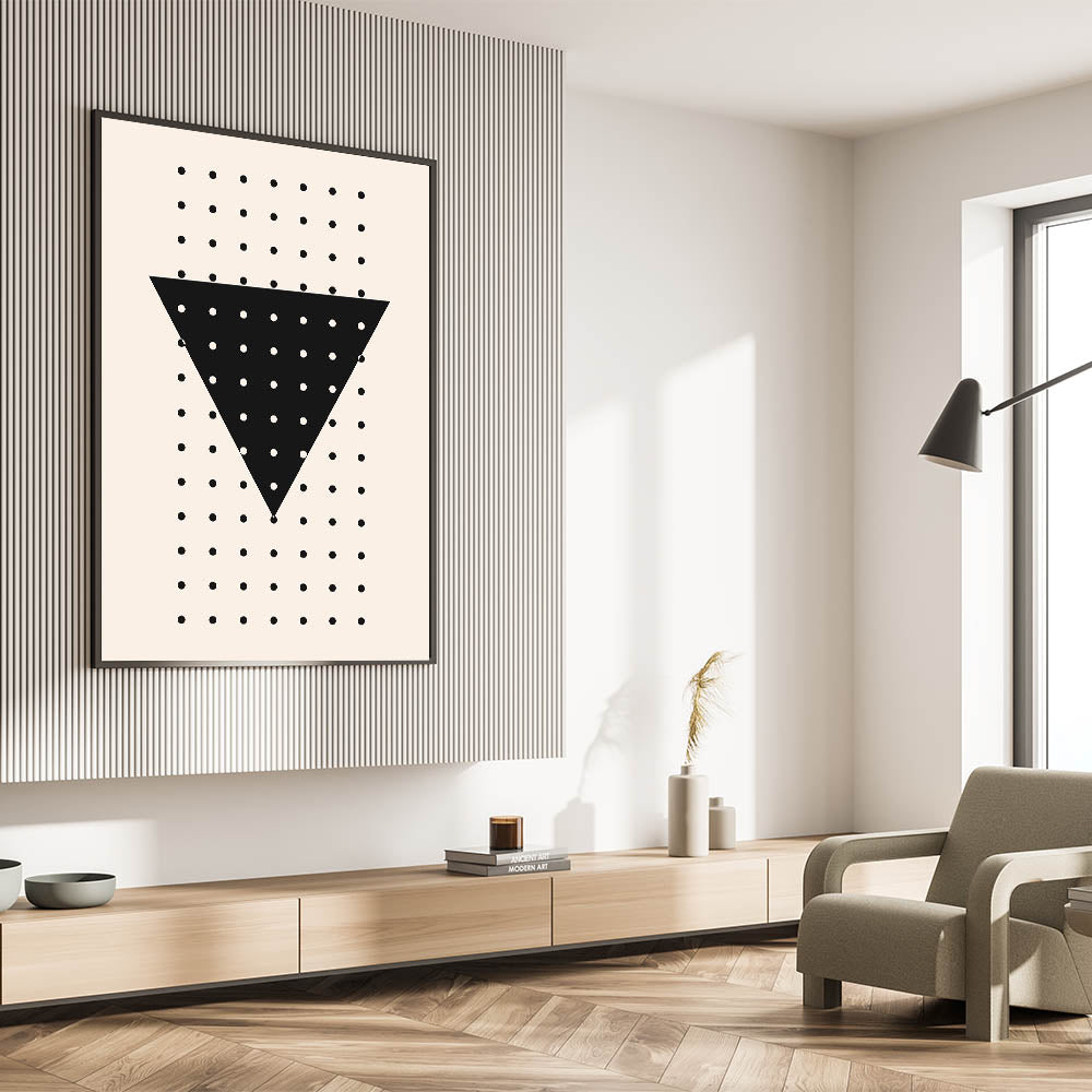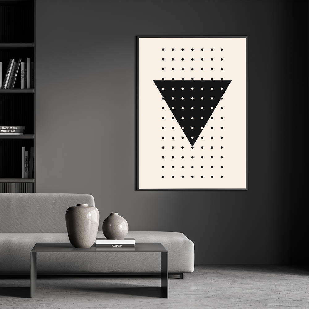 This minimalist geometric design features a bold black triangle adorned with a grid of small dots, creating a striking contrast against a soft, neutral background. The simplicity of the shapes combined with the balance of negative space makes this artwork ideal for modern and bohemian interiors. Whether you're looking to add a focal point to your space or complement an existing decor style, this artwork adds a touch of elegance and modernity.