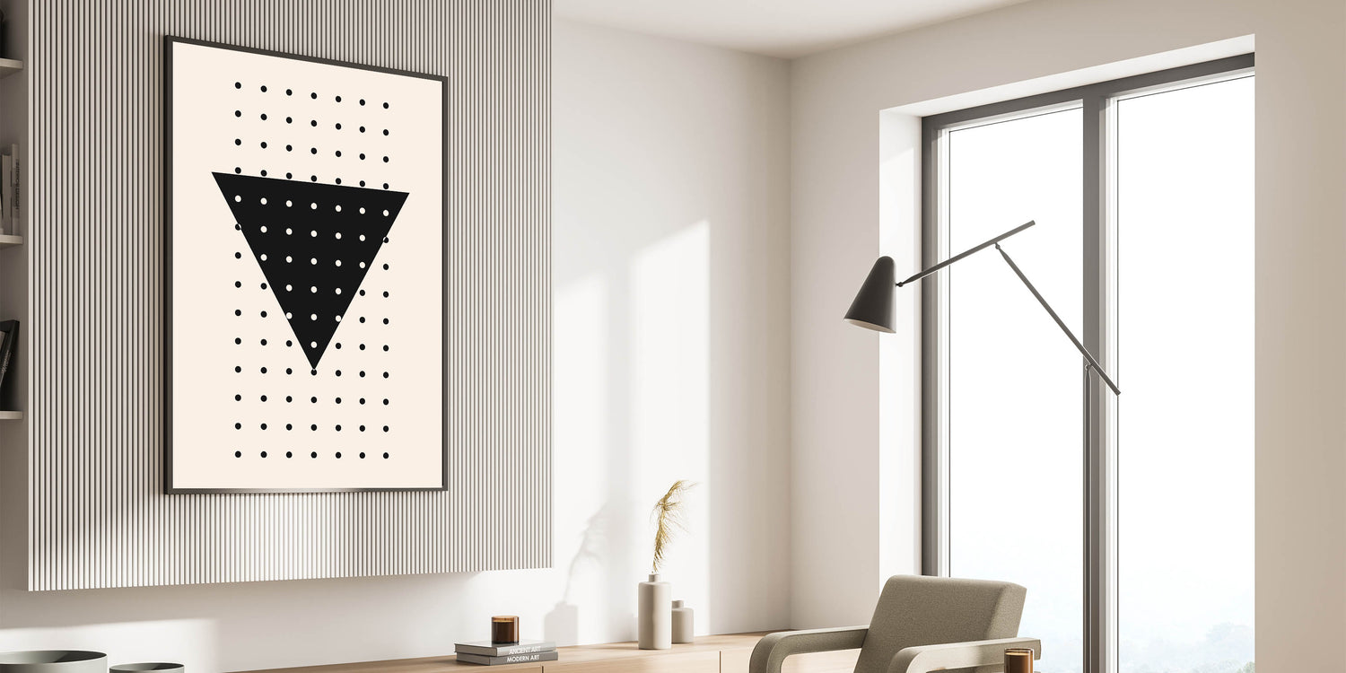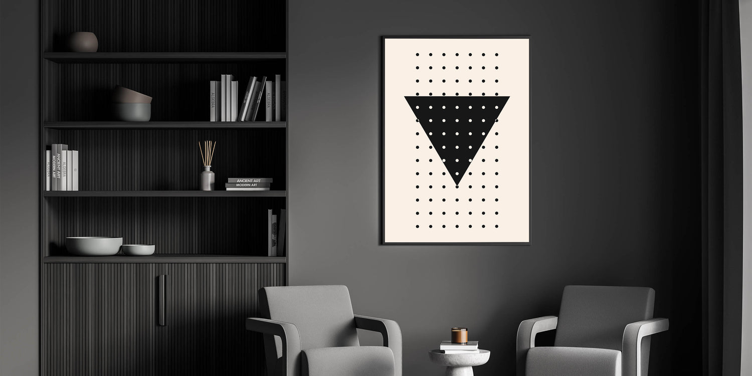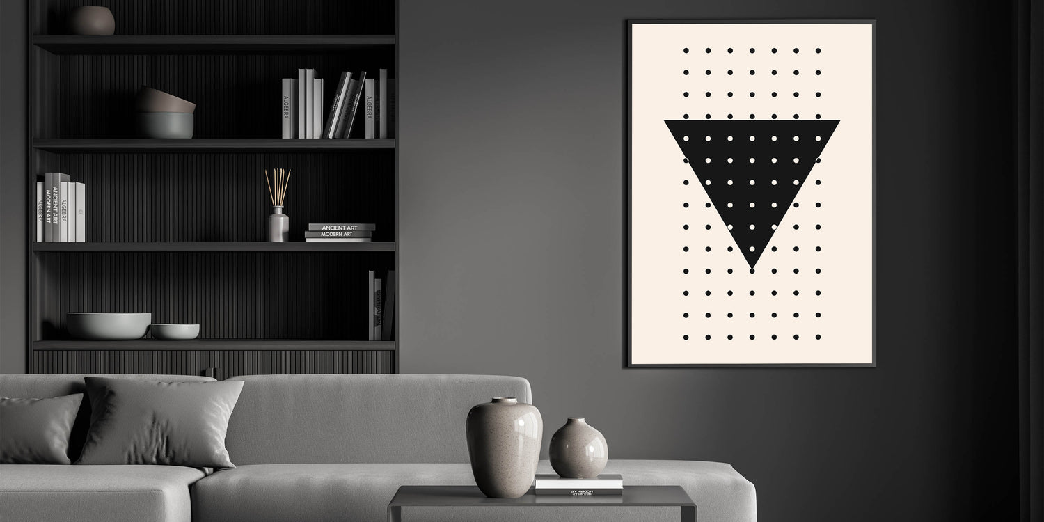 This minimalist geometric design features a bold black triangle adorned with a grid of small dots, creating a striking contrast against a soft, neutral background. The simplicity of the shapes combined with the balance of negative space makes this artwork ideal for modern and bohemian interiors. Whether you're looking to add a focal point to your space or complement an existing decor style, this artwork adds a touch of elegance and modernity.