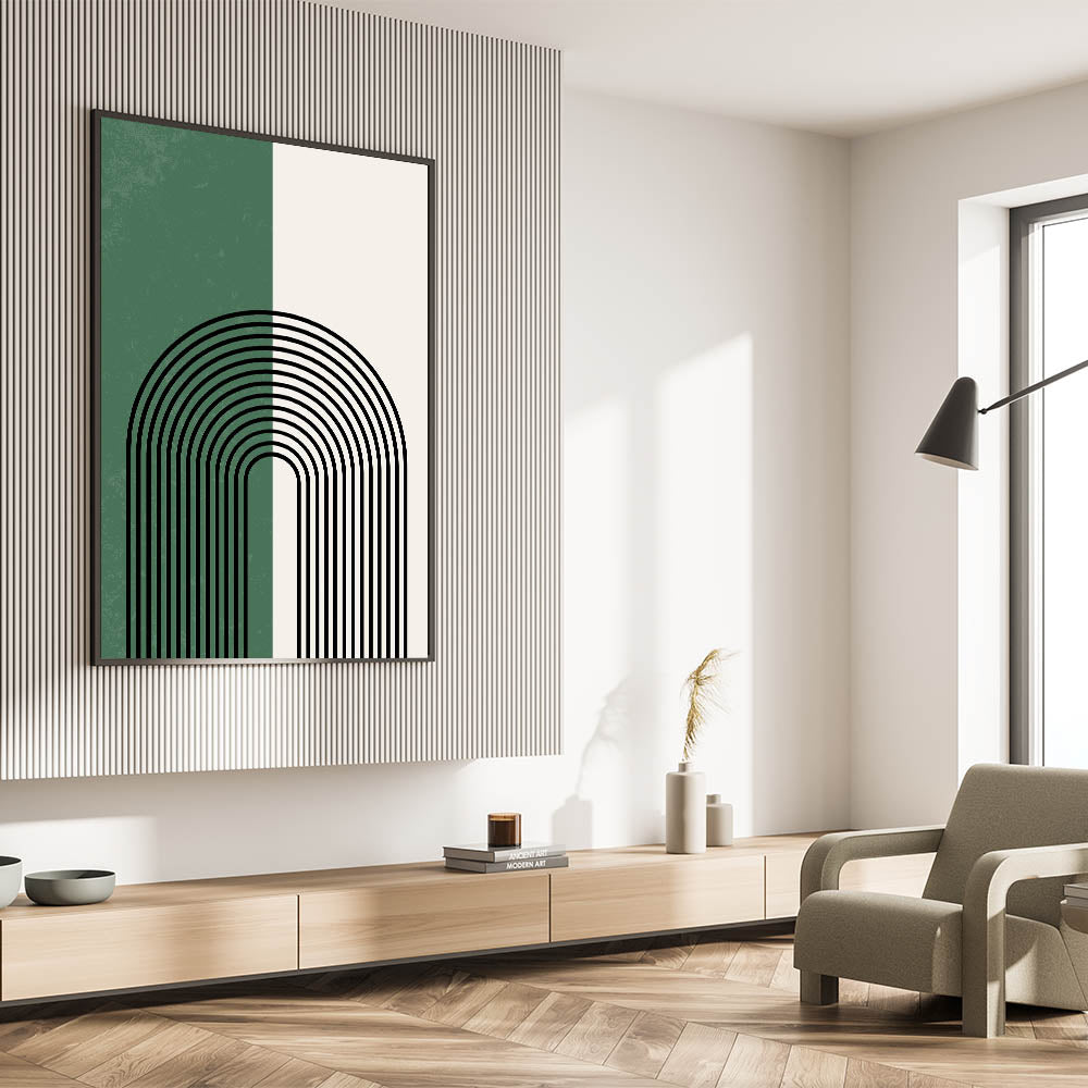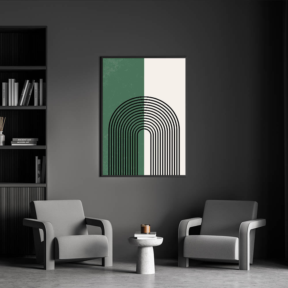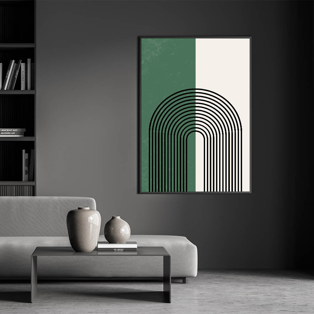 Add a touch of elegance and simplicity to your space with this minimalist arched lines design. The striking contrast between forest green and soft off-white is accentuated by bold black arches, creating a modern and calming visual. Perfect for contemporary and bohemian interiors, this piece brings balance and harmony while making a bold statement.