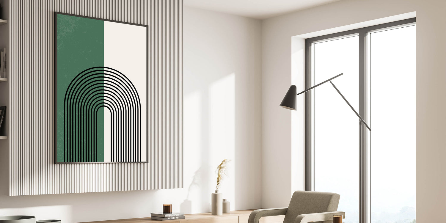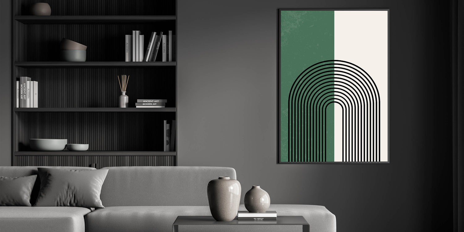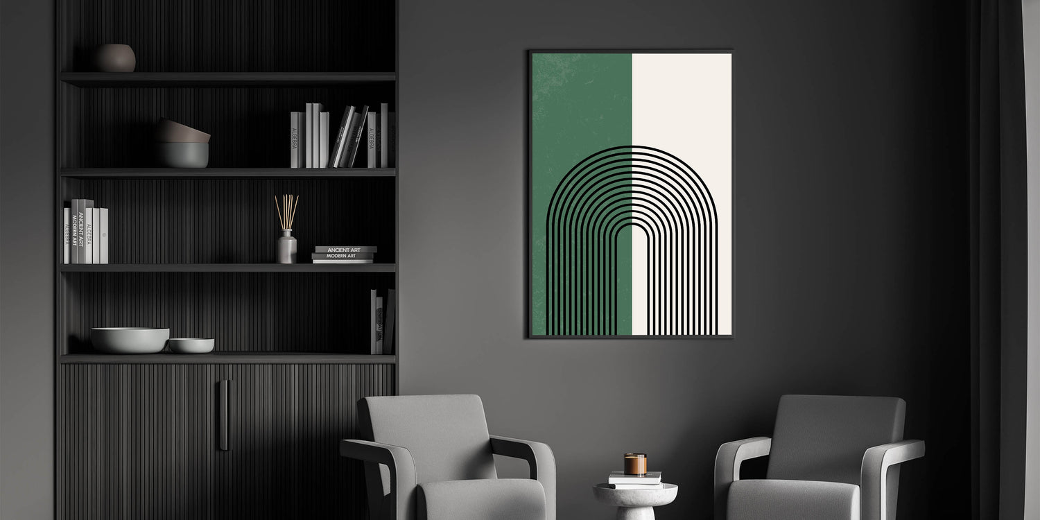 Add a touch of elegance and simplicity to your space with this minimalist arched lines design. The striking contrast between forest green and soft off-white is accentuated by bold black arches, creating a modern and calming visual. Perfect for contemporary and bohemian interiors, this piece brings balance and harmony while making a bold statement.
