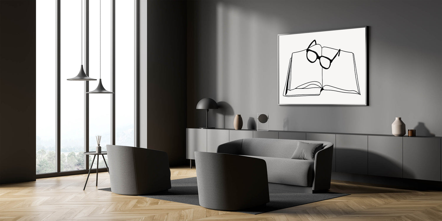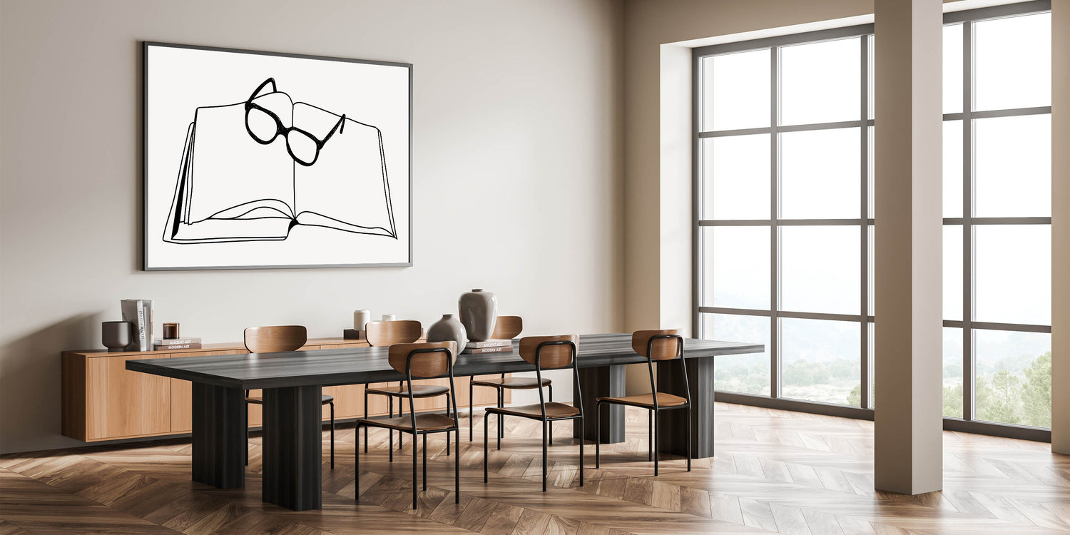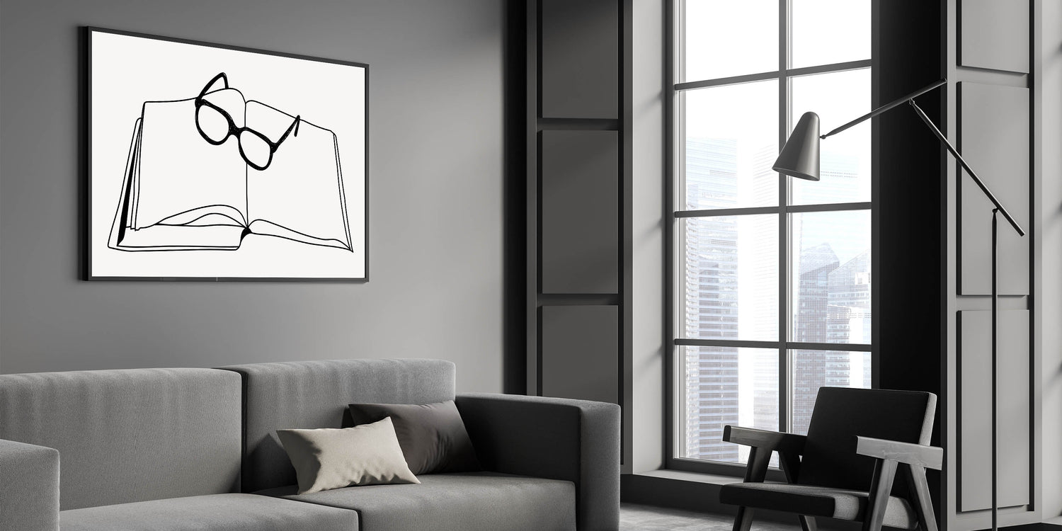 - Unique boho wall decor with a minimalist line drawing of a book and glasses.