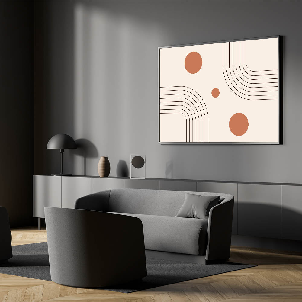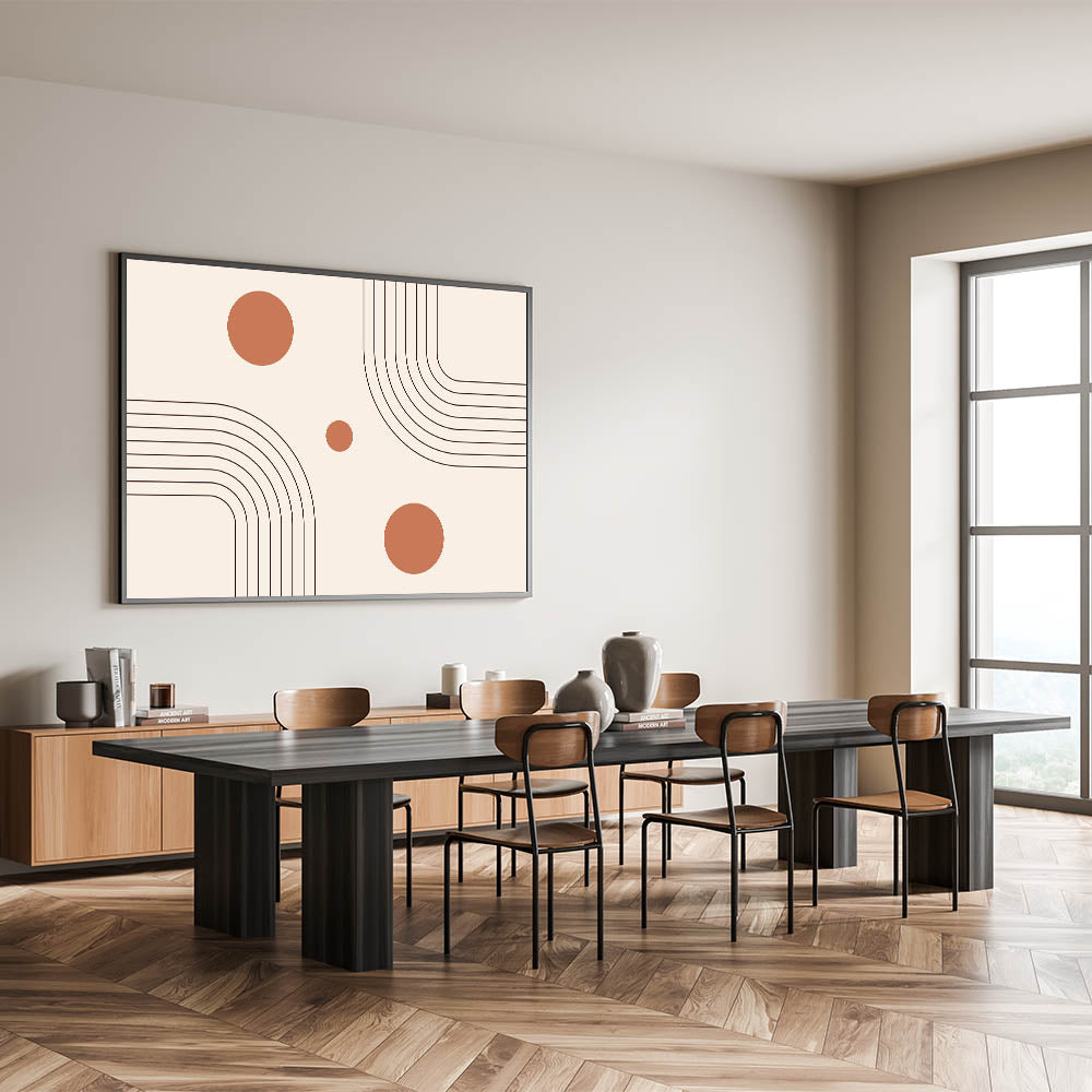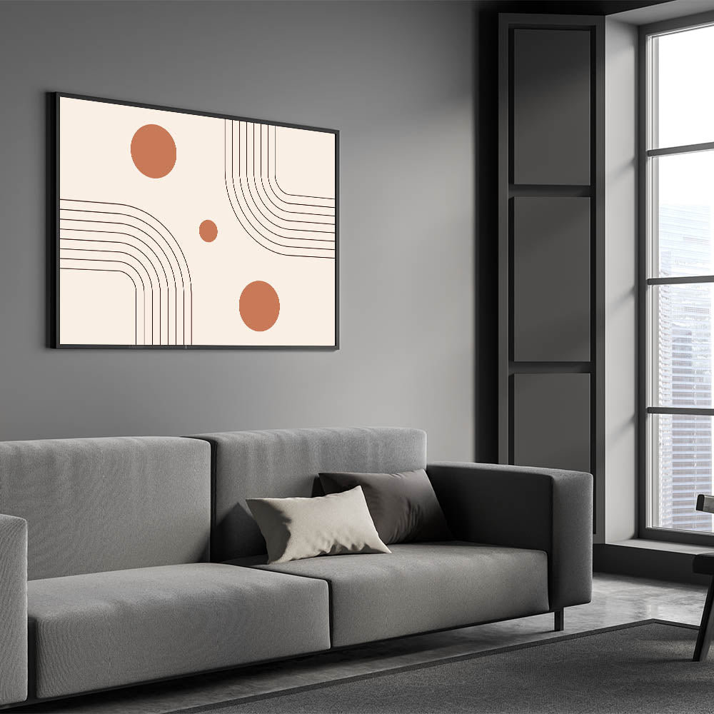 Add a modern and stylish touch to your home with this unique bohemian wall art. Featuring retro-inspired geometric patterns and warm earthy tones, this design offers a perfect blend of minimalism and boldness. The arcs and circles in soothing terracotta hues make this boho decor canvas ideal for creating a cozy and inviting atmosphere in your space. Its elegant yet simple lines give it versatility, making it suitable for any room in the house, from your living room to a home office.