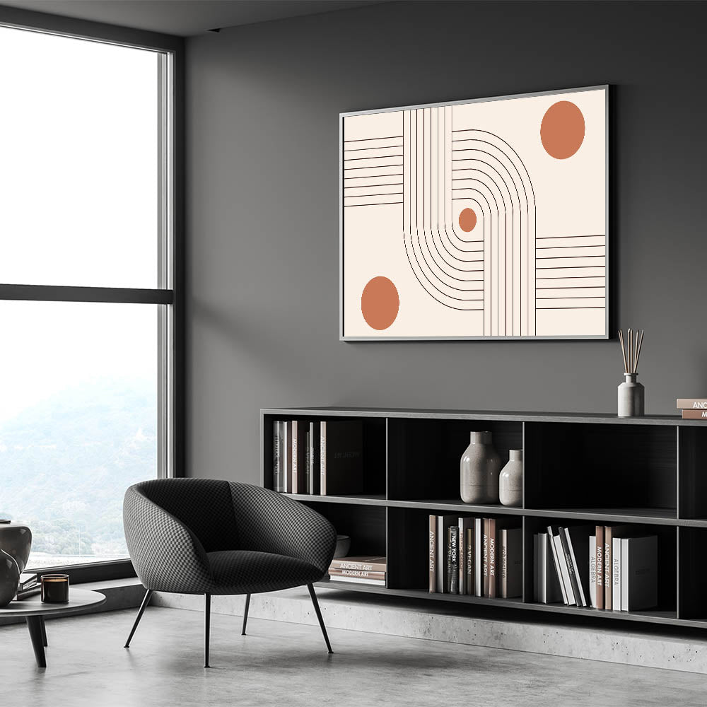 Transform your home with this bohemian wall art, showcasing retro-inspired geometric patterns in warm terracotta tones. This design blends abstract curved lines with earthy circles, adding a touch of elegance and modernism to any room. The clean, minimalist lines paired with warm hues create a unique boho decor canvas that complements both modern and eclectic spaces.