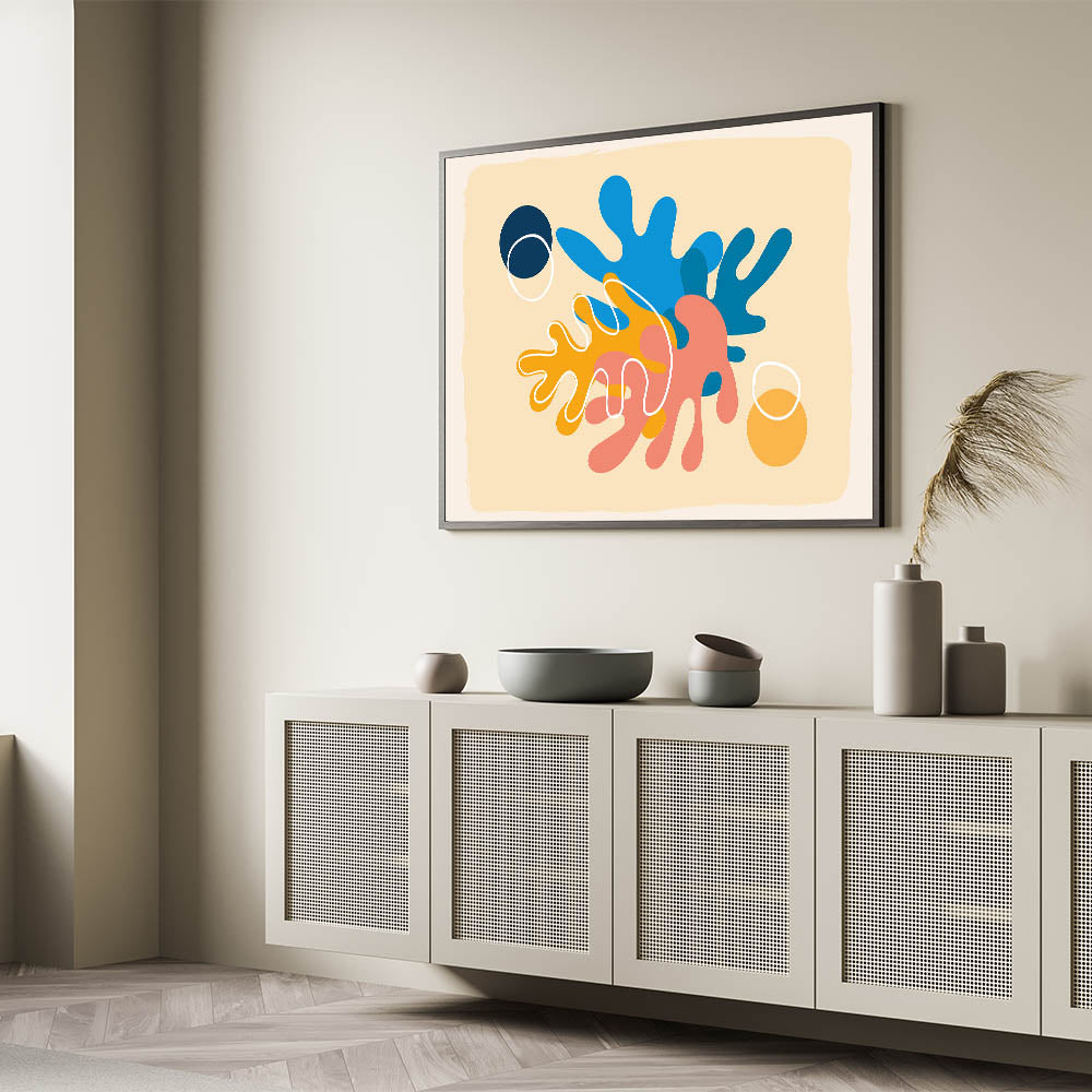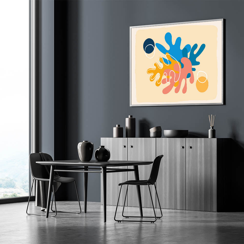Brighten up your space with this playful and vibrant Bohemian wall art featuring abstract organic shapes in bold colors. The dynamic blend of blue, orange, peach, and yellow tones creates an energetic and contemporary look that is perfect for modern, eclectic, and boho interiors. This unique artwork draws inspiration from nature’s fluid forms, making it an ideal addition to living rooms, bedrooms, or creative spaces. Whether you want to create a focal point in your home or add a splash of color, this handcrafted boho-style canvas transforms your space with its eye-catching design.