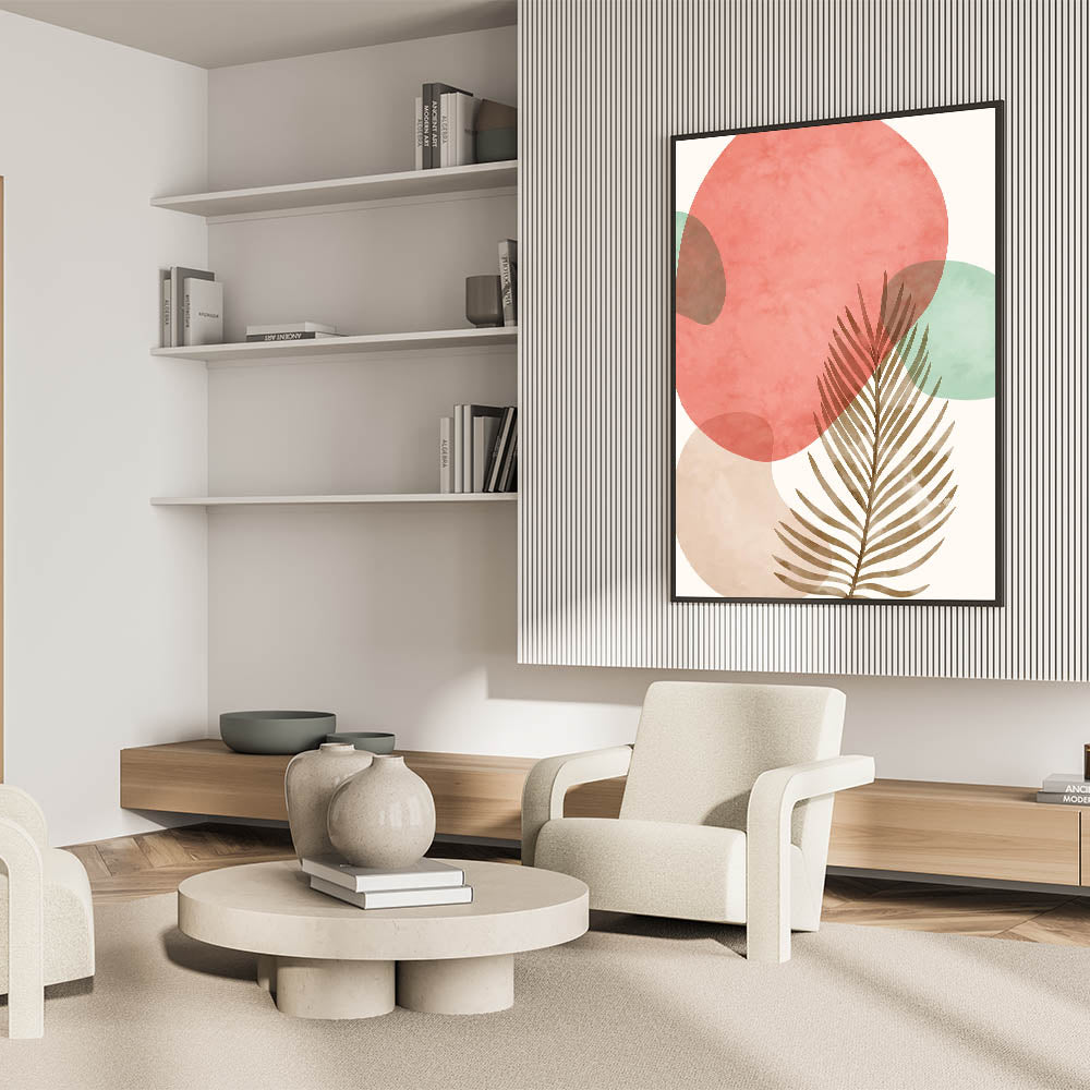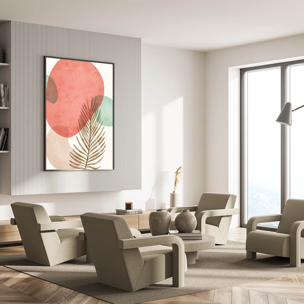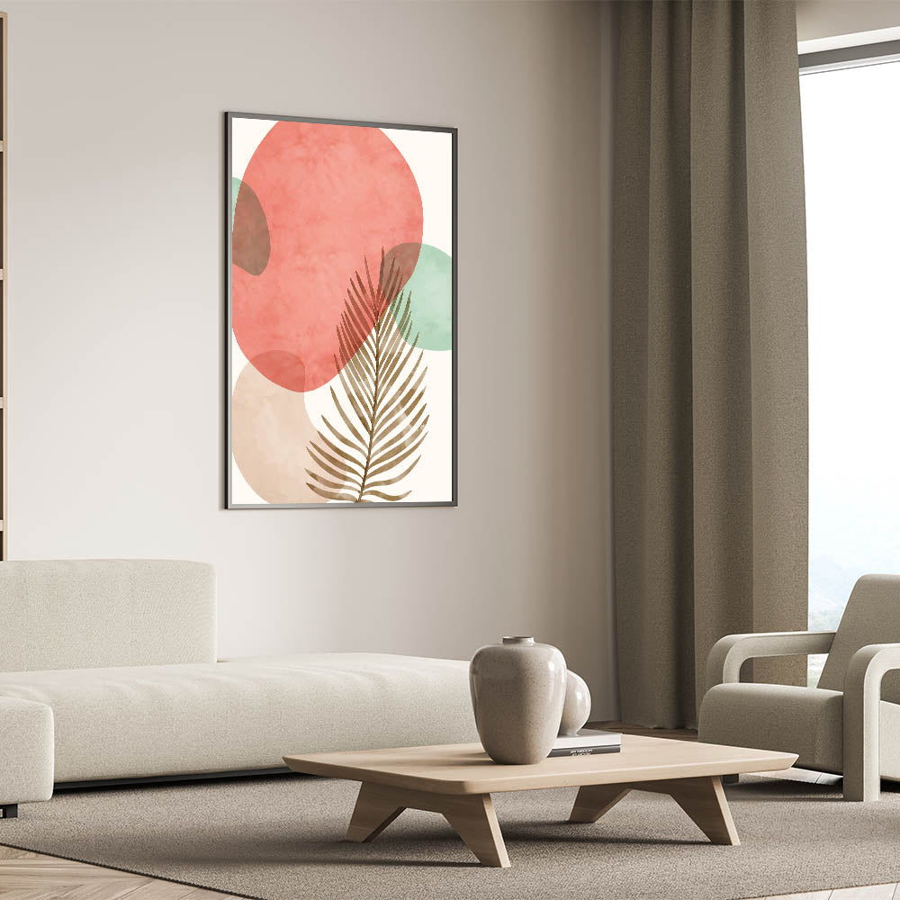 Bring a vibrant, nature-inspired touch to your home with this stunning Bohemian wall art. Featuring bold, abstract shapes in soft coral, mint green, and earthy beige, this piece beautifully combines natural elements like the leaf silhouette with modern, eclectic design. The soft, overlapping forms create a calming yet dynamic aesthetic, making it a perfect addition to any boho chic space.