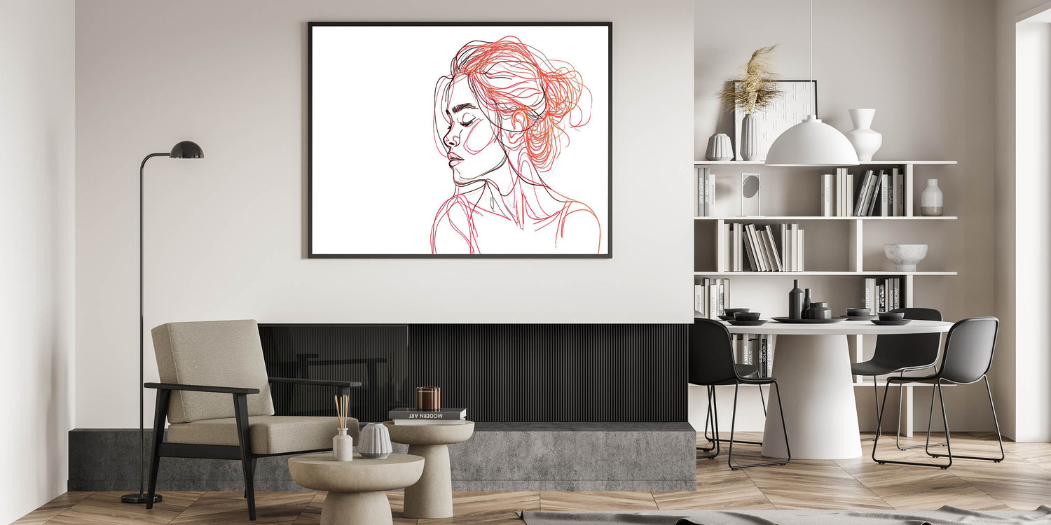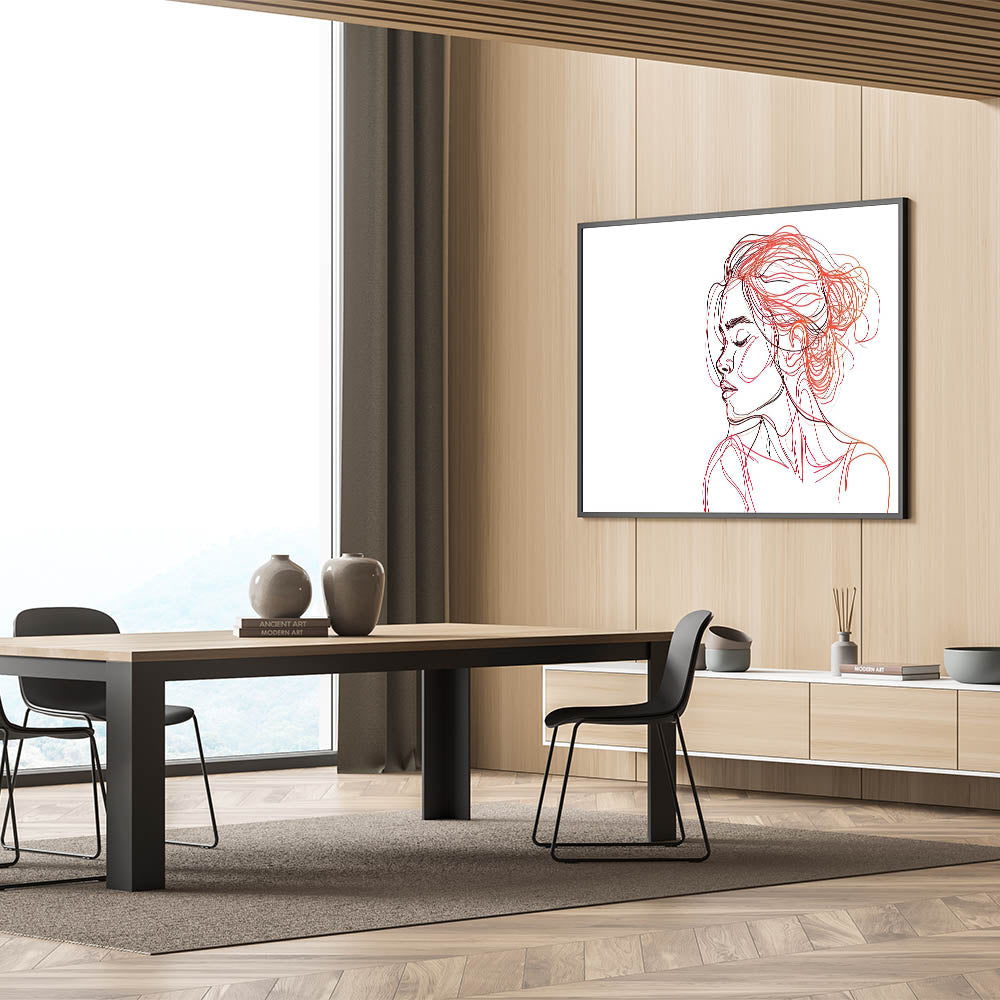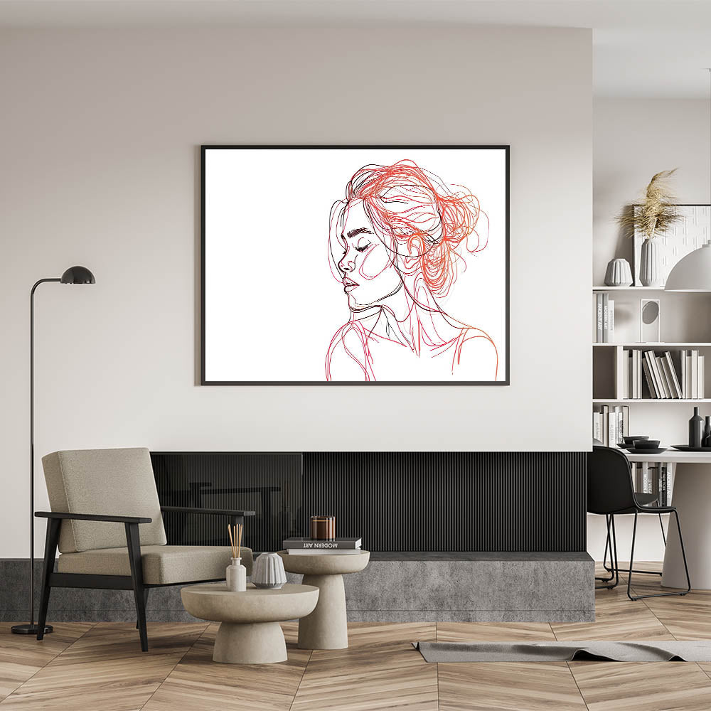 Enhance your home with this captivating bohemian wall art, featuring an elegant line art portrait of a woman in shades of red and black. The delicate, flowing lines capture both beauty and serenity, making this boho decor canvas a perfect statement piece for modern and eclectic interiors. The abstract use of color in the hair and face gives the artwork a sense of motion and depth, creating a striking balance between simplicity and artistic expression.
