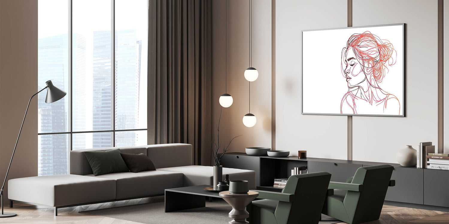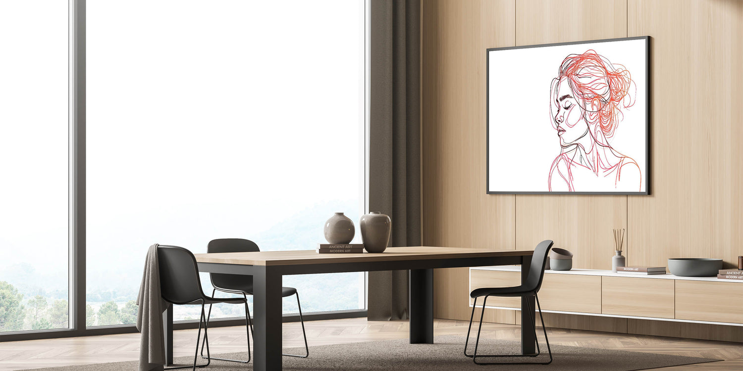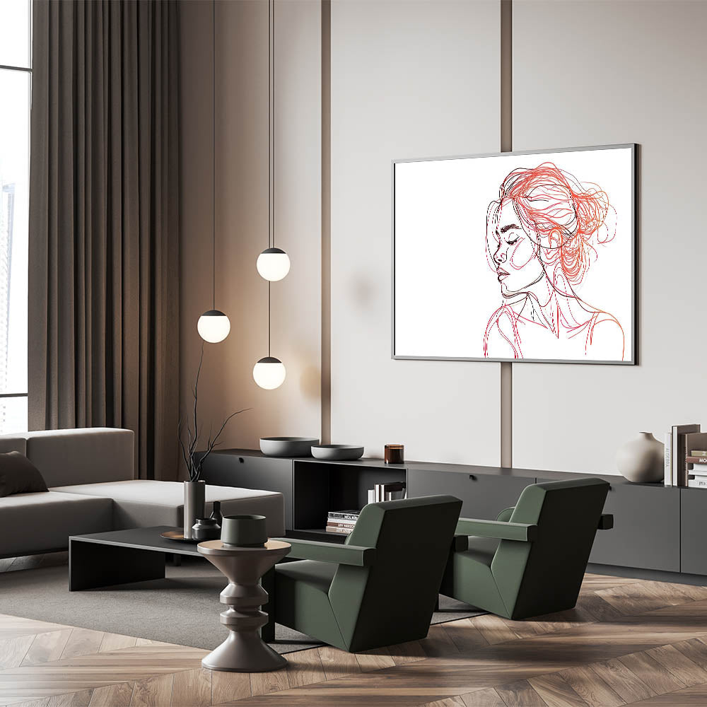 Enhance your home with this captivating bohemian wall art, featuring an elegant line art portrait of a woman in shades of red and black. The delicate, flowing lines capture both beauty and serenity, making this boho decor canvas a perfect statement piece for modern and eclectic interiors. The abstract use of color in the hair and face gives the artwork a sense of motion and depth, creating a striking balance between simplicity and artistic expression.