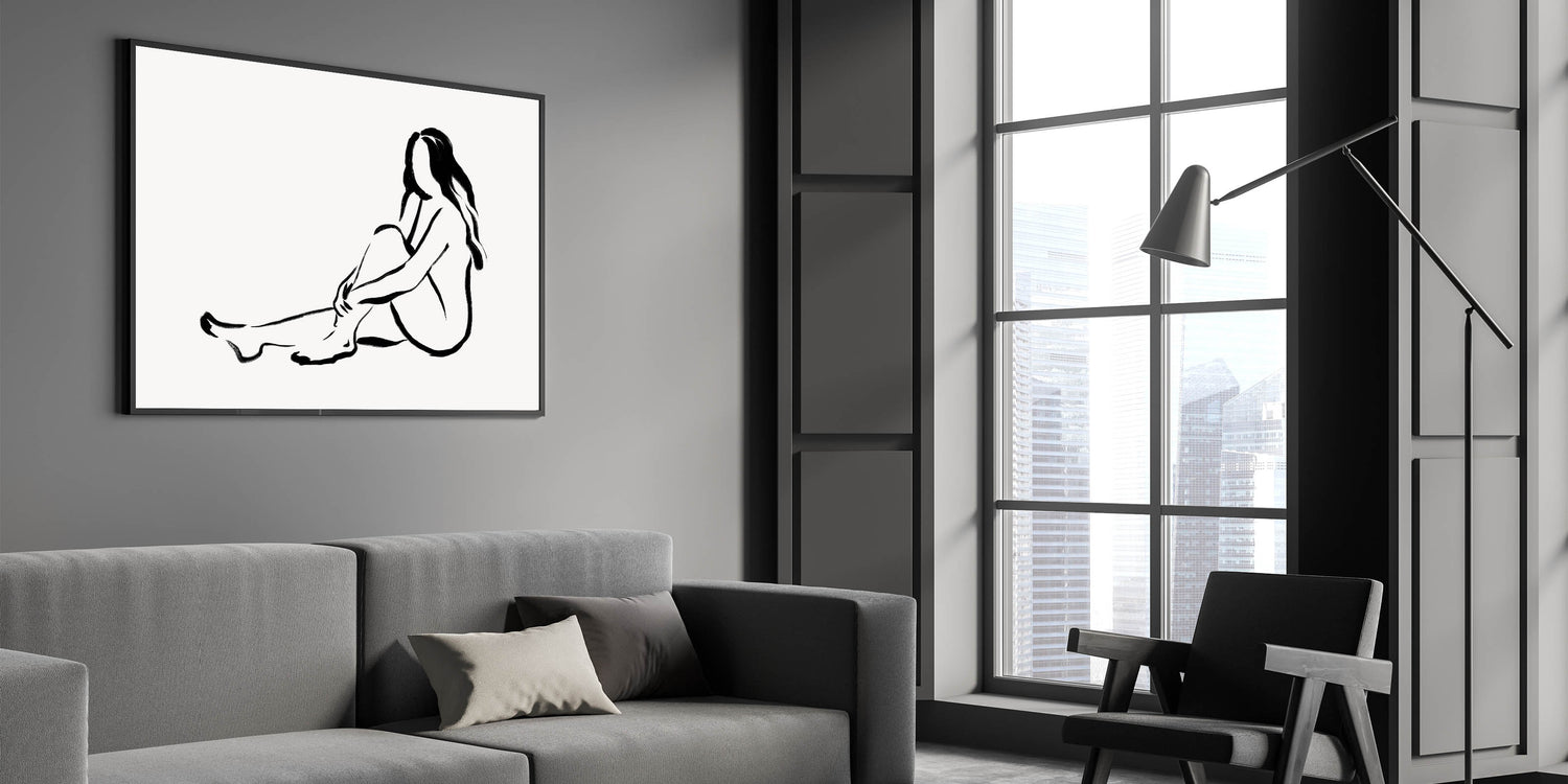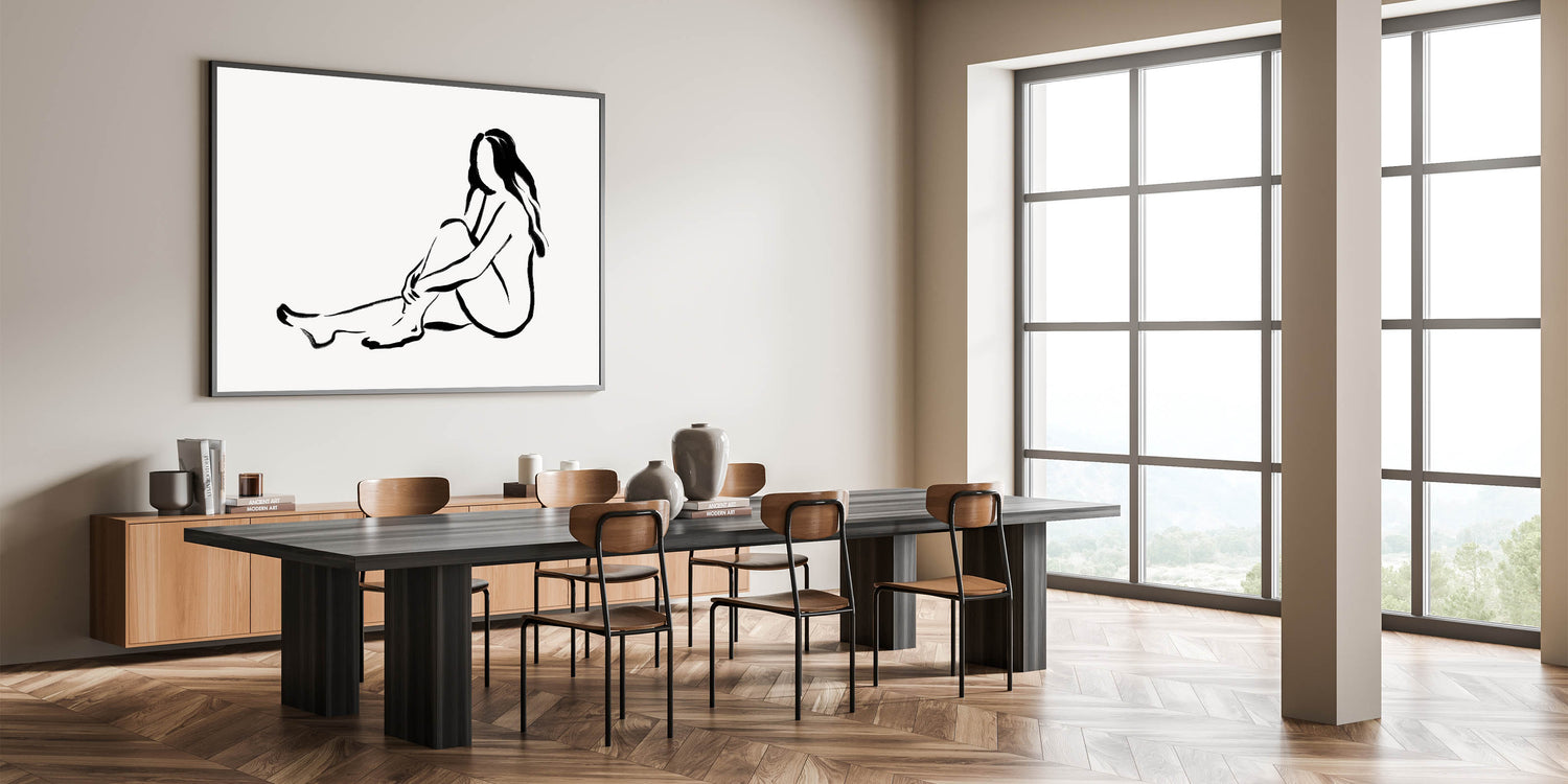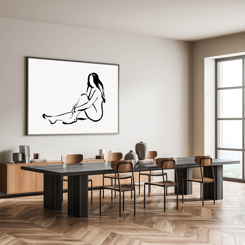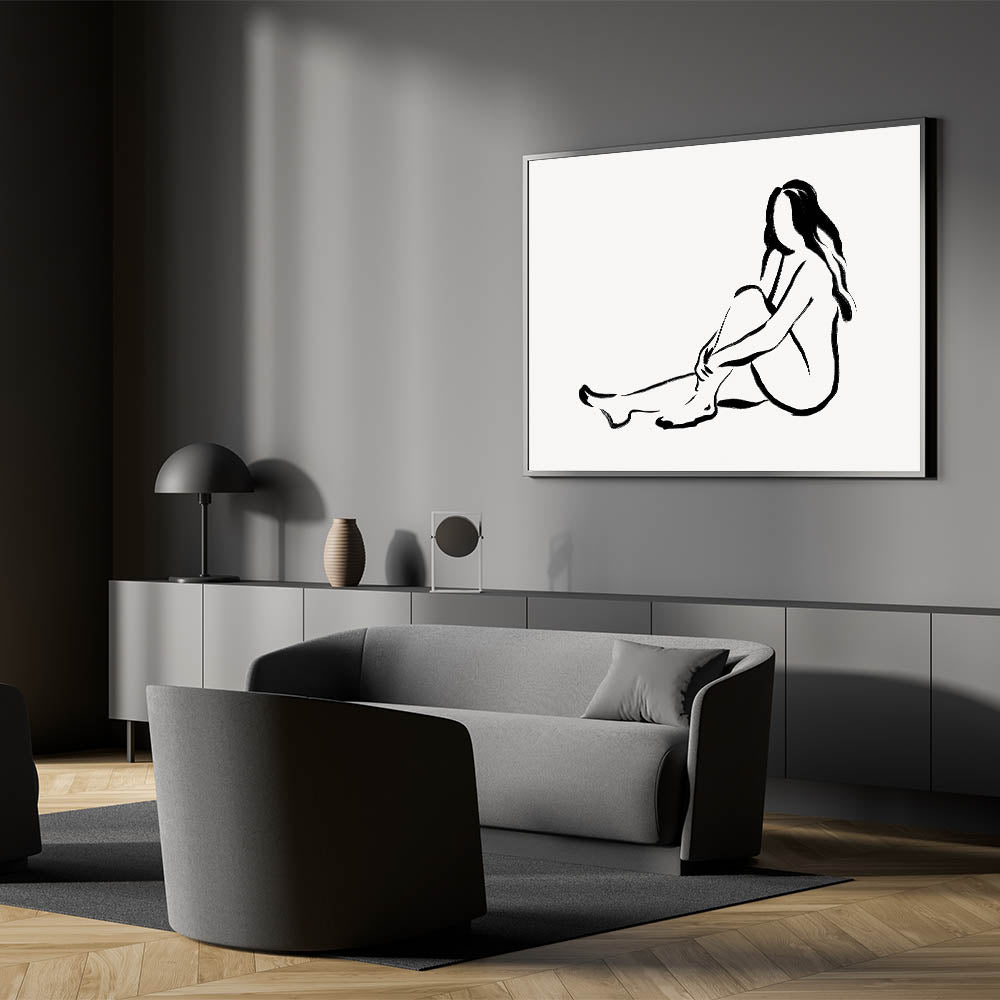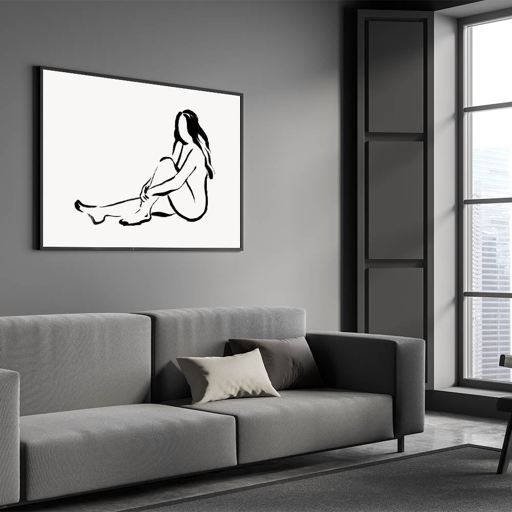 Enhance your space with the elegance of simplicity through this bohemian wall art, featuring a minimalist line drawing of a seated nude figure. The flowing black lines on a soft beige background create a sense of calm and introspection, making this boho chic wall hanging a beautiful and thoughtful addition to any room. The delicate artistry of the figure invites tranquility and sophistication, perfect for modern or eclectic interiors.