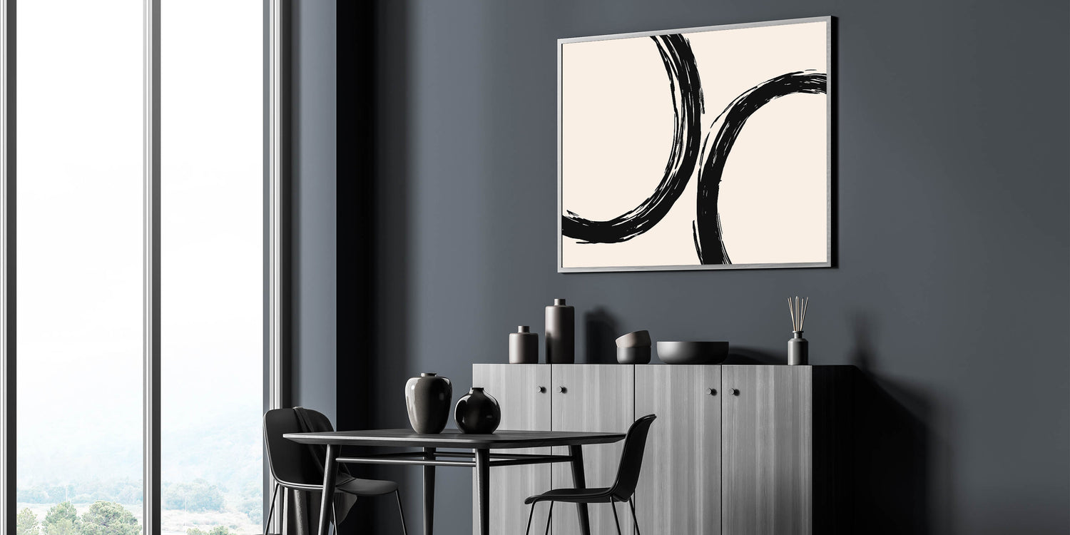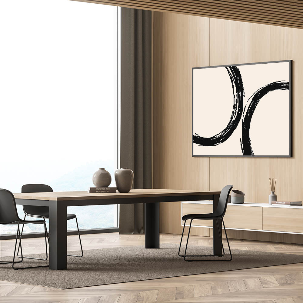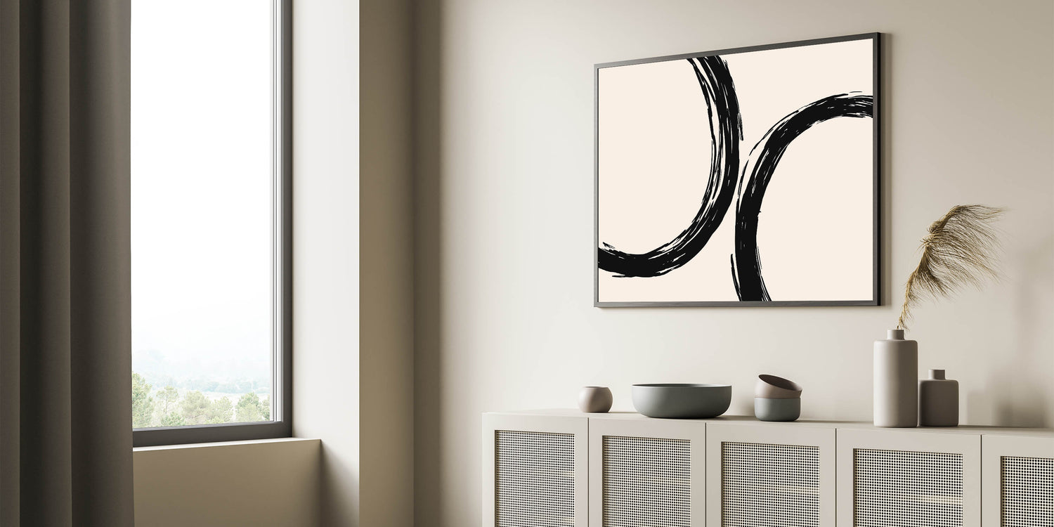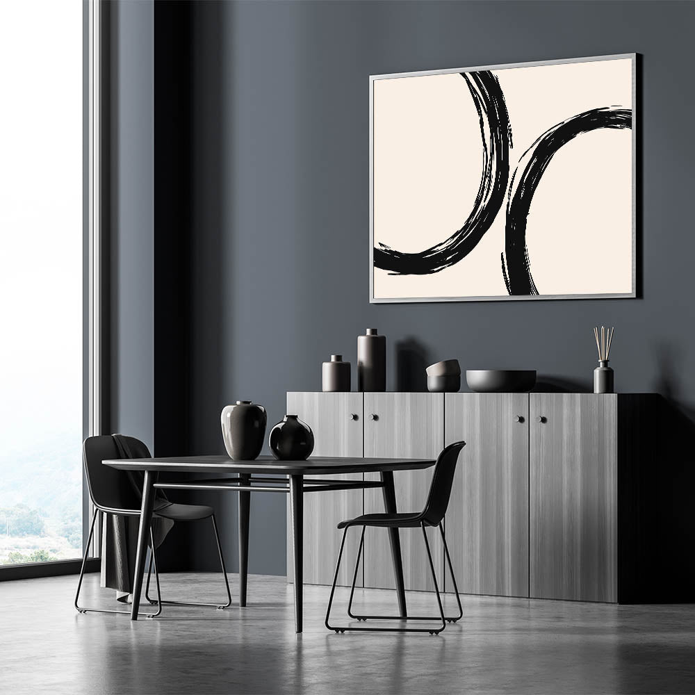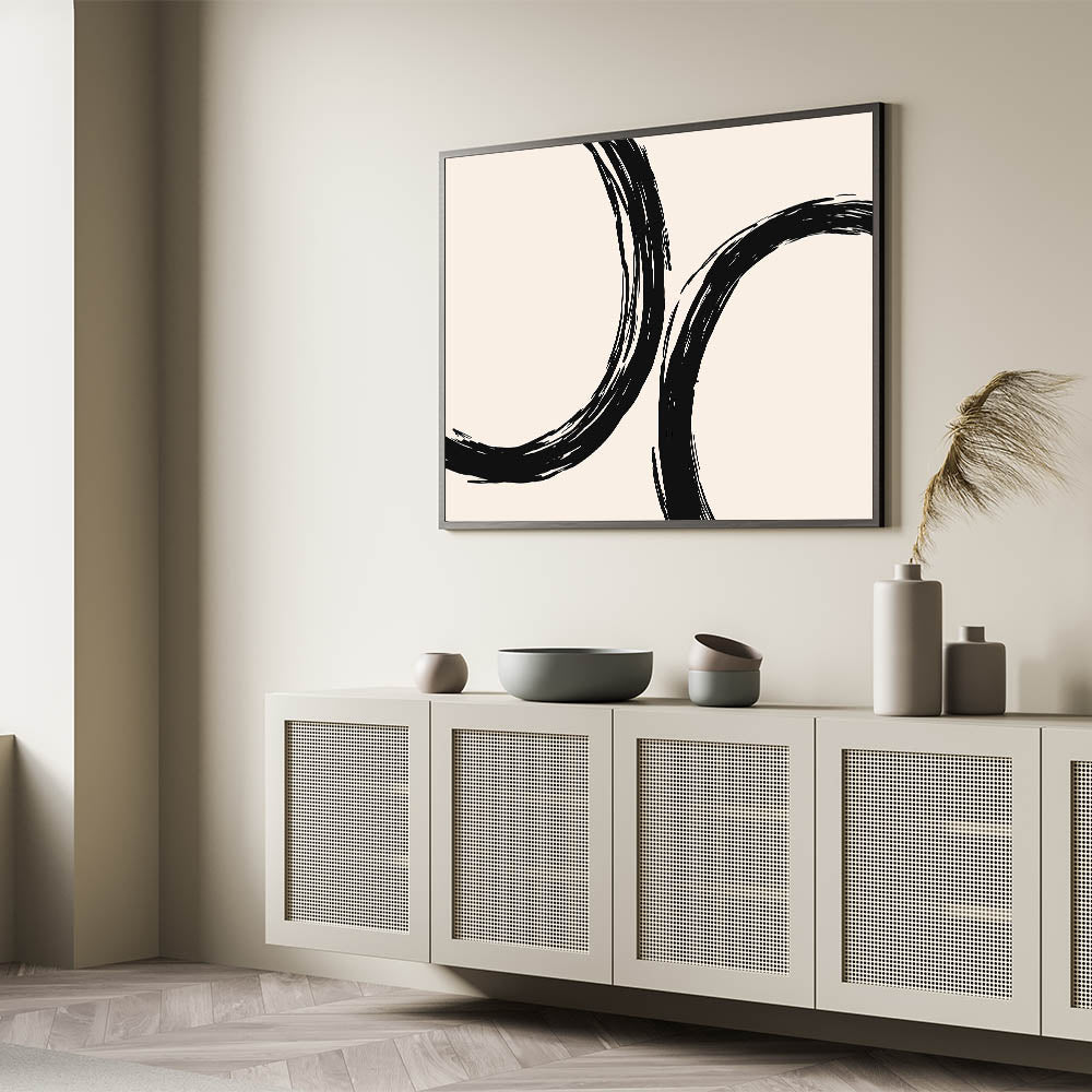 Add a bold, artistic touch to your living space with this bohemian wall art, featuring striking black circular brushstrokes against a soft beige background. The abstract design evokes a sense of flow and movement, making this piece an excellent addition to any boho chic or modern interior. Its minimalist approach combined with an artistic bohemian style makes it perfect for those seeking unique boho decor that elevates their space.