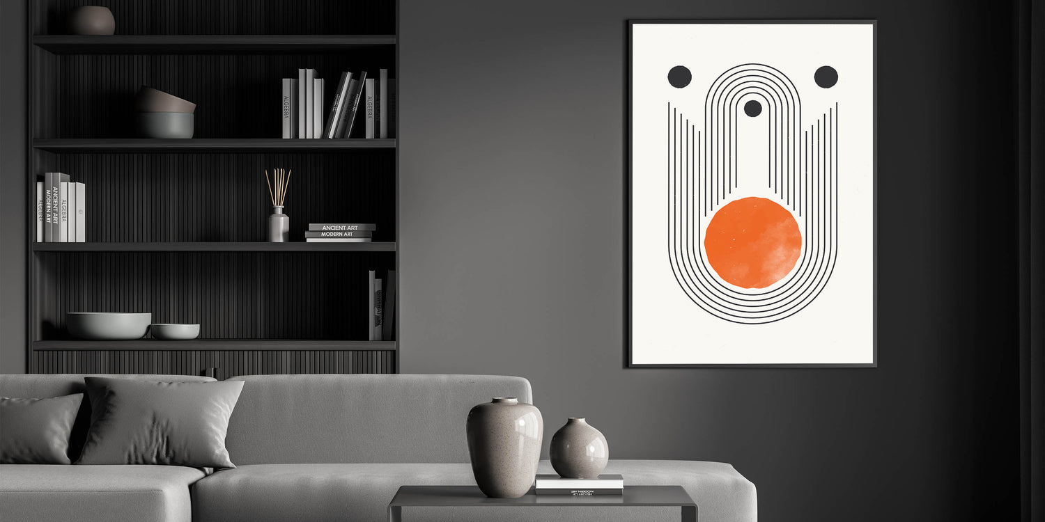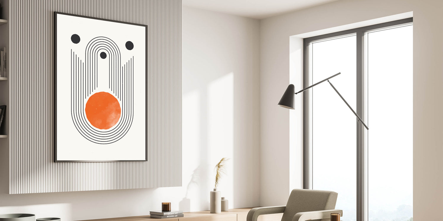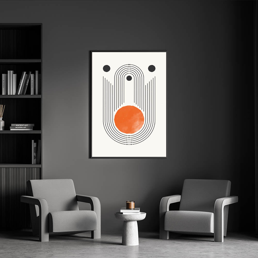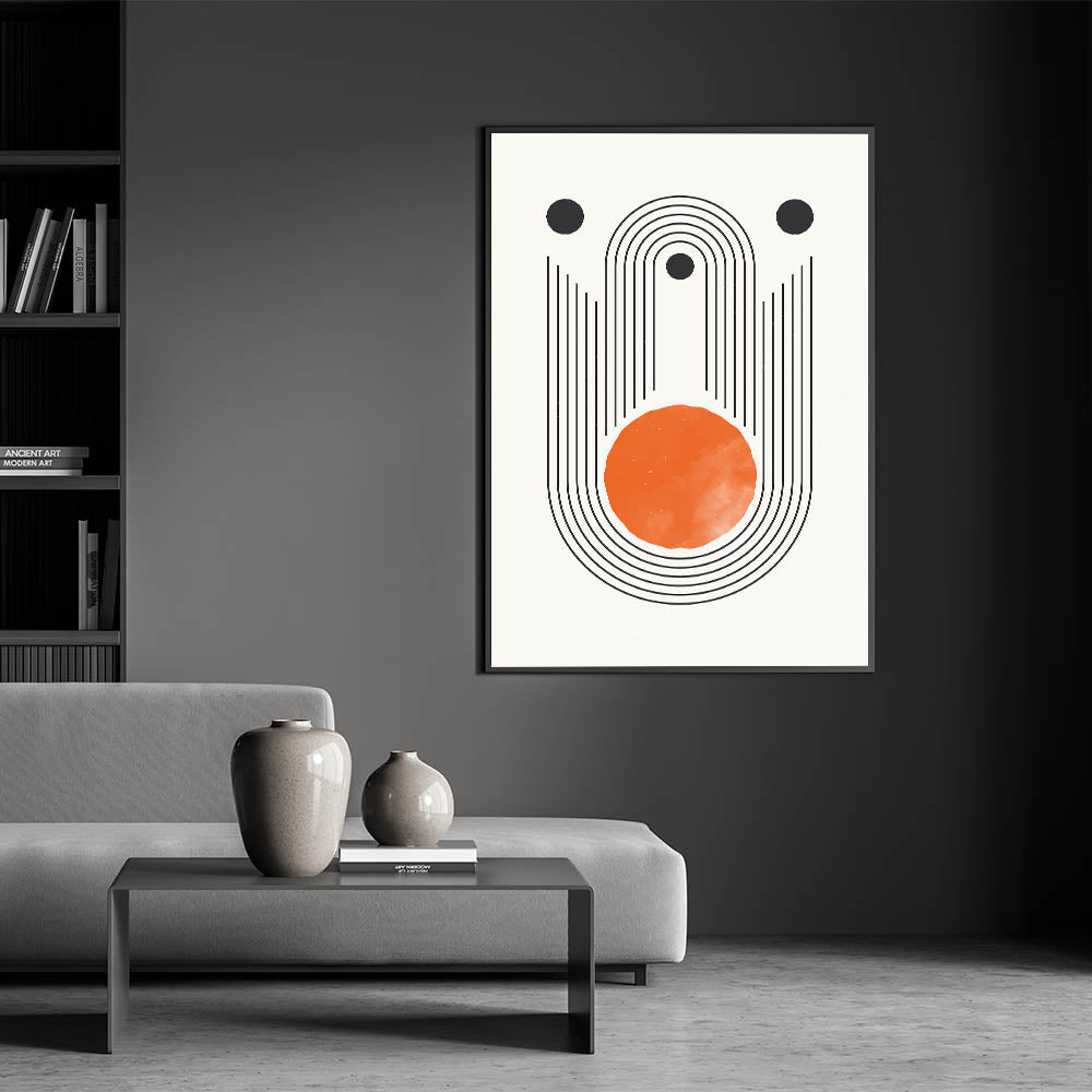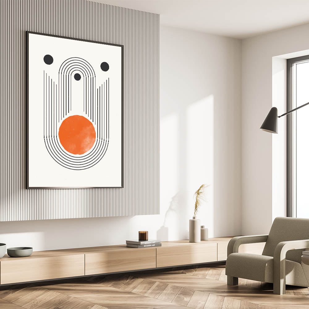 Add a bold, modern statement to your space with this stunning boho geometric wall art. Featuring clean black lines and a vibrant orange circle, this design combines minimalism with a striking color palette. The concentric lines and circular elements create a sense of balance and movement, making it the perfect addition to modern, eclectic, or minimalist interiors. This canvas print is ideal for brightening up living rooms, bedrooms, or creative spaces, offering a blend of artistic expression and contemporary style.