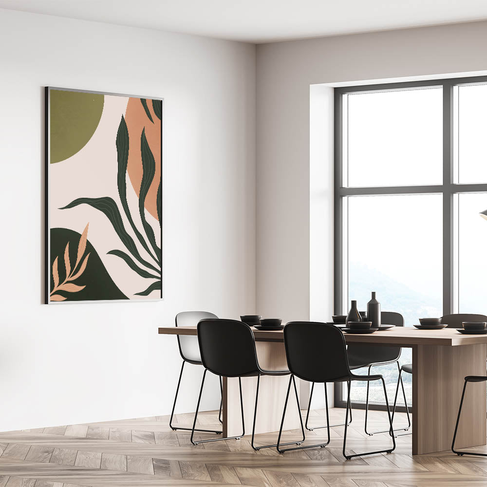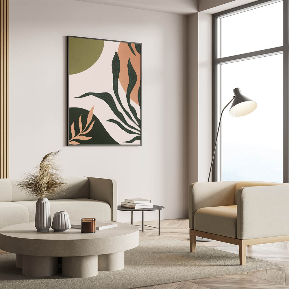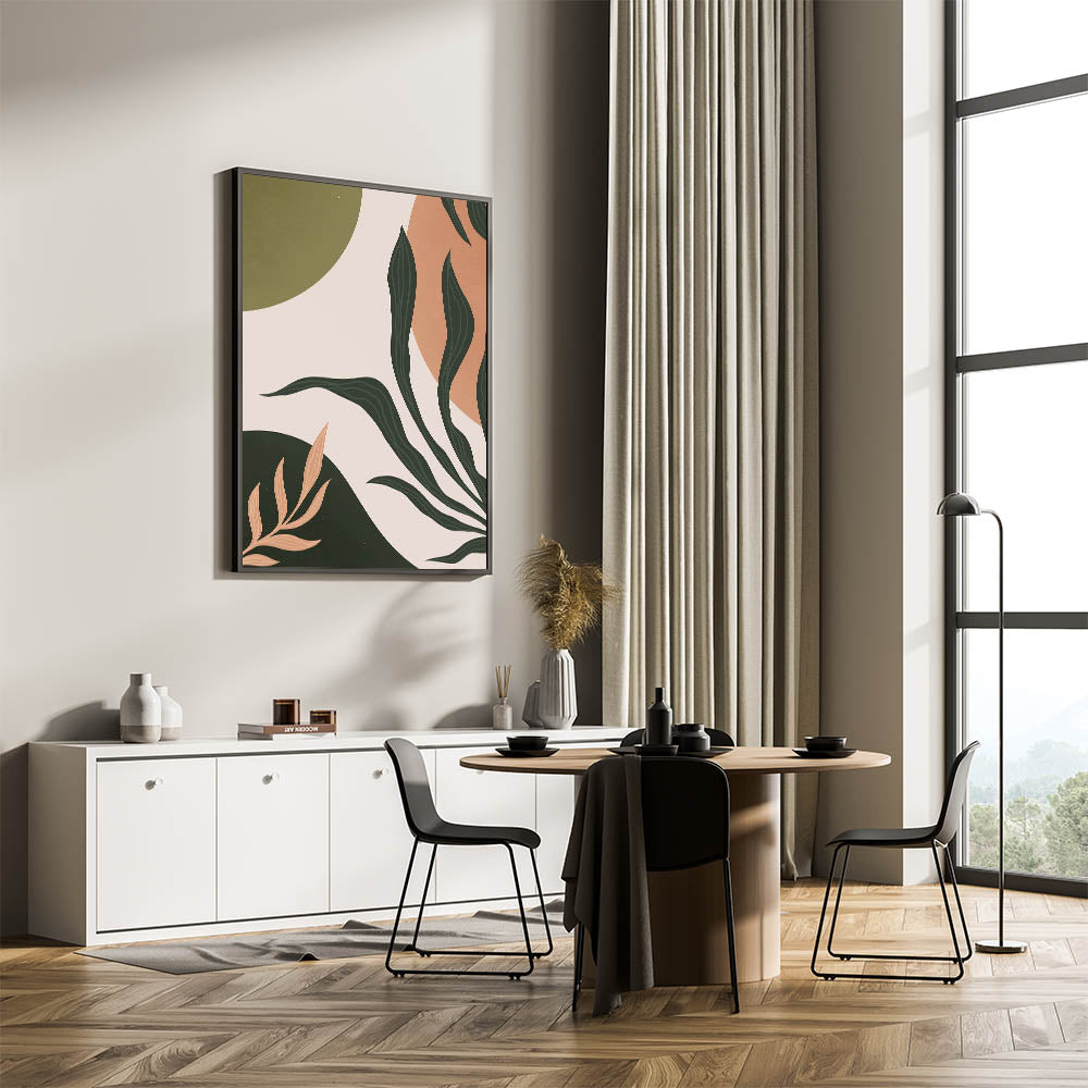 Elevate your interior with this stylish Bohemian nature-inspired wall art featuring a perfect balance of earthy tones, green, and soft peach hues. The abstract botanical design, with flowing leaves and organic shapes, brings a sense of calm and natural beauty to your home. Perfect for adding a touch of greenery without the maintenance, this artwork is ideal for modern, eclectic, or bohemian-themed spaces.
