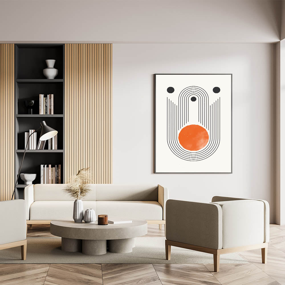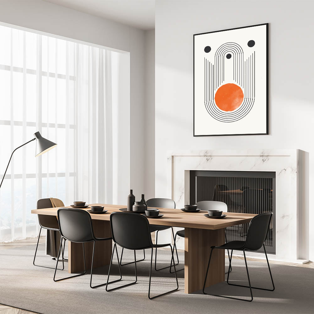 Introduce a modern, geometric element to your decor with this striking Boho wall art. Featuring a series of bold black lines forming an abstract arch, accented with a vibrant orange circle and minimalist black dots, this design brings a contemporary edge to bohemian style. Its clean, minimal aesthetic is perfect for those who appreciate simplicity with a bold touch.