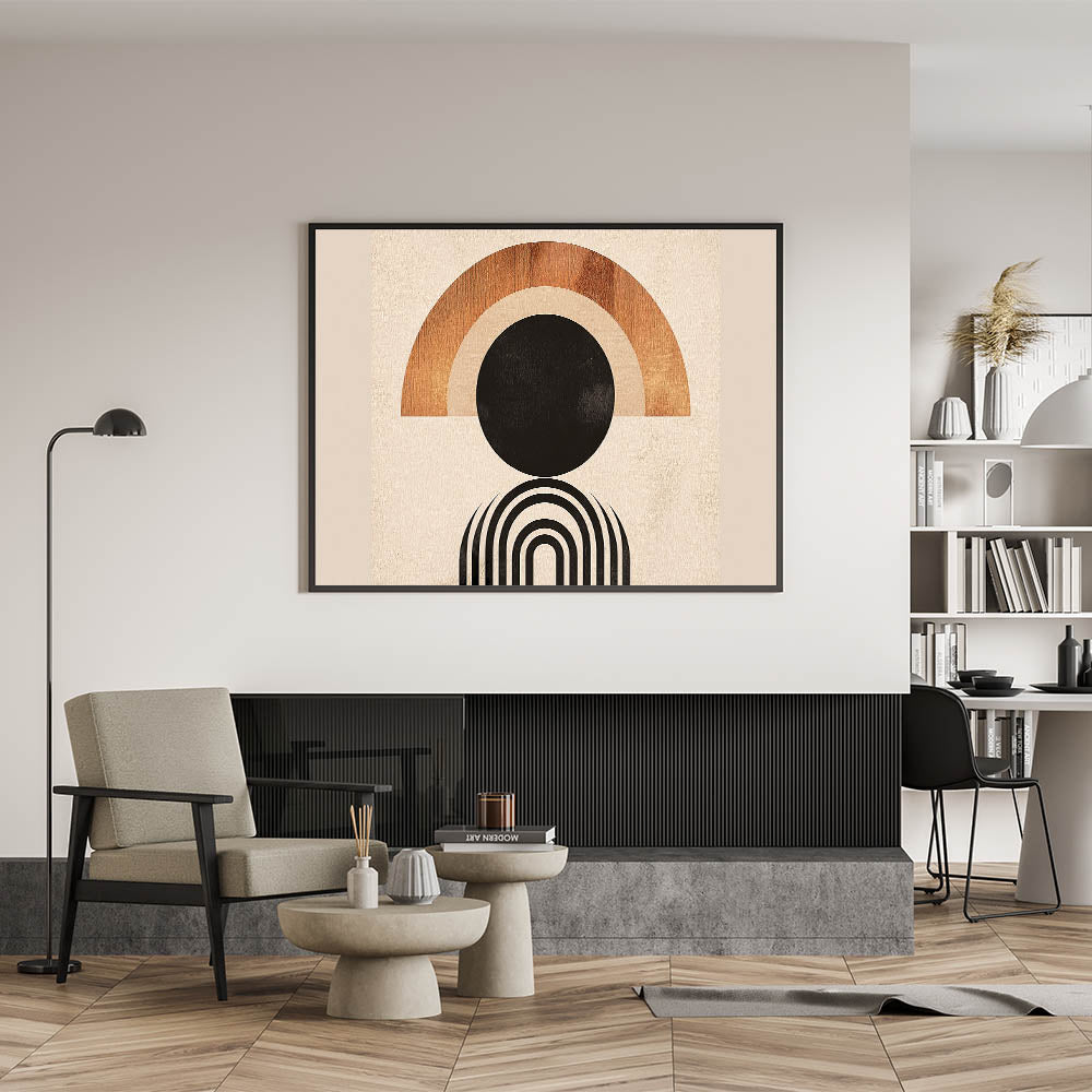 Elevate your living space with this striking bohemian wall art, featuring a bold geometric design with a black circle and layered arches in warm, earthy tones. The minimalistic use of arches and lines draws attention to the central black circle, creating a visually captivating and balanced composition. This boho decor canvas is perfect for those who appreciate modern, abstract art with a touch of elegance and structure.